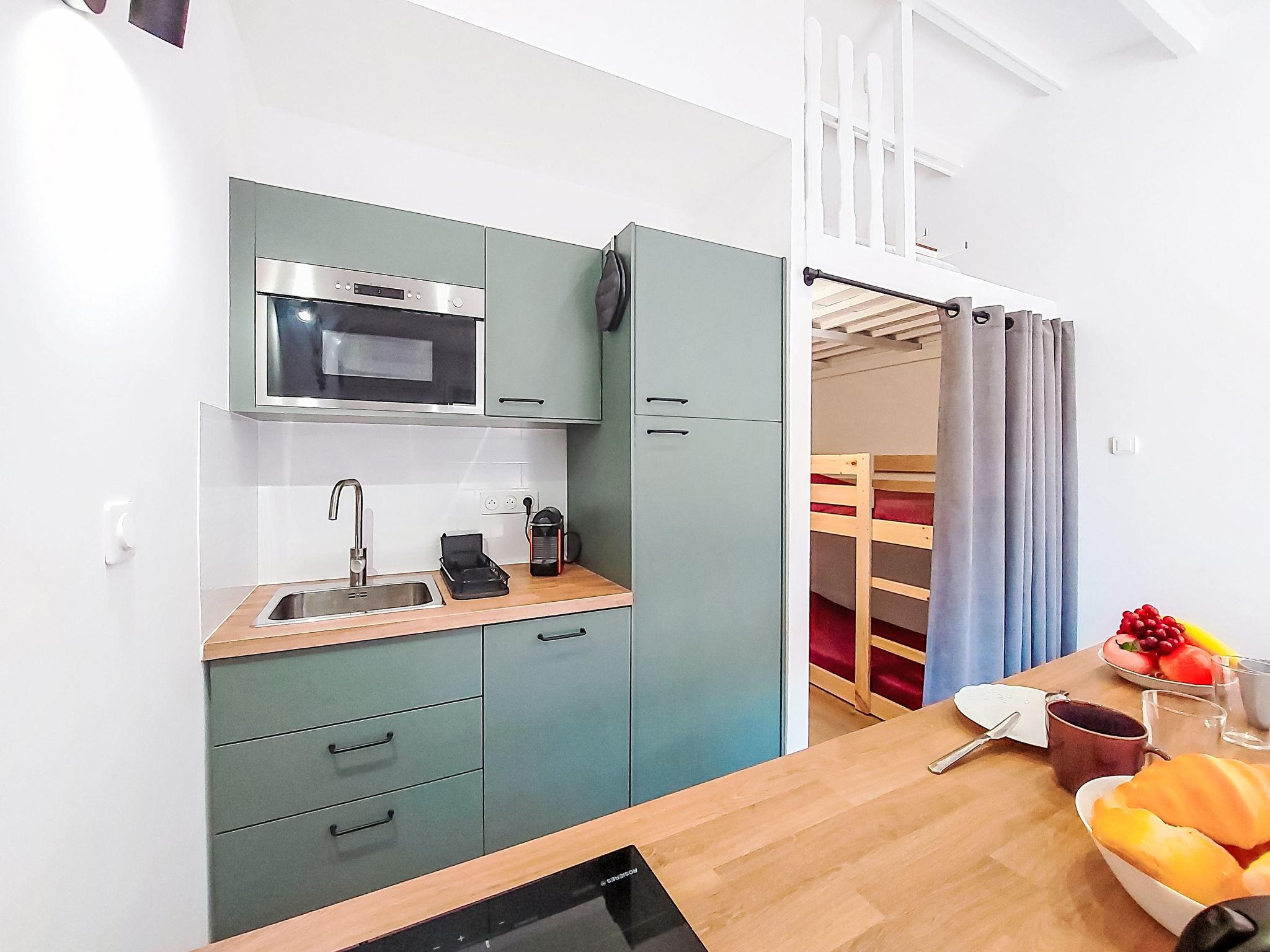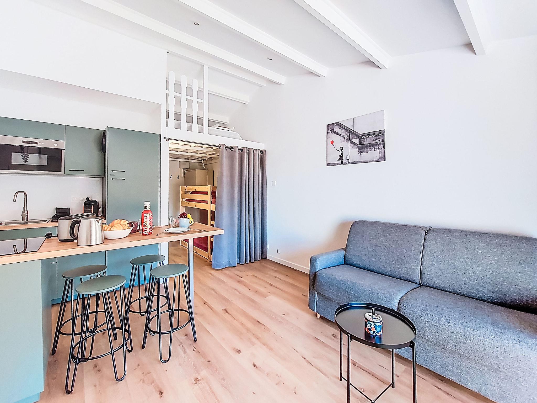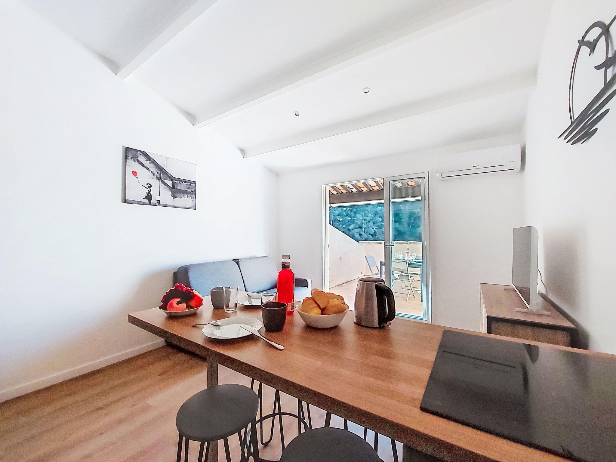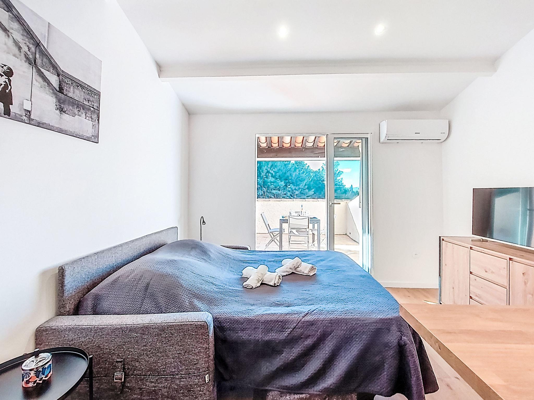 1-room studio 28 m2 on 2nd floor. Renovated in 2025, comfortable and beautiful furnishings: entrance hall, without window with 1 x 2 bunk beds (80 cm, length 190 cm). Living/dining room with 1 double sofabed (140 cm, length 190 cm), TV (flat screen). Exit to the terrace. Kitchenette (dishwasher, 4 induction hot plates, toaster, kettle, microwave, electric coffee machine, Capsules for coffee machine (Nespresso) extra). Shower/WC. Air-conditioning, forced-air heating. Large terrace 15 m2 partly roofed, west facing position. Terrace furniture. Distant view of the sea. Facilities: washing machine. Internet (WiFi, extra). Parking space n 816 (1 car). Please note: TV only FR. Smoke alarm. Offer by a private individual according to Art. 155, IV of CGI. 83112001849LR
