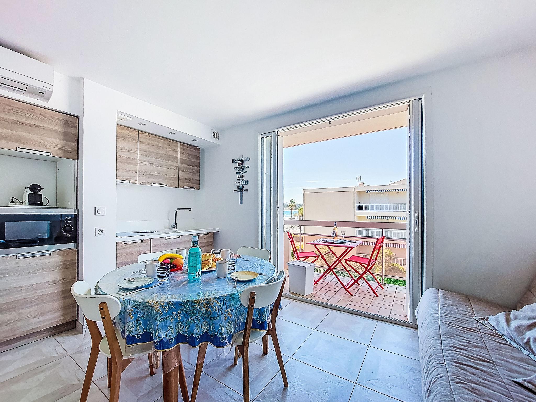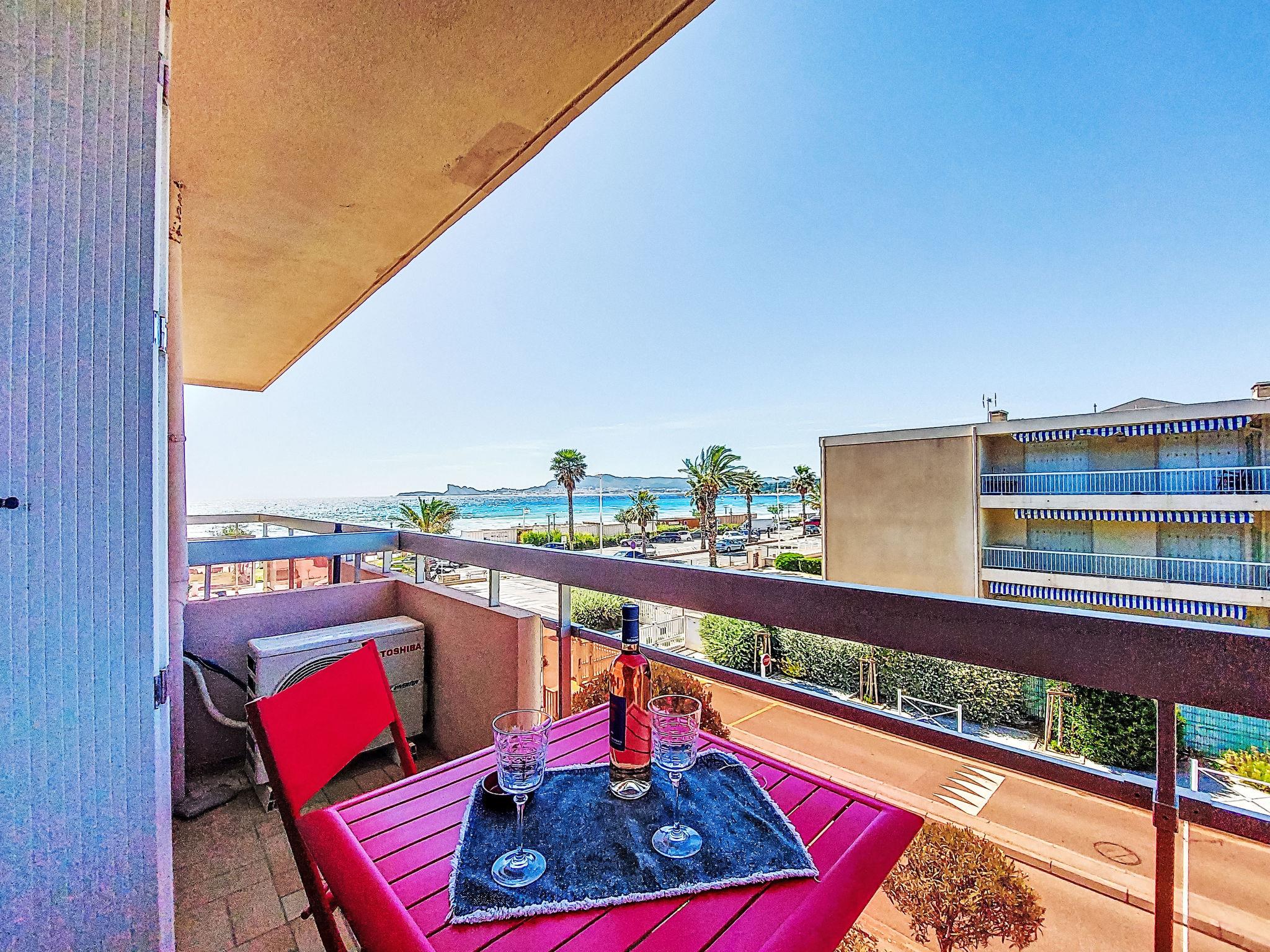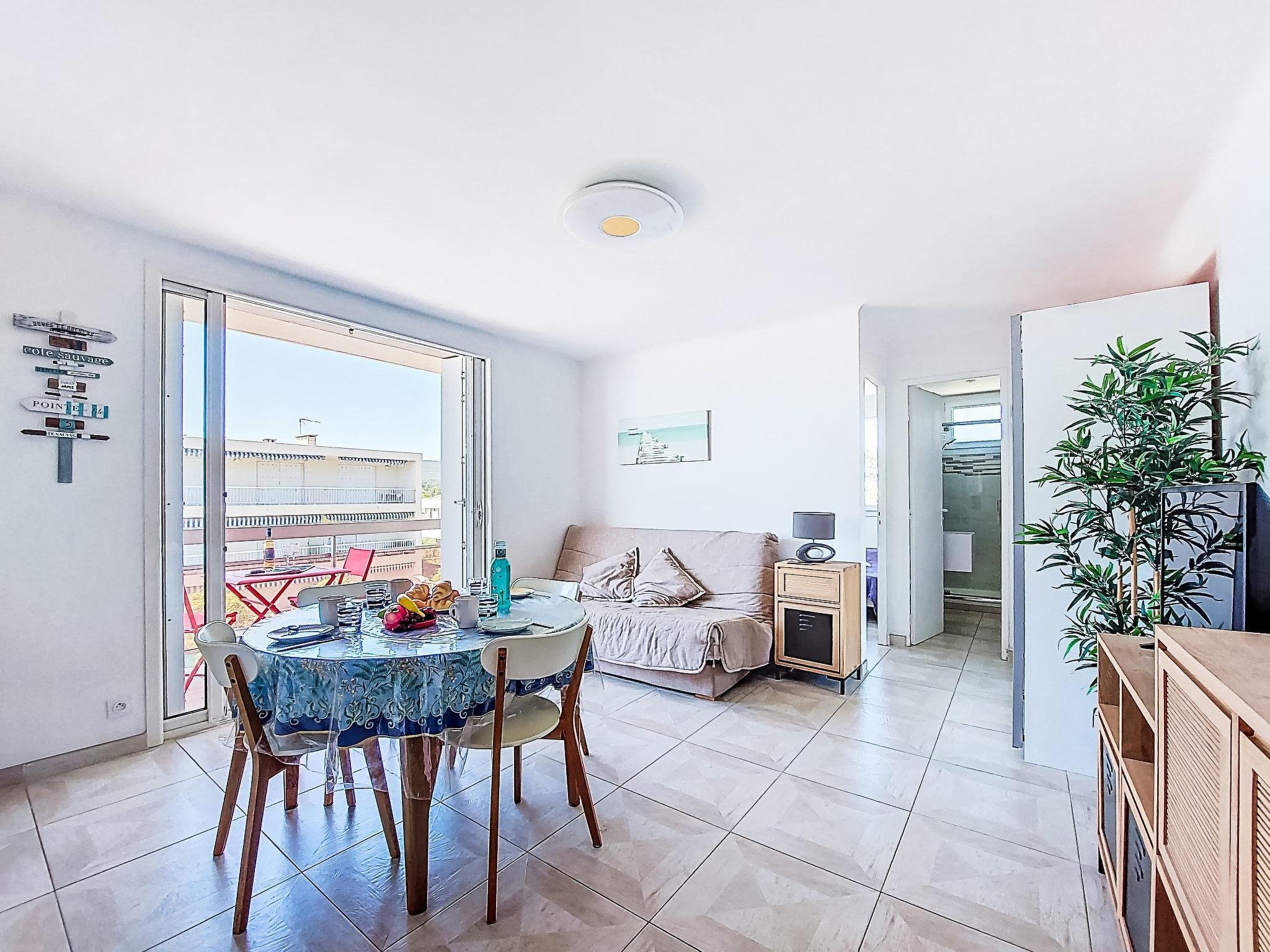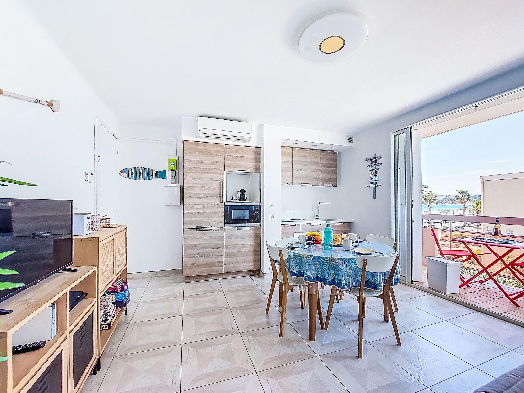 2-room apartment 45 m2 on 2nd floor. Bright, comfortable and beautiful furnishings: living/dining room with 1 double sofabed (140 cm, length 190 cm), TV (flat screen), air conditioning. Exit to the terrace. 1 room with 2 beds (90 cm, length 190 cm). Kitchenette (dishwasher, 2 induction hot plates, toaster, kettle, microwave, electric coffee machine, Capsules for coffee machine (Nespresso + Filtre)). Shower/WC. Forced-air heating. Terrace 5 m2, roofed, north-west facing position. Terrace furniture, electric barbecue. Side view of the sea. Facilities: washing machine. Internet (WiFi, free). Parking space n 11. Please note: TV only FR. Smoke alarm. Offer by a private individual according to Art. 155, IV of CGI. 83112 001748 6S
