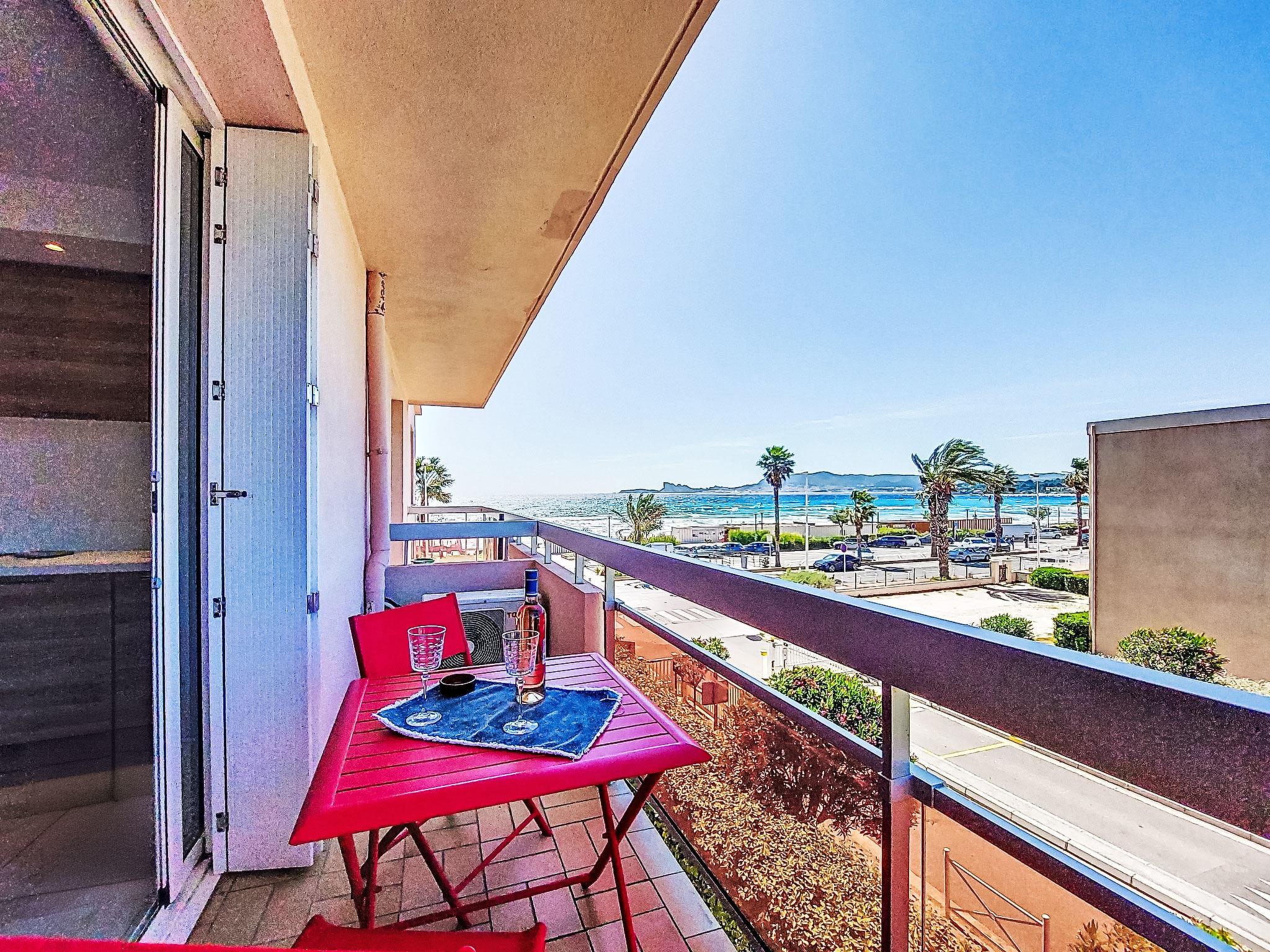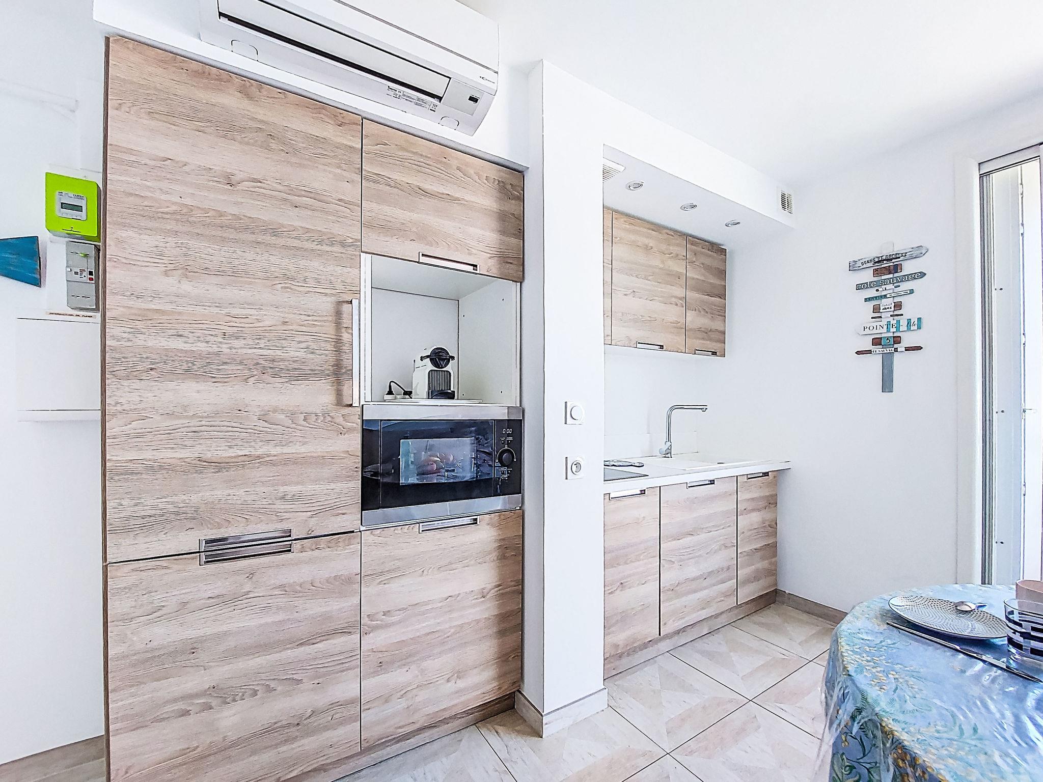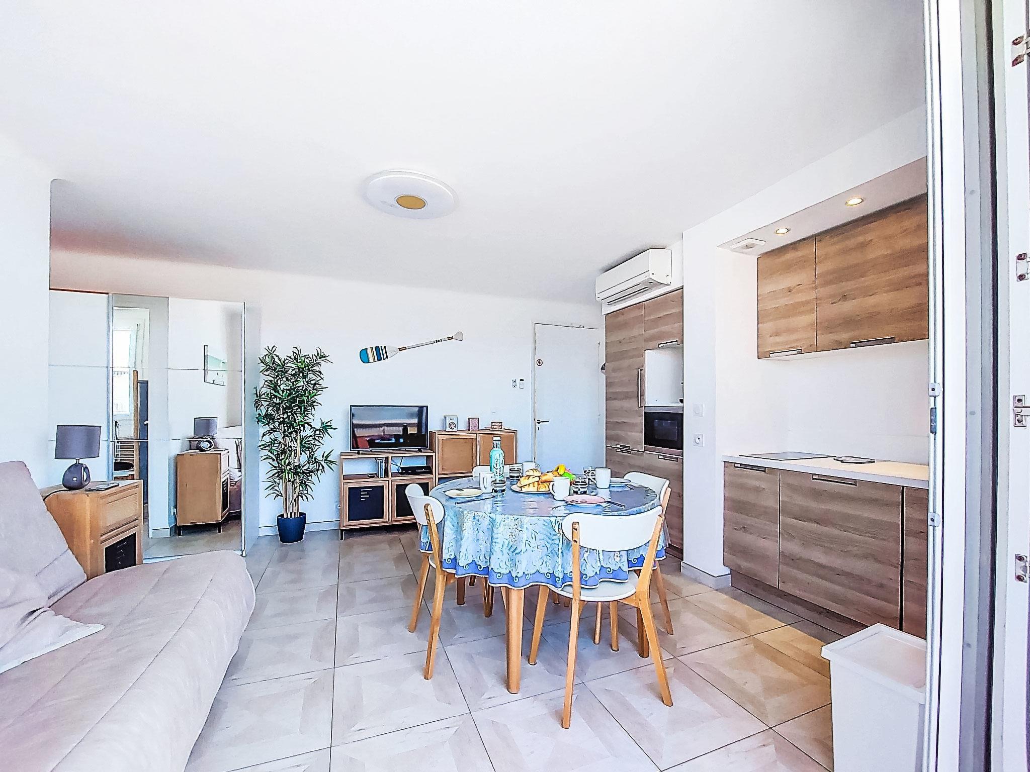 2-room apartment 45 m2 on 2nd floor. Bright, comfortable and beautiful furnishings: living/dining room with 1 double sofabed (140 cm, length 190 cm), TV (flat screen), air conditioning. Exit to the terrace. 1 room with 2 beds (90 cm, length 190 cm). Kitchenette (dishwasher, 2 induction hot plates, toaster, kettle, microwave, electric coffee machine, Capsules for coffee machine (Nespresso + Filtre)). Shower/WC. Forced-air heating. Terrace 5 m2, roofed, north-west facing position. Terrace furniture, electric barbecue. Side view of the sea. Facilities: washing machine. Internet (WiFi, free). Parking space n 11. Please note: TV only FR. Smoke alarm. Offer by a private individual according to Art. 155, IV of CGI. 83112 001748 6S