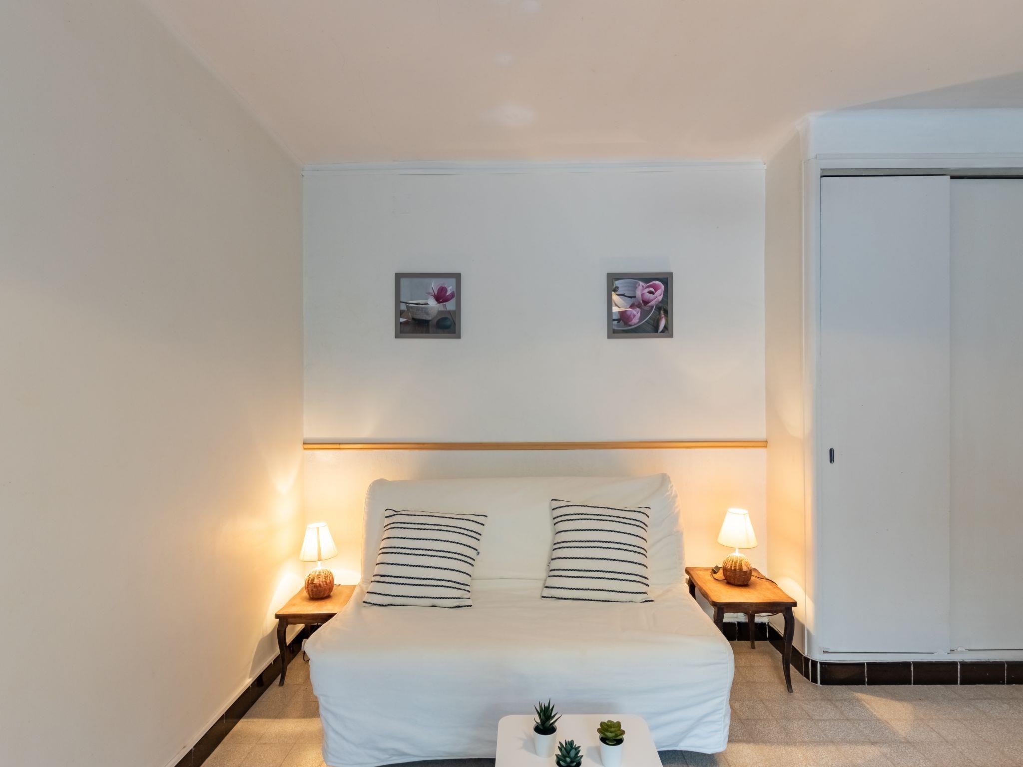 1-room apartment 26 m2, on the ground floor. Simple furnishings: living/dining room with 1 sofabed (140 cm, length 190 cm), TV (flat screen). Exit to the terrace. Kitchenette (2 hot plates, kettle, microwave, electric coffee machine). Shower, sep. WC. No heating option. Terrace 5 m2, roofed, north-west facing position. Terrace furniture. Facilities: Internet (WiFi, extra). Parking. Please note: not suitable for children under 3 years. TV only FR. Warning parking for one car only. 83112000014AI