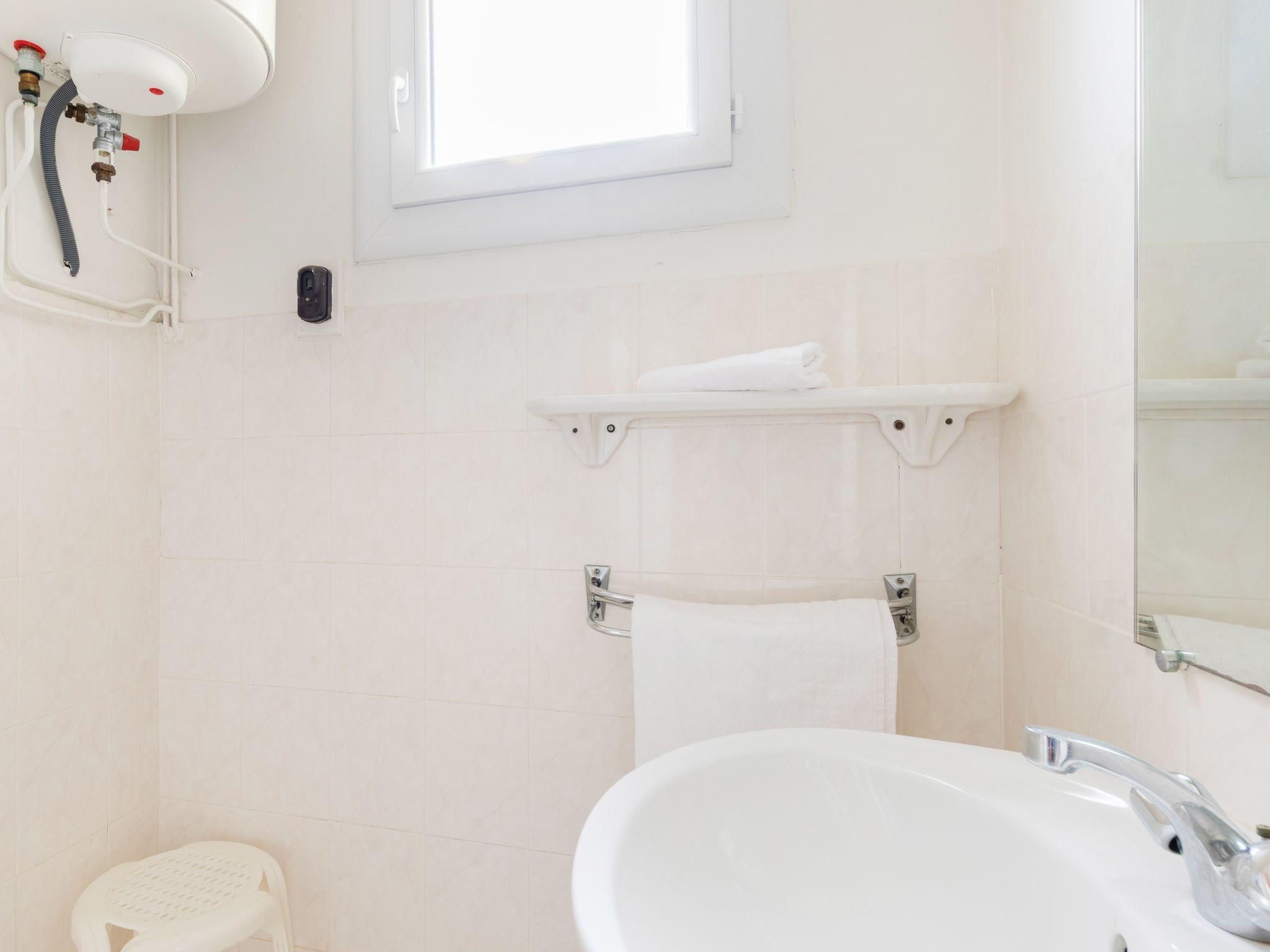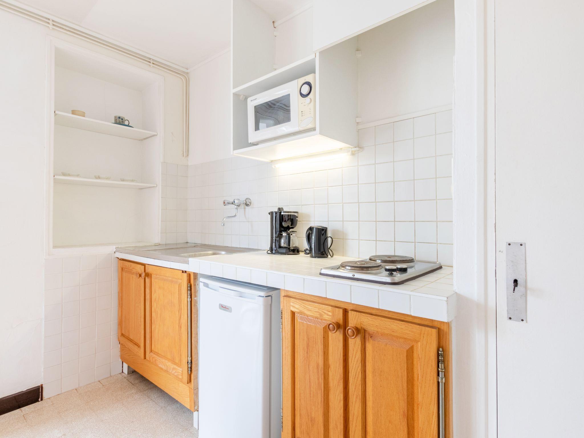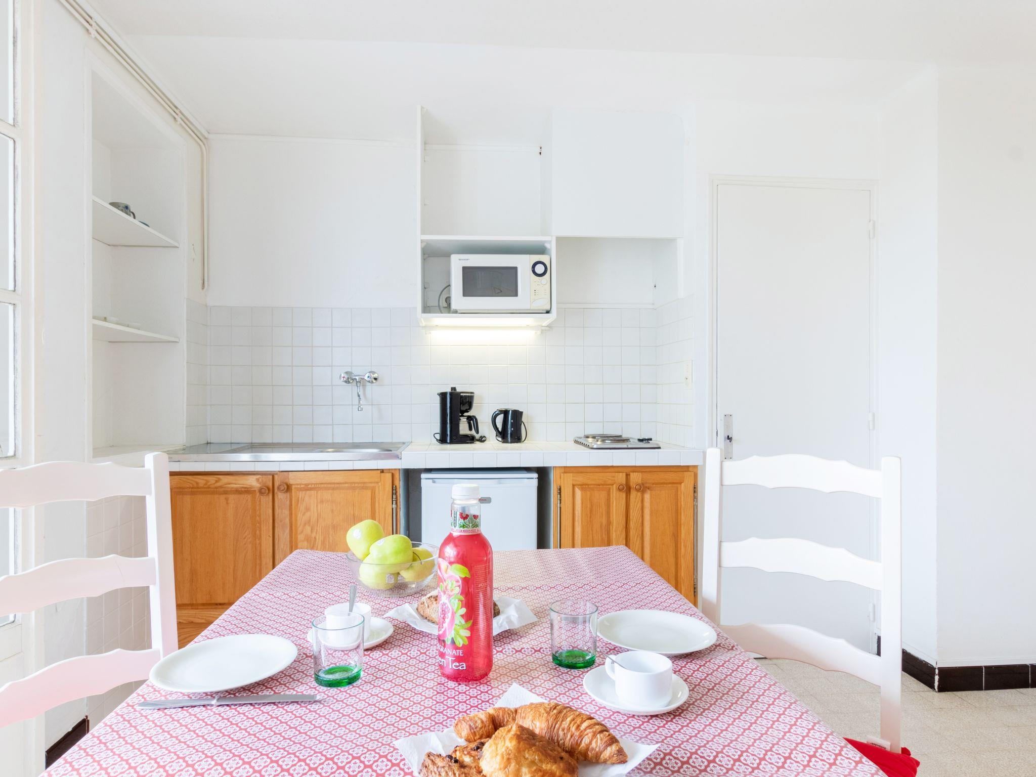 1-room apartment 26 m2 on 1st floor. Simple and practical furnishings: living/dining room with 1 double bed (140 cm, length 190 cm), TV. Exit to the terrace. Kitchenette (2 hot plates, kettle, microwave, electric coffee machine). Shower, sep. WC. No heating option. Terrace 6 m2, north-west facing position. Terrace furniture. Side view of the sea. Facilities: Internet (WiFi, extra). Parking (1 car). Please note: not suitable for children under 3 years. TV only FR. 831120006817Y