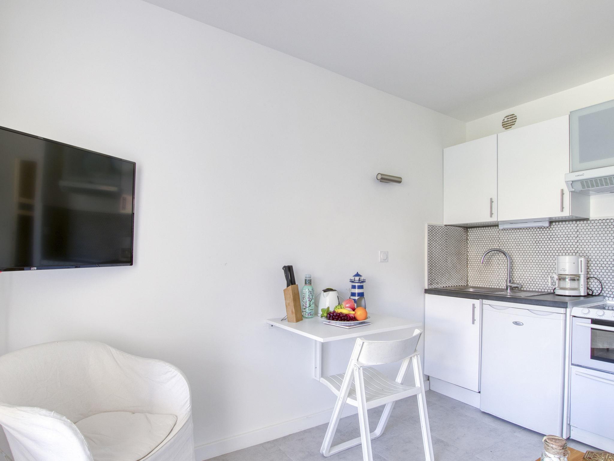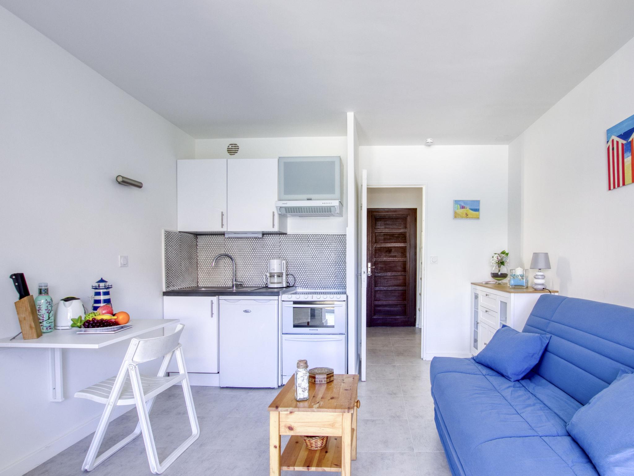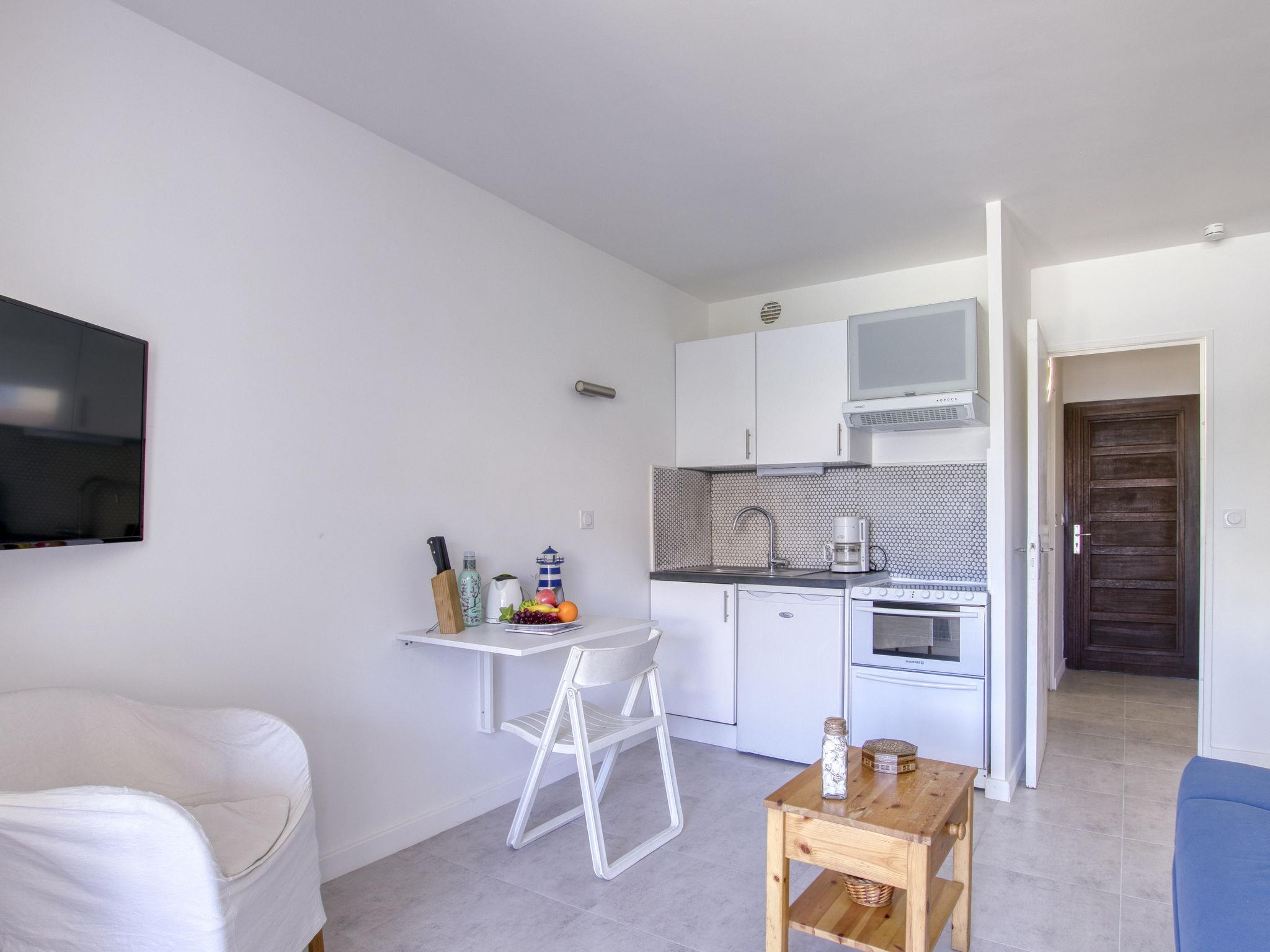 1-room studio 27 m2, on the upper ground floor. Fully renovated in 2023, comfortable and beautiful furnishings: entrance hall, without window with 1 x 2 bunk beds (70 cm, length 190 cm). Living/dining room with 1 double sofabed (160 cm, length 190 cm), TV (flat screen). Exit to the terrace. Kitchenette (mini-oven, dishwasher, 4 ceramic glass hob hotplates, toaster, kettle, electric coffee machine). Shower/WC. Electric heating. Terrace 16 m2. Terrace furniture, electric barbecue. Facilities: washing machine. Internet (WiFi, extra). Parking space n 46. Please note: non-smokers only. TV only FR. Smoke alarm. Offer by a private individual according to Art. 155, IV of CGI. 8311200132312
