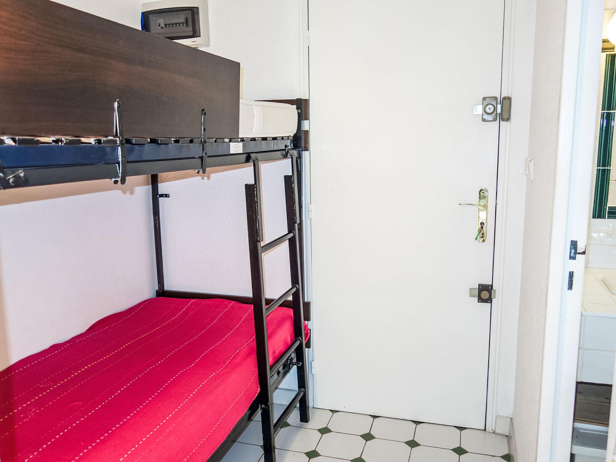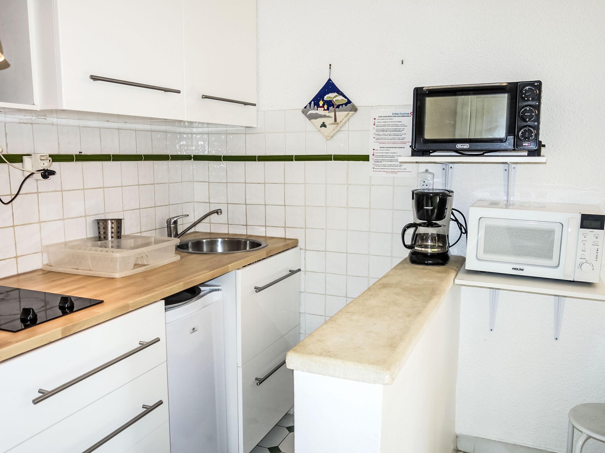 1-room apartment 23 m2, on the upper ground floor. Comfortable and beautiful furnishings: entrance hall, without window with 1 x 2 bunk beds (80 cm, length 190 cm). Living/dining room with 1 sofabed (140 cm, length 190 cm), TV. Exit to the terrace. Kitchenette (mini-oven, 2 ceramic glass hob hotplates, toaster, kettle, microwave, electric coffee machine). Shower/WC. Electric heating. Terrace 7 m2, roofed, south facing position, patio 15 m2, south facing position. Terrace furniture, electric barbecue. Facilities: Internet (WiFi, extra). Parking space n 374. Please note: maximum 1 pet/ dog allowed. TV only FR. Smoke alarm. 831120000824M