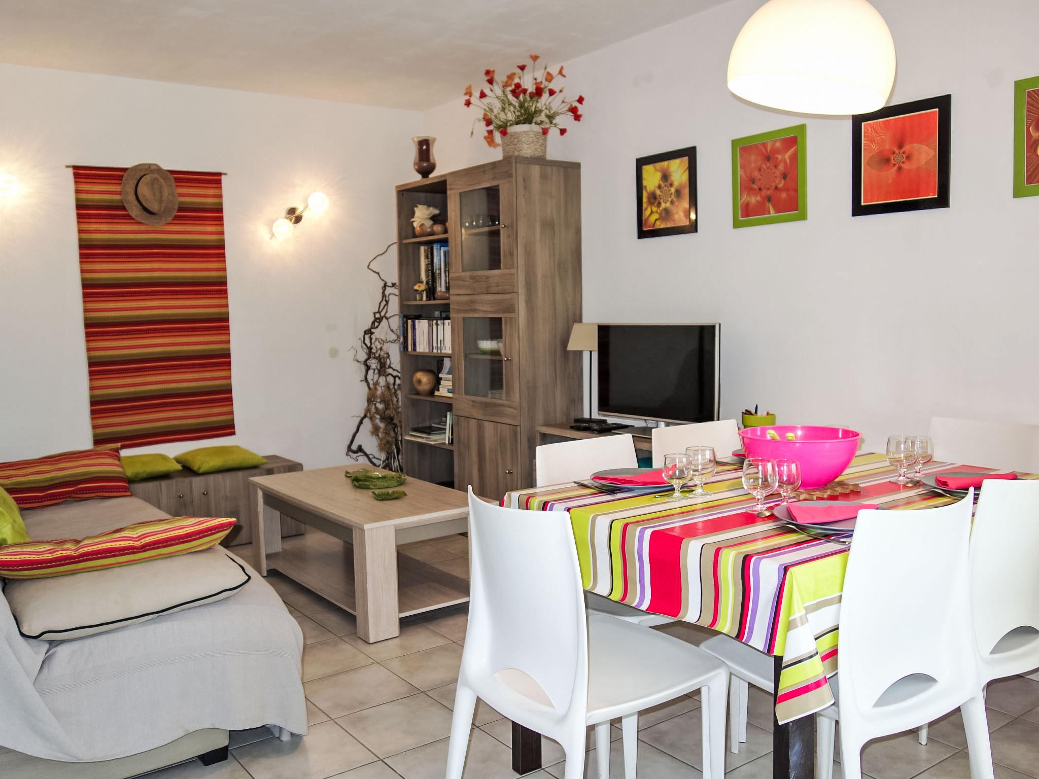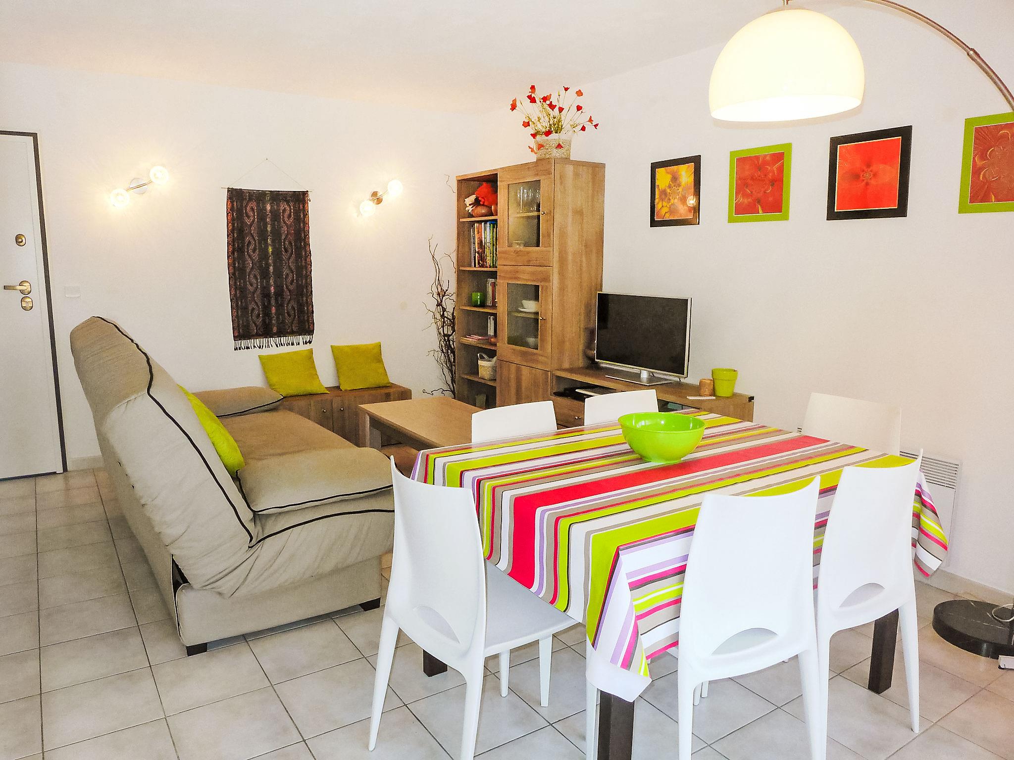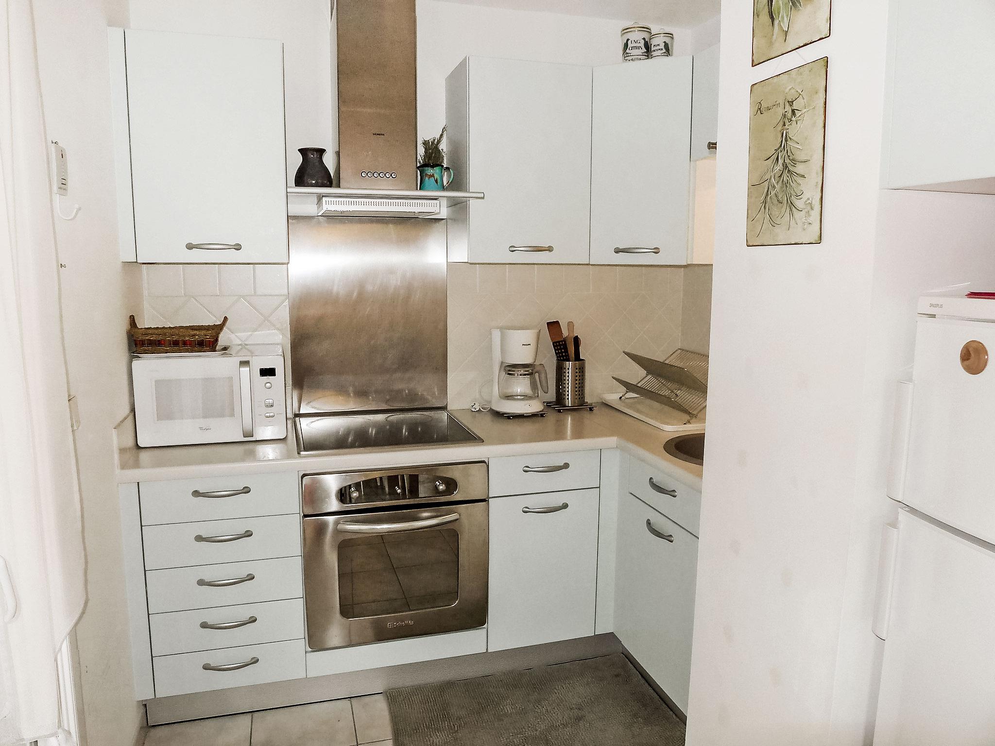 2-room apartment 44 m2 on 1st floor. Practical furnishings: living/dining room with 1 double sofabed (1 x 140 cm, length 190 cm), TV and international TV channels (flat screen), DVD. Exit to the terrace. 1 room with 1 french bed (1 x 140 cm, length 200 cm). Open kitchen (oven, 3 induction hot plates, toaster, microwave, freezer, electric coffee machine). Shower, sep. WC. Electric heating. Large terrace 15 m2, roofed, north-west facing position. Terrace furniture. Facilities: washing machine. Internet (WiFi, free). Parking at 100 m. Please note: non-smokers only. Smoke alarm. 83112000075DM