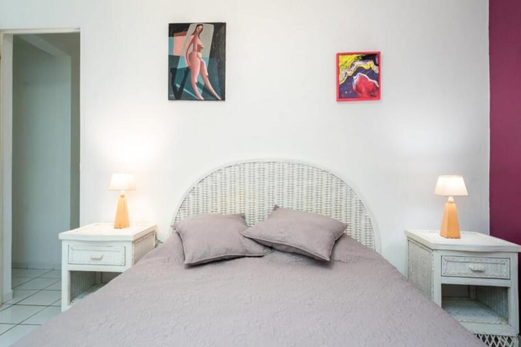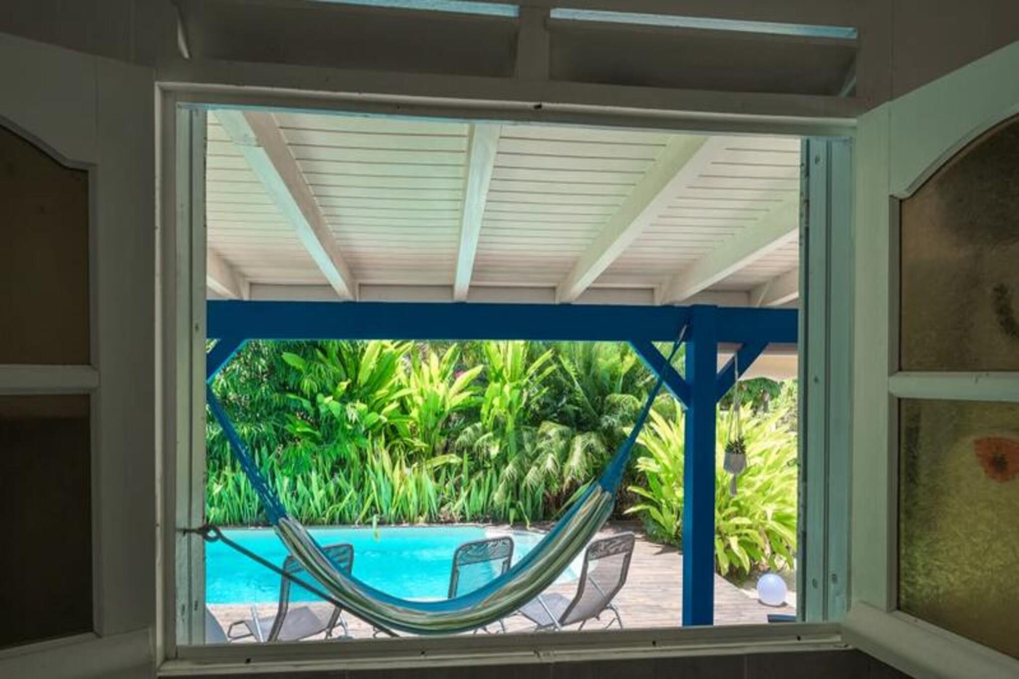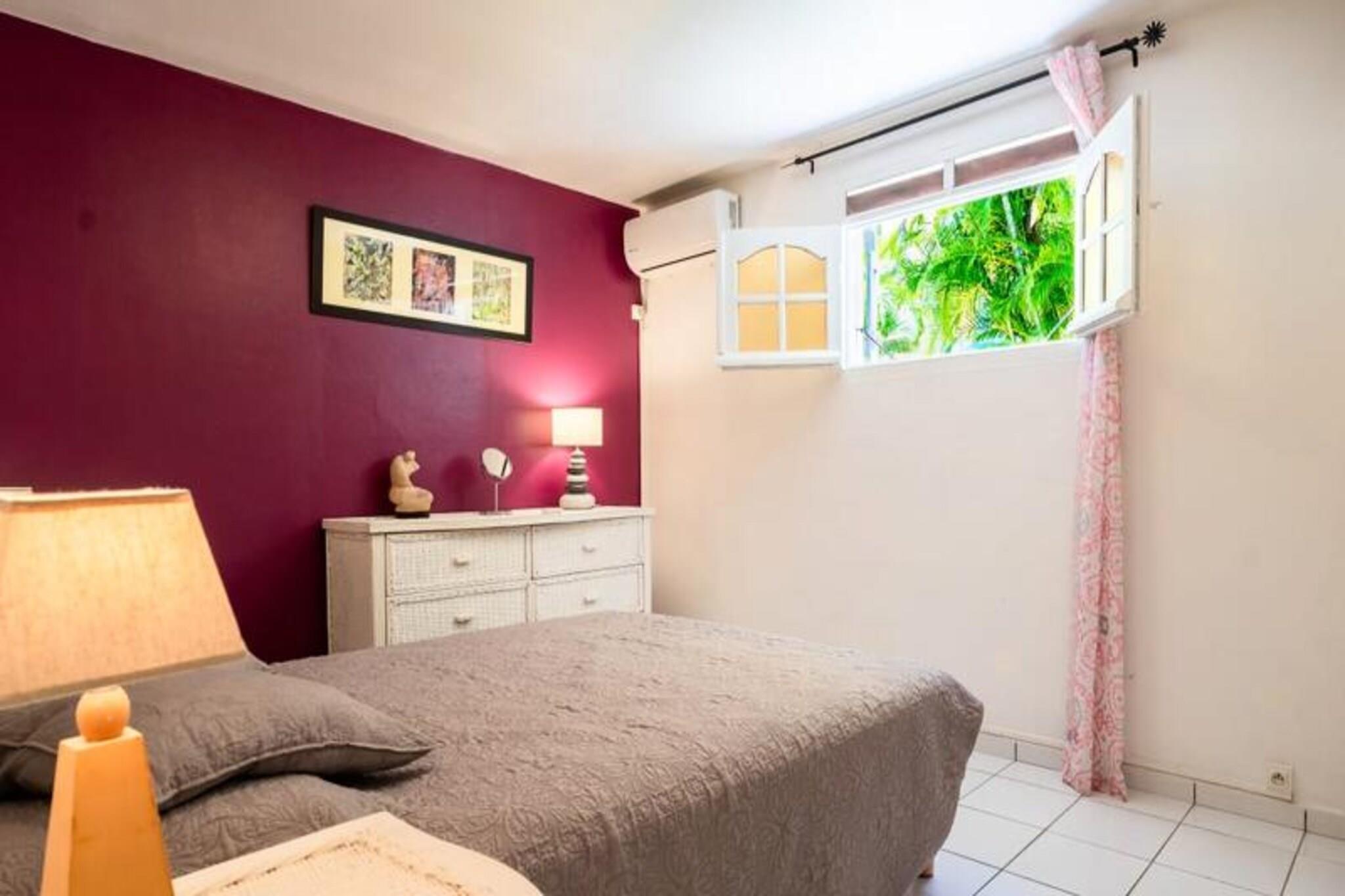 Denne rolige villa (nederste del af et større hus) tilbyder privat adgang, en pool og en skovklædt have. Det sover fire i to soveværelser med aircondition (et med to 90 cm senge, et med en 160 cm seng). Sengetøj/håndklæder er inkluderet, og rengøring tilbydes. Fester er ikke tilladt. Der kræves et depositum. Det kan lejes med den øverste del (separat indgang/pool) til i alt otte gæster. Beliggende i Saint-François, Guadeloupe, er det tæt på strande, restauranter og byens centrum (5 minutter). Marinaen, golfbanen, kasinoet og flyvepladsen er i nærheden. Smukke strande (Raisins Clairs osv.) er en kort køretur væk, ligesom Pointe-des-Châteaux. Et lokalt marked byder på fisk og krydderier. Feriehuset har overdækket terrasse, veludstyret køkken åbent til stuen, fælles badeværelse og toilet. Faciliteterne inkluderer internet og et vandreservesystem. En velkomstcocktail og dedikeret concierge-service tilbydes sammen med adgang til partnertjenester (udflugter, udlejning osv.). Denne villa tilbyder en afslappende base for at udforske Guadeloupe.