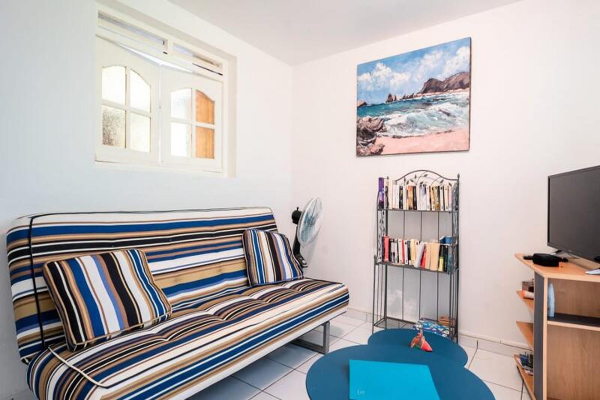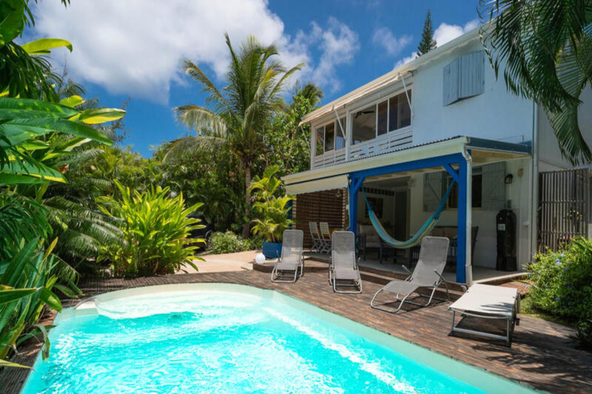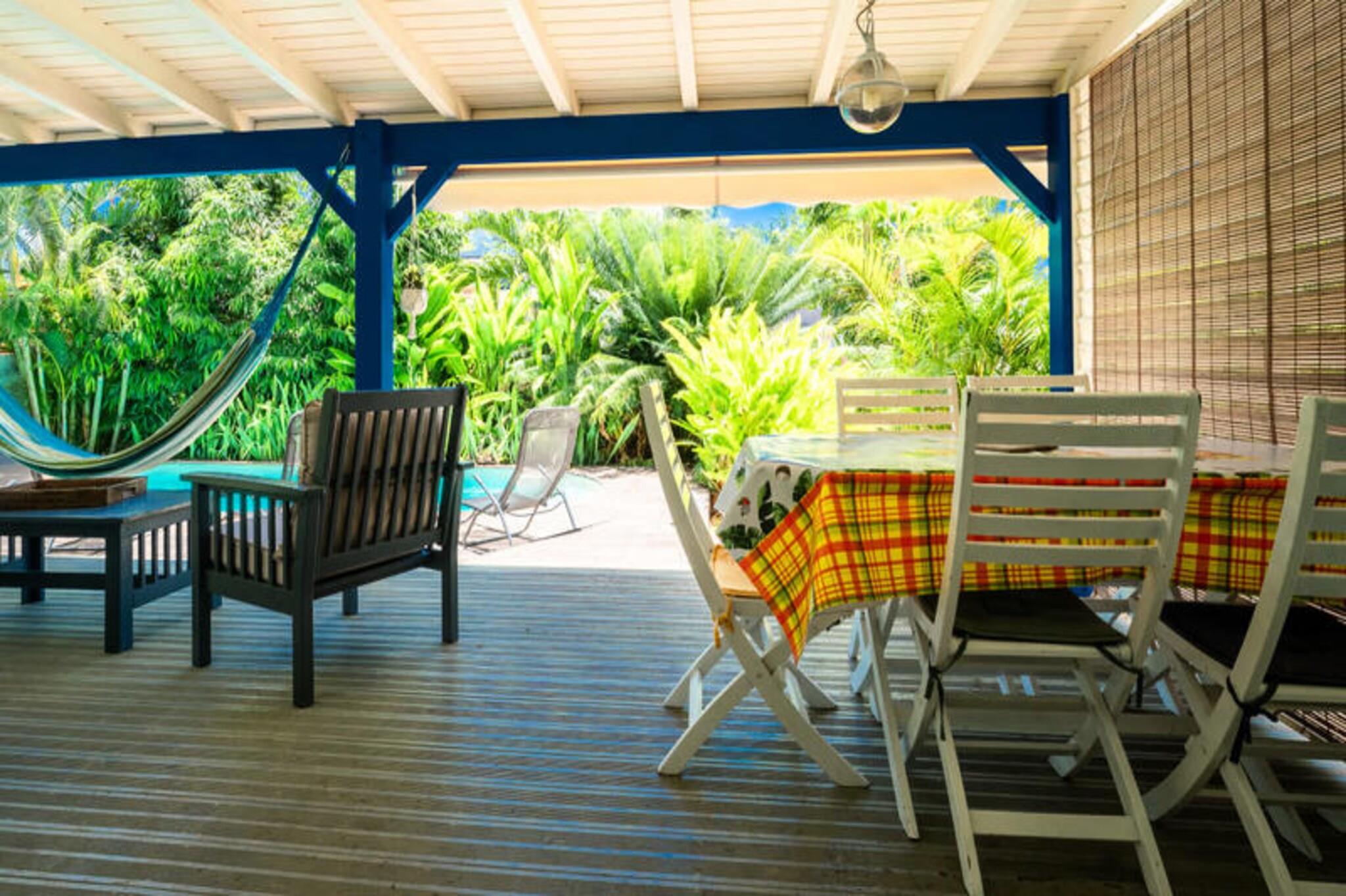 Denne rolige villa (nederste del af et større hus) tilbyder privat adgang, en pool og en skovklædt have. Det sover fire i to soveværelser med aircondition (et med to 90 cm senge, et med en 160 cm seng). Sengetøj/håndklæder er inkluderet, og rengøring tilbydes. Fester er ikke tilladt. Der kræves et depositum. Det kan lejes med den øverste del (separat indgang/pool) til i alt otte gæster. Beliggende i Saint-François, Guadeloupe, er det tæt på strande, restauranter og byens centrum (5 minutter). Marinaen, golfbanen, kasinoet og flyvepladsen er i nærheden. Smukke strande (Raisins Clairs osv.) er en kort køretur væk, ligesom Pointe-des-Châteaux. Et lokalt marked byder på fisk og krydderier. Feriehuset har overdækket terrasse, veludstyret køkken åbent til stuen, fælles badeværelse og toilet. Faciliteterne inkluderer internet og et vandreservesystem. En velkomstcocktail og dedikeret concierge-service tilbydes sammen med adgang til partnertjenester (udflugter, udlejning osv.). Denne villa tilbyder en afslappende base for at udforske Guadeloupe.