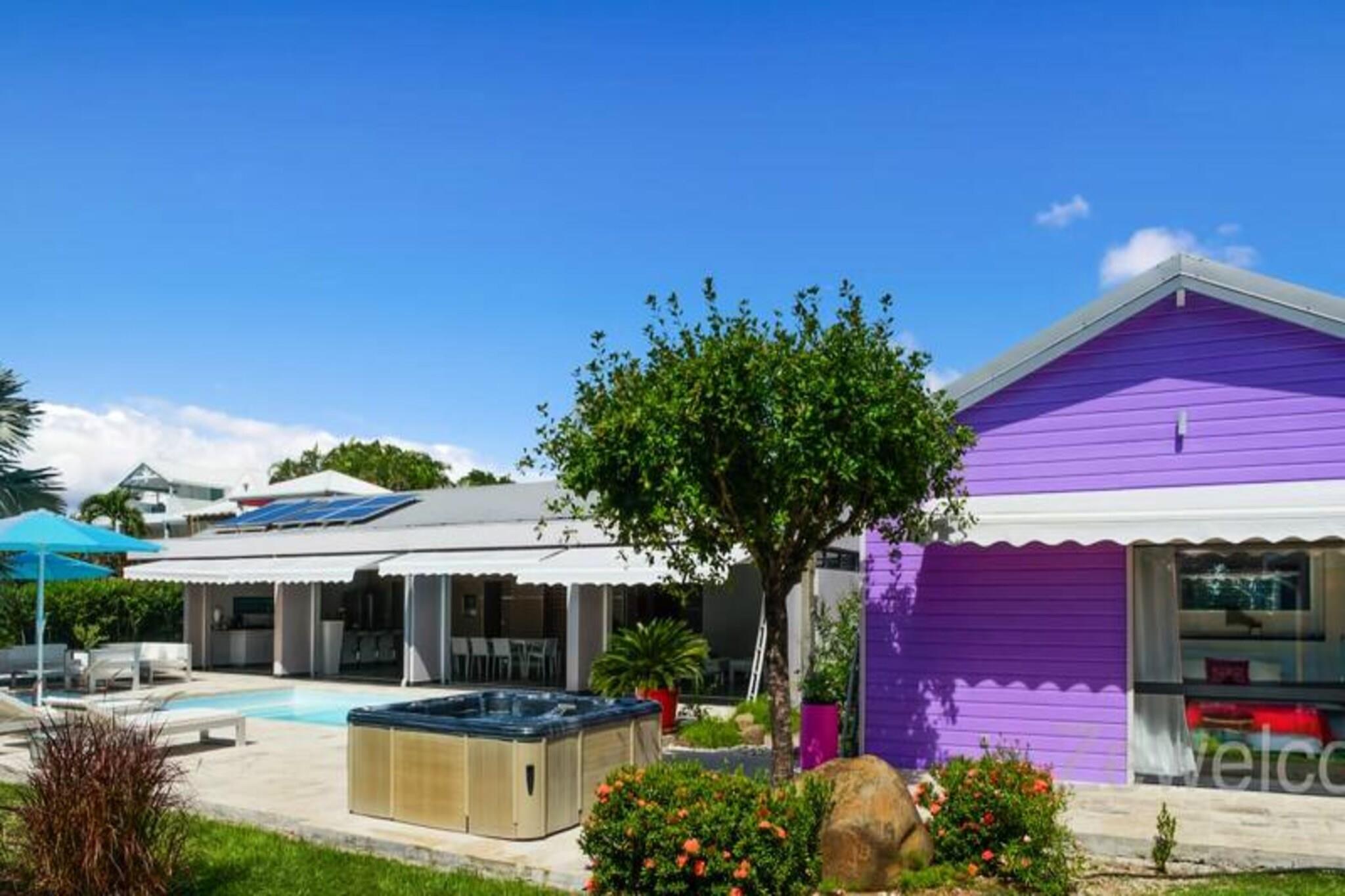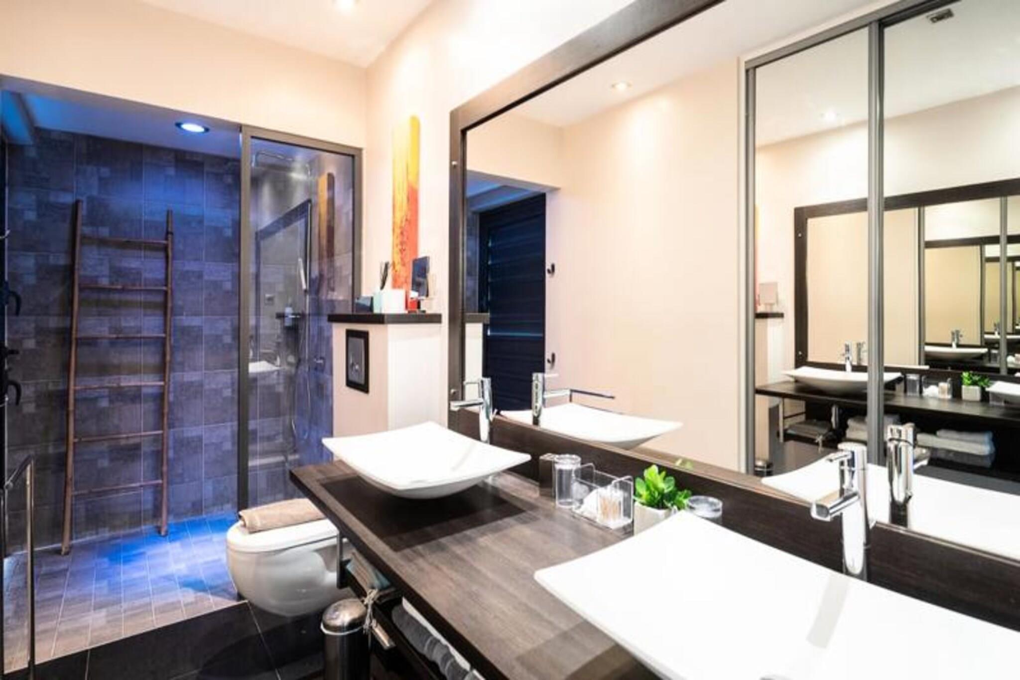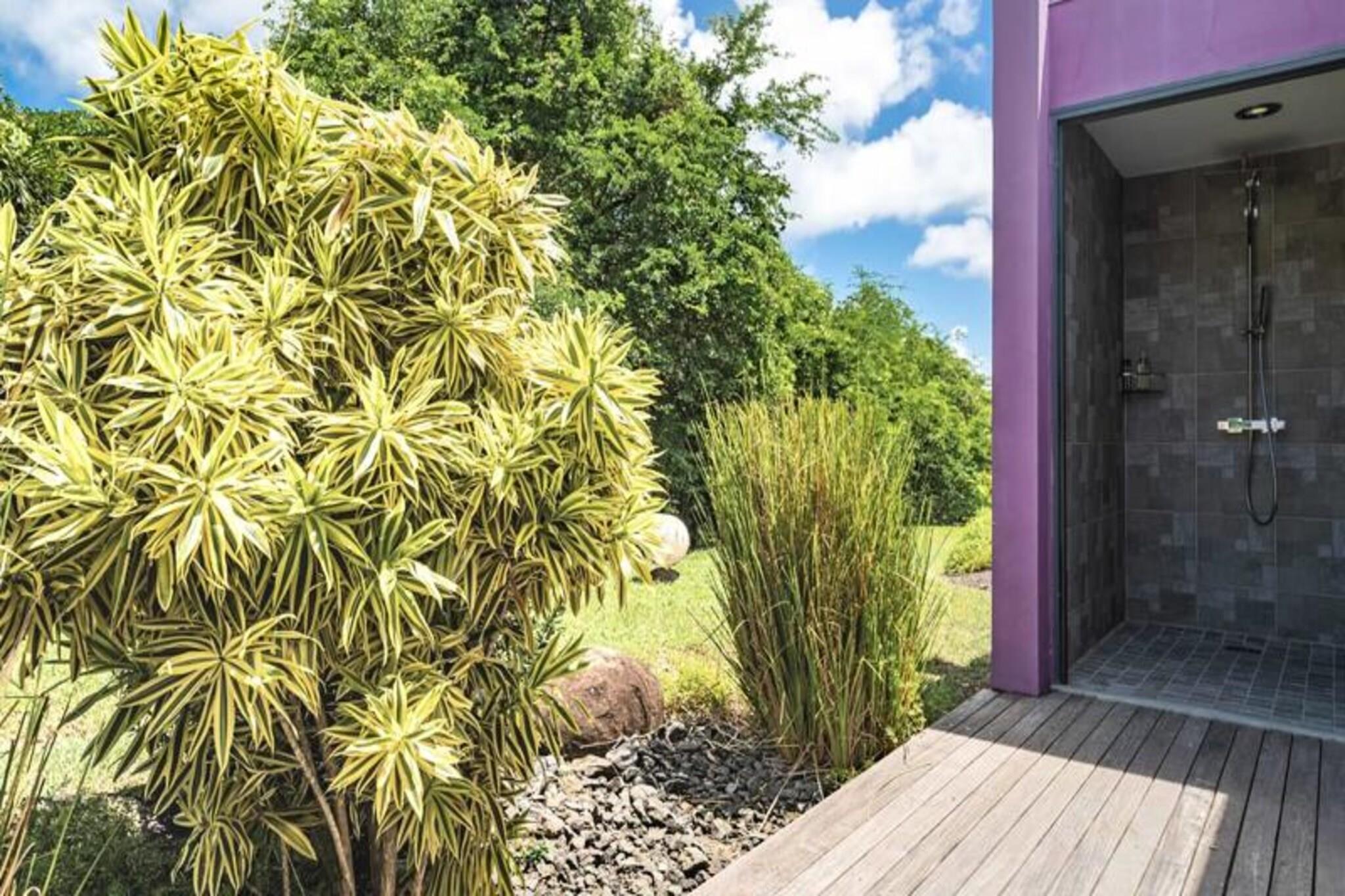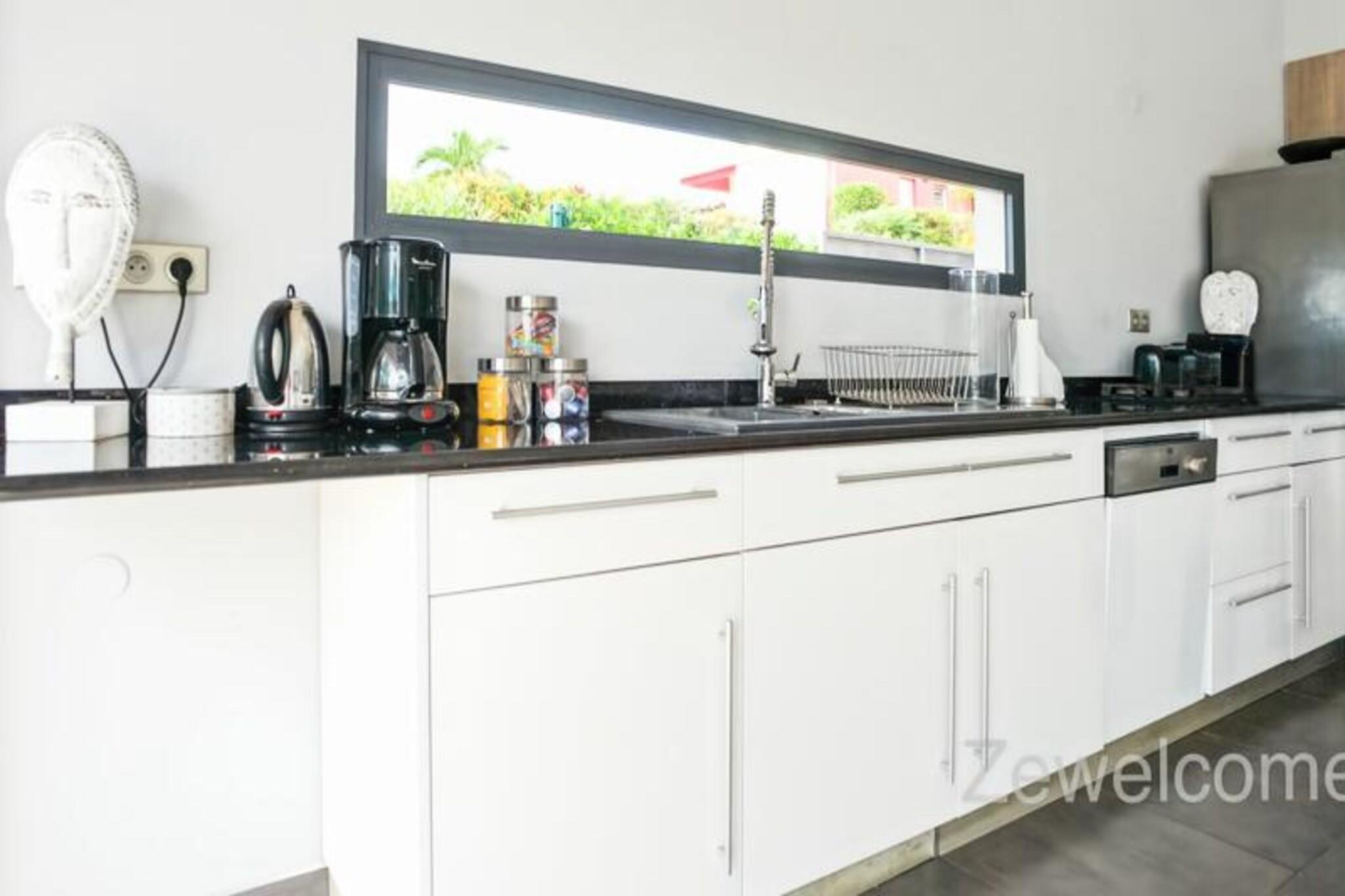Denne luksuriøse villa på 250 m² tilbyder enestående komfort med fire soveværelser med aircondition, hver med eget badeværelse med en walk-in italiensk bruser. Avanceret sengetøj sikrer fredelige nætter. Selvom kæledyrspolitikker ikke er eksplicit angivet, er det tilrådeligt at spørge direkte. Ejendommen er beliggende i et privat domæne og kan prale af en privat swimmingpool og jacuzzi. Fester er ikke tilladt af respekt for nabolaget. Beliggende i Saint-François på Guadeloupes Grande-Terre, er dette feriehus en kort køretur fra Pointe-à-Pitre lufthavn (45 minutter) og kun 5 minutter fra byens centrum, hvor du finder et supermarked, bageri, apotek, fiskemarked og natmarked. Marina de Saint-François, med sine restauranter og butikker, er også i nærheden, ligesom den internationale golfbane, kasinoet og flyvepladsen. Villaen har en stor 90m² åben stue med komfortable siddepladser og direkte adgang til en solrig terrasse og swimmingpoolen. Det fuldt udstyrede køkken er et paradis for madelskere og inkluderer en vinkælder. Håndklæder, sengelinned og rengøring før og efter dit ophold er inkluderet. Et vandreservesystem er på plads. En dedikeret concierge er tilgængelig før, under og efter dit ophold for at hjælpe med forskellige behov, herunder udflugter, biludlejning, lufthavnstransport og særlige ønsker. Velkomstforfriskninger tilbydes ved ankomsten.