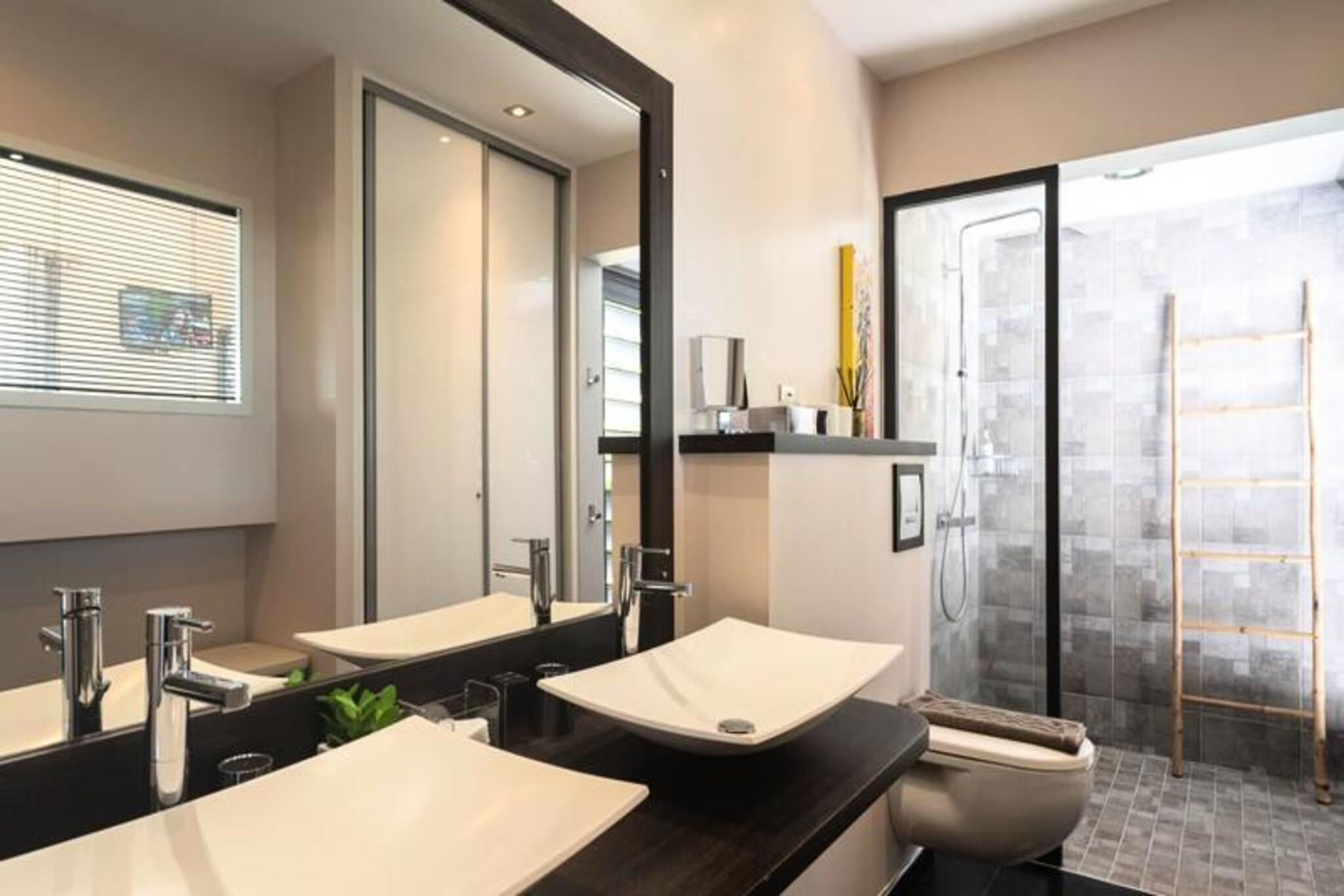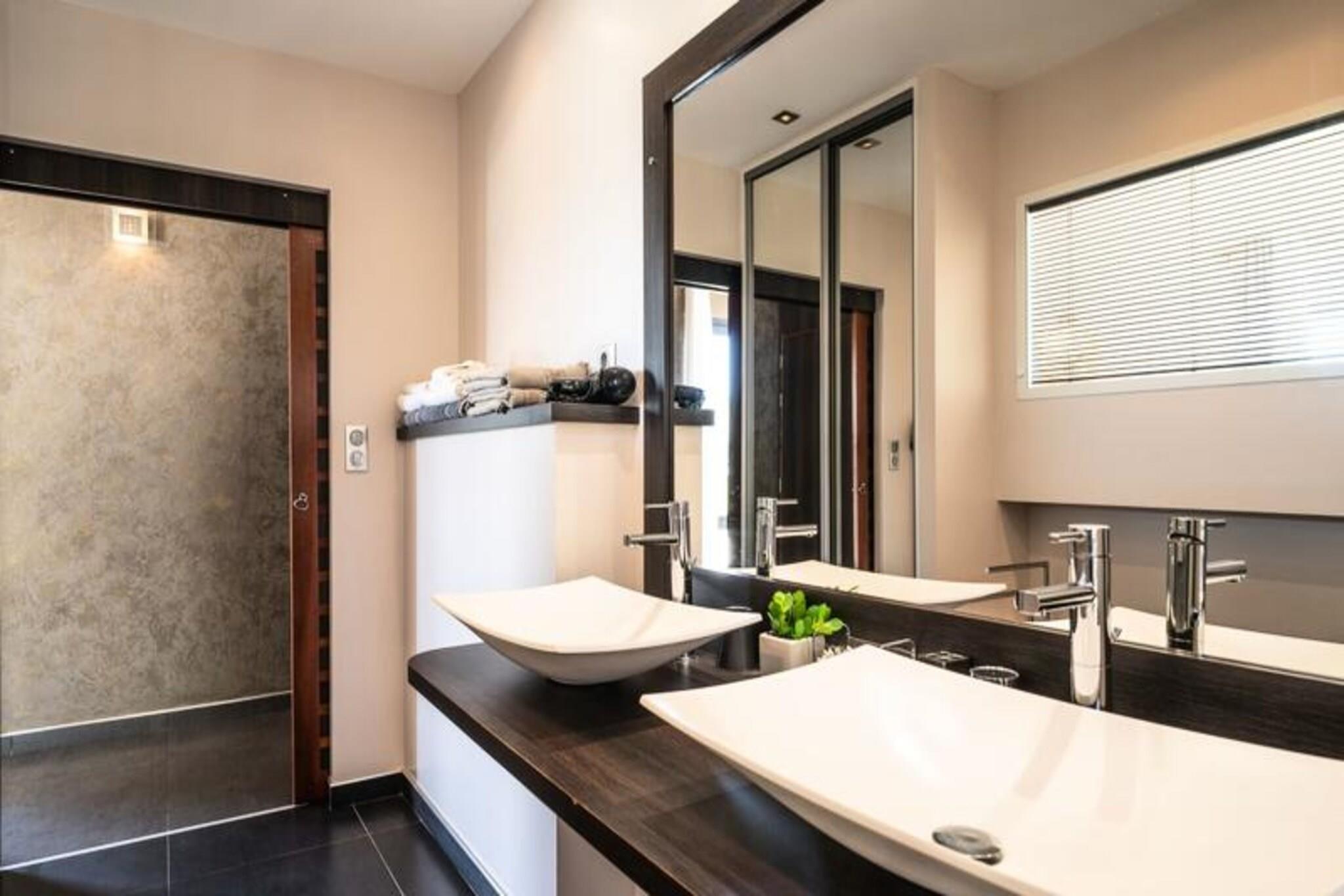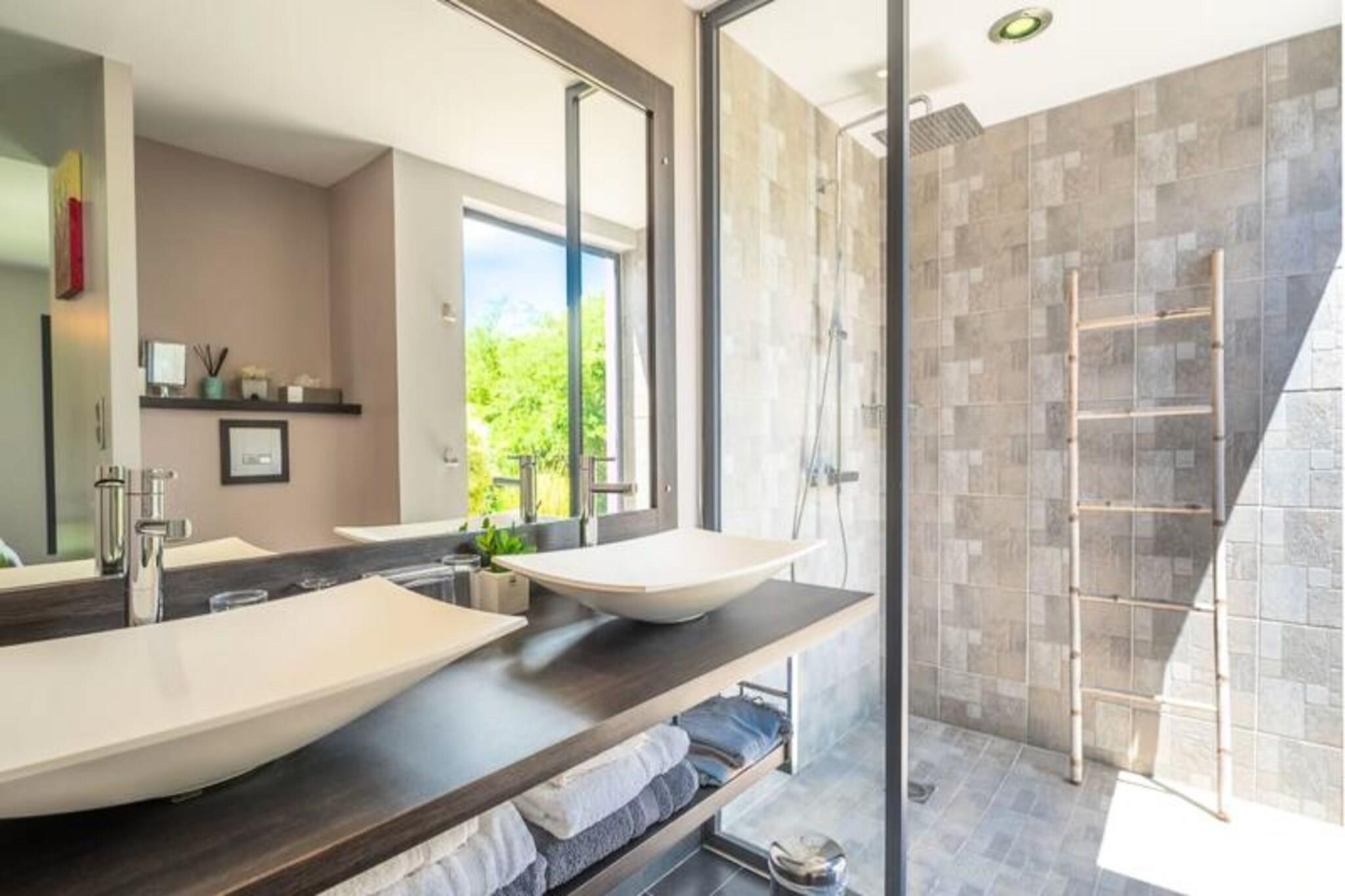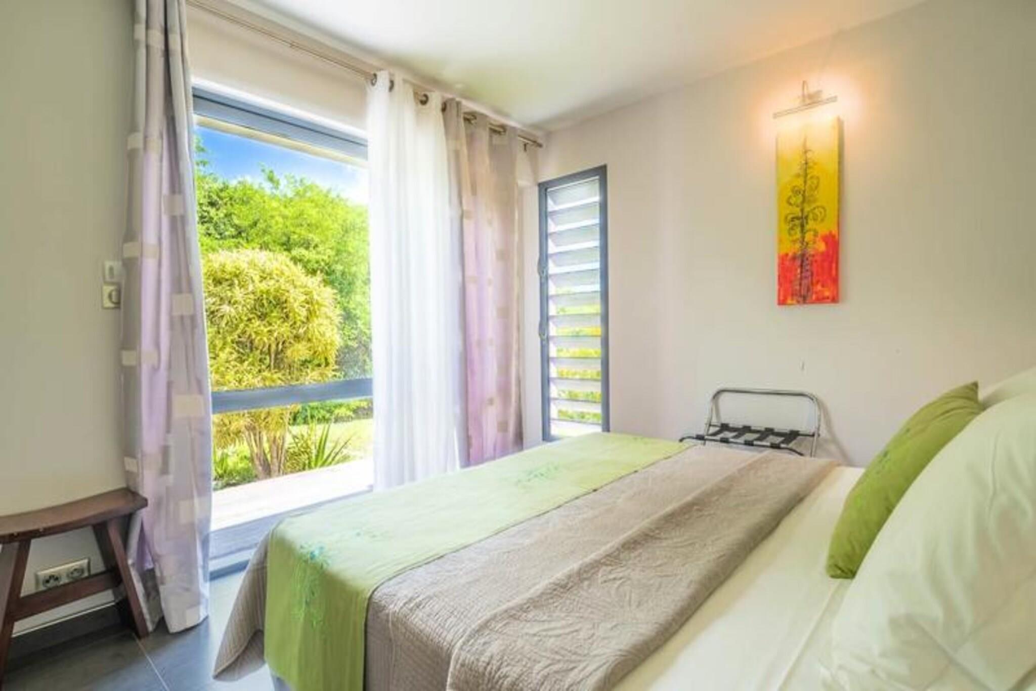 Denne luksuriøse villa på 250 m² tilbyder enestående komfort med fire soveværelser med aircondition, hver med eget badeværelse med en walk-in italiensk bruser. Avanceret sengetøj sikrer fredelige nætter. Selvom kæledyrspolitikker ikke er eksplicit angivet, er det tilrådeligt at spørge direkte. Ejendommen er beliggende i et privat domæne og kan prale af en privat swimmingpool og jacuzzi. Fester er ikke tilladt af respekt for nabolaget. Beliggende i Saint-François på Guadeloupes Grande-Terre, er dette feriehus en kort køretur fra Pointe-à-Pitre lufthavn (45 minutter) og kun 5 minutter fra byens centrum, hvor du finder et supermarked, bageri, apotek, fiskemarked og natmarked. Marina de Saint-François, med sine restauranter og butikker, er også i nærheden, ligesom den internationale golfbane, kasinoet og flyvepladsen. Villaen har en stor 90m² åben stue med komfortable siddepladser og direkte adgang til en solrig terrasse og swimmingpoolen. Det fuldt udstyrede køkken er et paradis for madelskere og inkluderer en vinkælder. Håndklæder, sengelinned og rengøring før og efter dit ophold er inkluderet. Et vandreservesystem er på plads. En dedikeret concierge er tilgængelig før, under og efter dit ophold for at hjælpe med forskellige behov, herunder udflugter, biludlejning, lufthavnstransport og særlige ønsker. Velkomstforfriskninger tilbydes ved ankomsten.