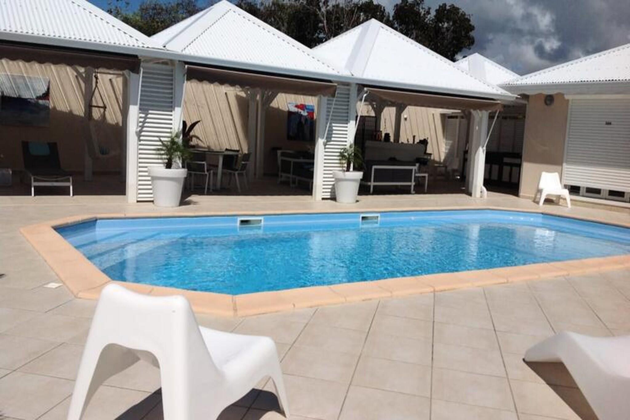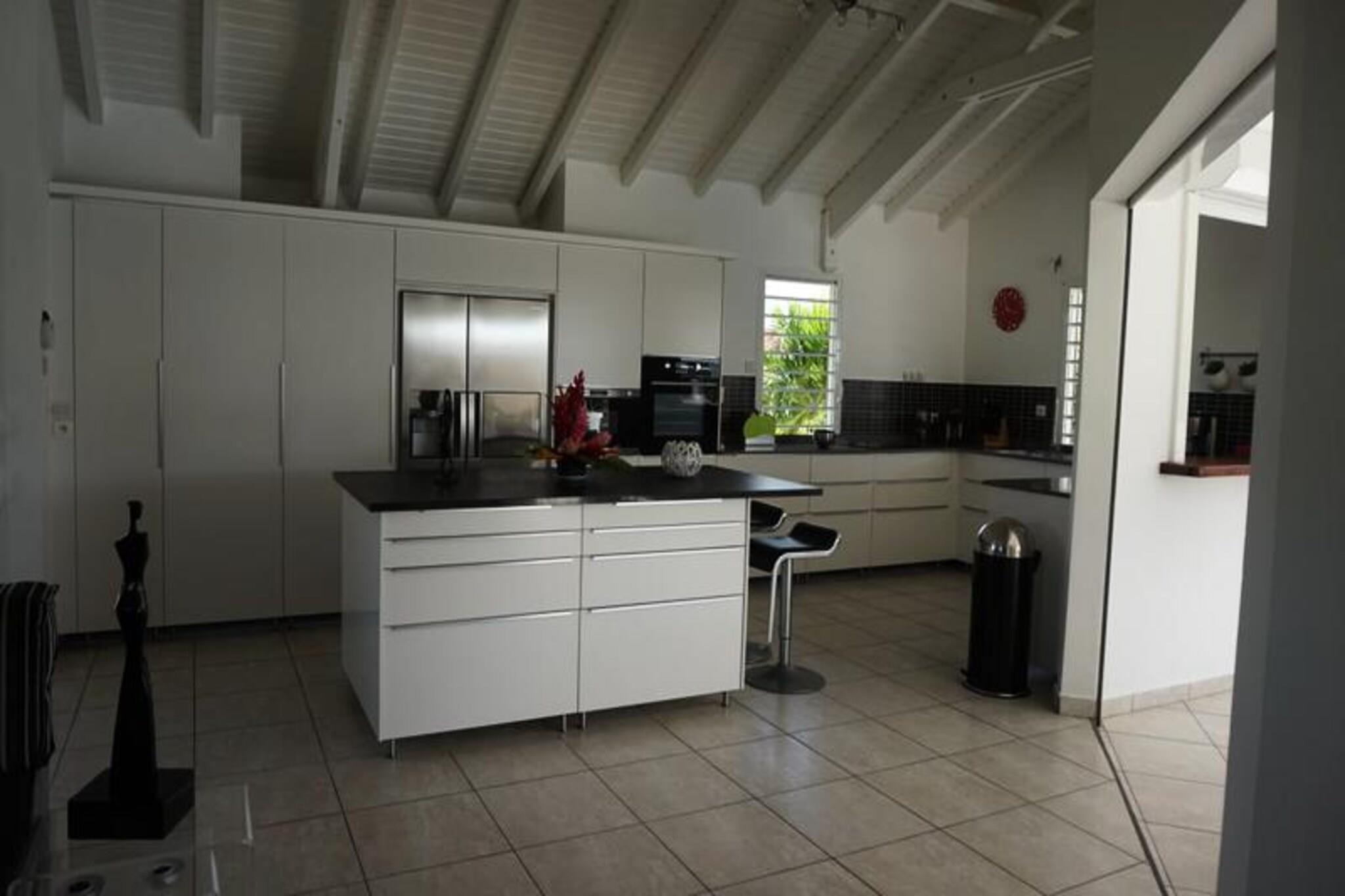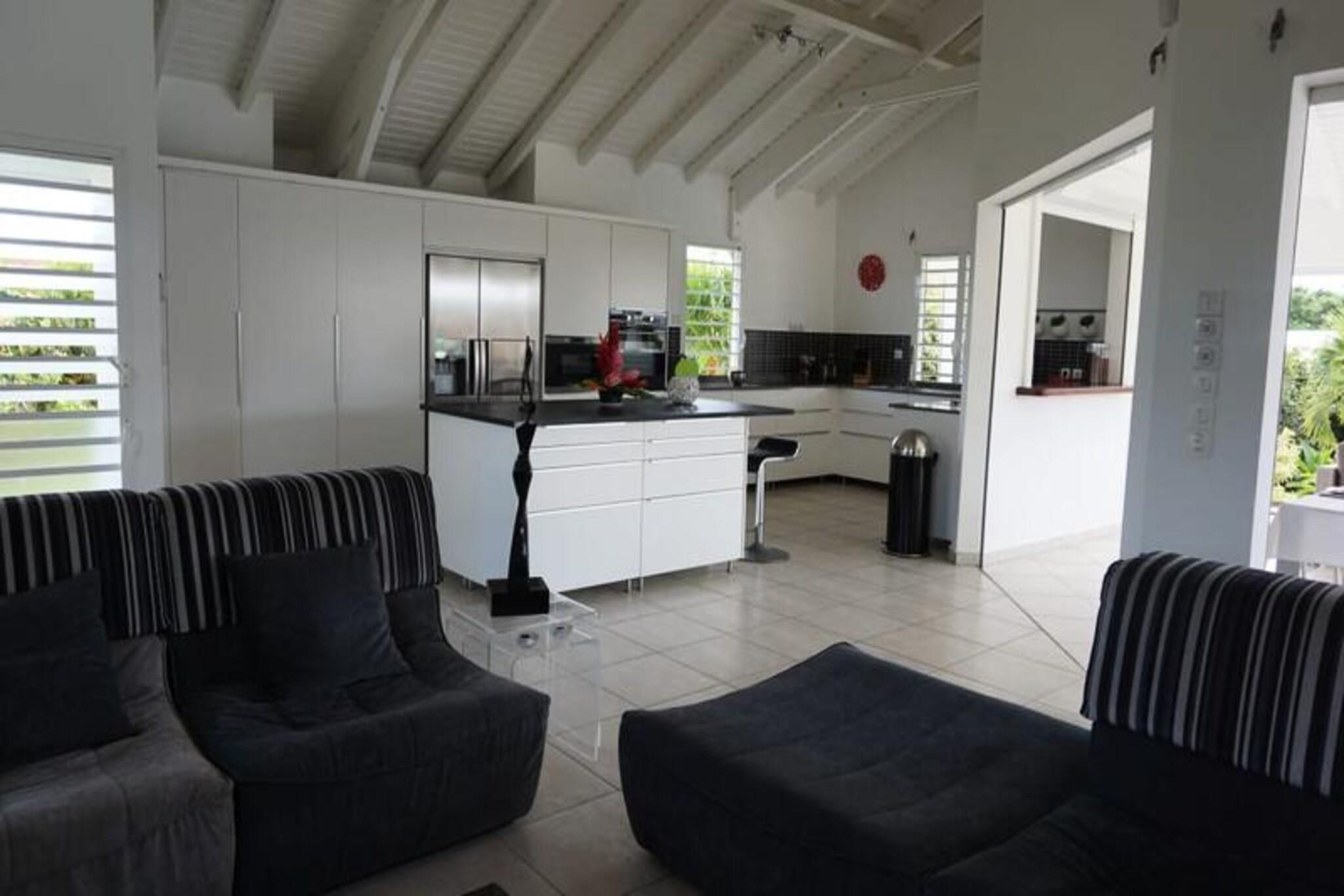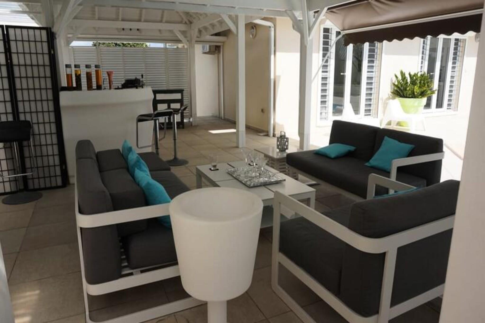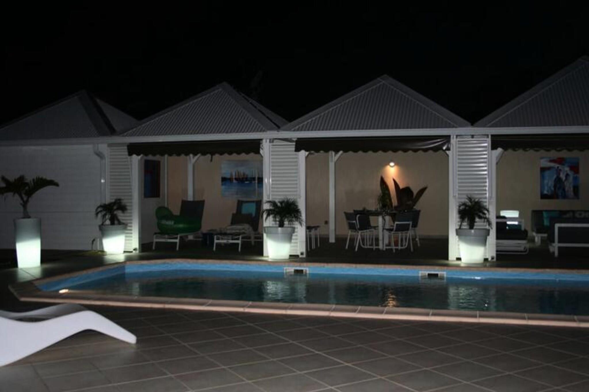 Denne luksuriøse villa er en sand tropisk oase, og byder på tre soveværelser med aircondition og sengetøj i topkvalitet (to 160 cm senge og to 90 cm senge), hvilket sikrer et afslappende ophold. Villaen indeholder to uberørte badeværelser og to toiletter. De rummelige udendørsarealer er ideelle til afslapning og har flere terrasser, to lounger og et udendørs køkken, hvilket gør det perfekt til udendørs spisning og socialt samvær. Du vil have adgang til en privat swimmingpool omgivet af frodige tropiske grønne områder, med masser af plads til at slappe af og nyde solen. Villaen ligger kun 10 minutters gang fra den smukke Anse des Rochers-strand og tilbyder nem adgang til lokale attraktioner. Centrum af Saint-François ligger kun 5 minutter væk i bil, hvor du finder supermarkeder, bagerier, markeder og andre vigtige faciliteter. Derudover er du i gåafstand til Saint-François Marina, der er kendt for sine restauranter, butikker og pulserende atmosfære. Villaen ligger også tæt på Saint-François International Golf Course, kasinoet og Aerodrome. Villaens interiør inkluderer et fuldt udstyret køkken, både indendørs og udendørs, med kvalitetsapparater og et ventilationssystem for maksimal komfort. Et vandreservesystem sikrer, at du altid er forsynet med vand. Ejendommen er udstyret med højhastighedsinternet, og dit ophold inkluderer rengøring før og efter dit besøg. En dedikeret concierge er tilgængelig for at imødekomme dine behov og hjælpe med udflugter, leje af køretøjer og særlige ønsker, hvilket sikrer et personligt og enestående ophold.