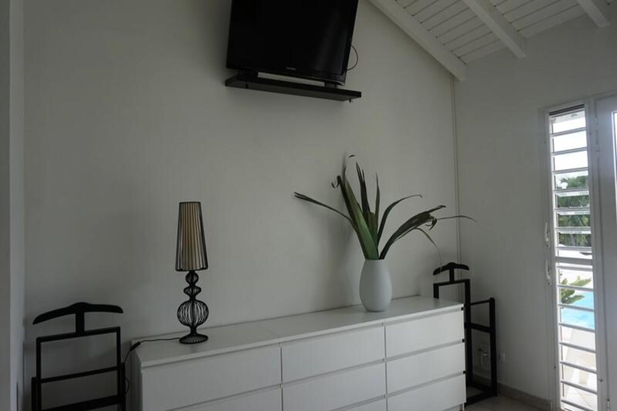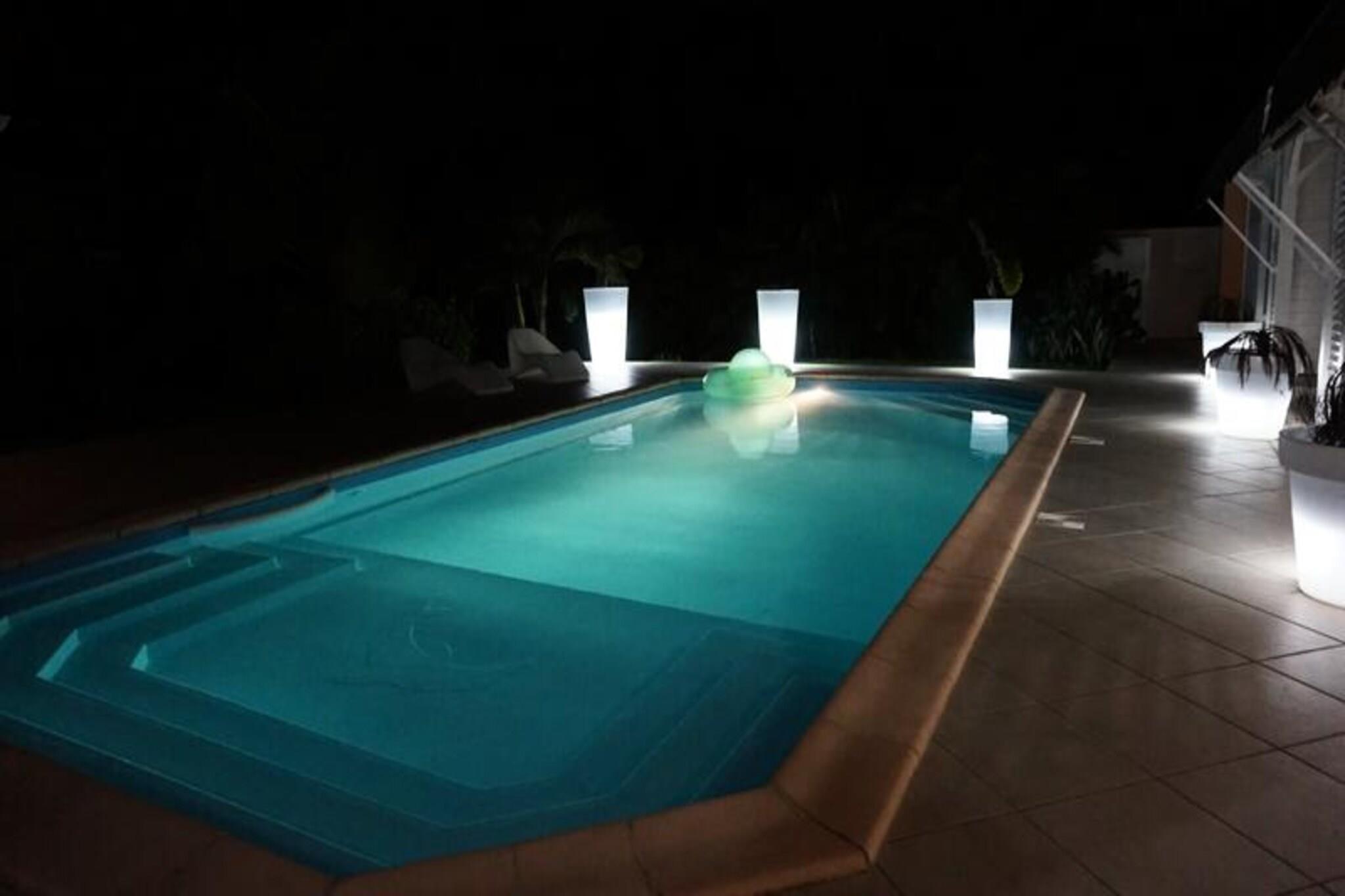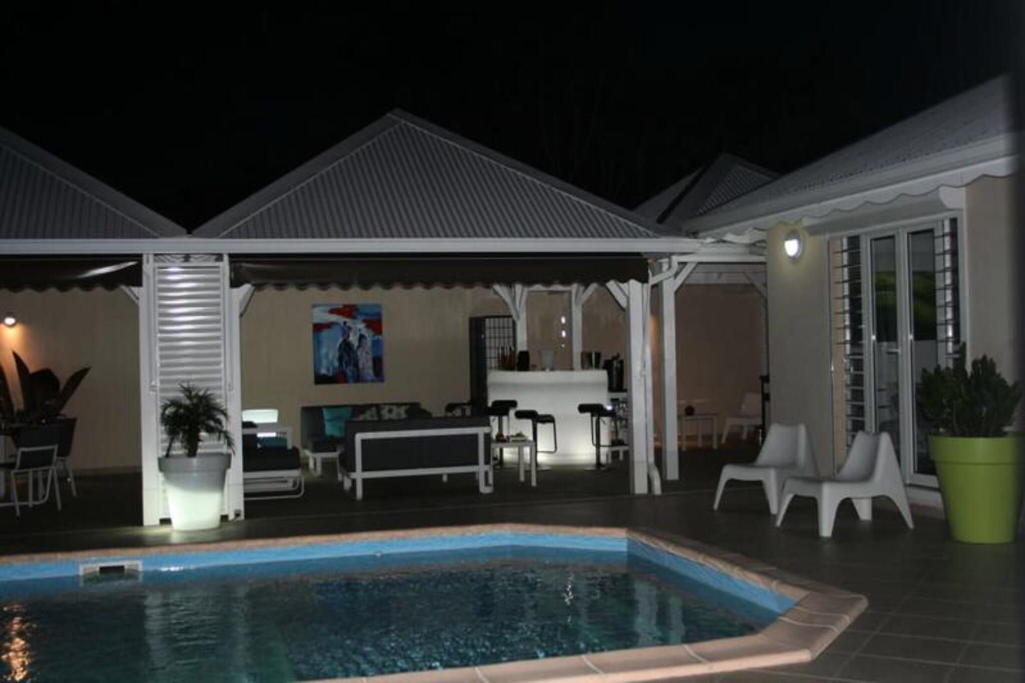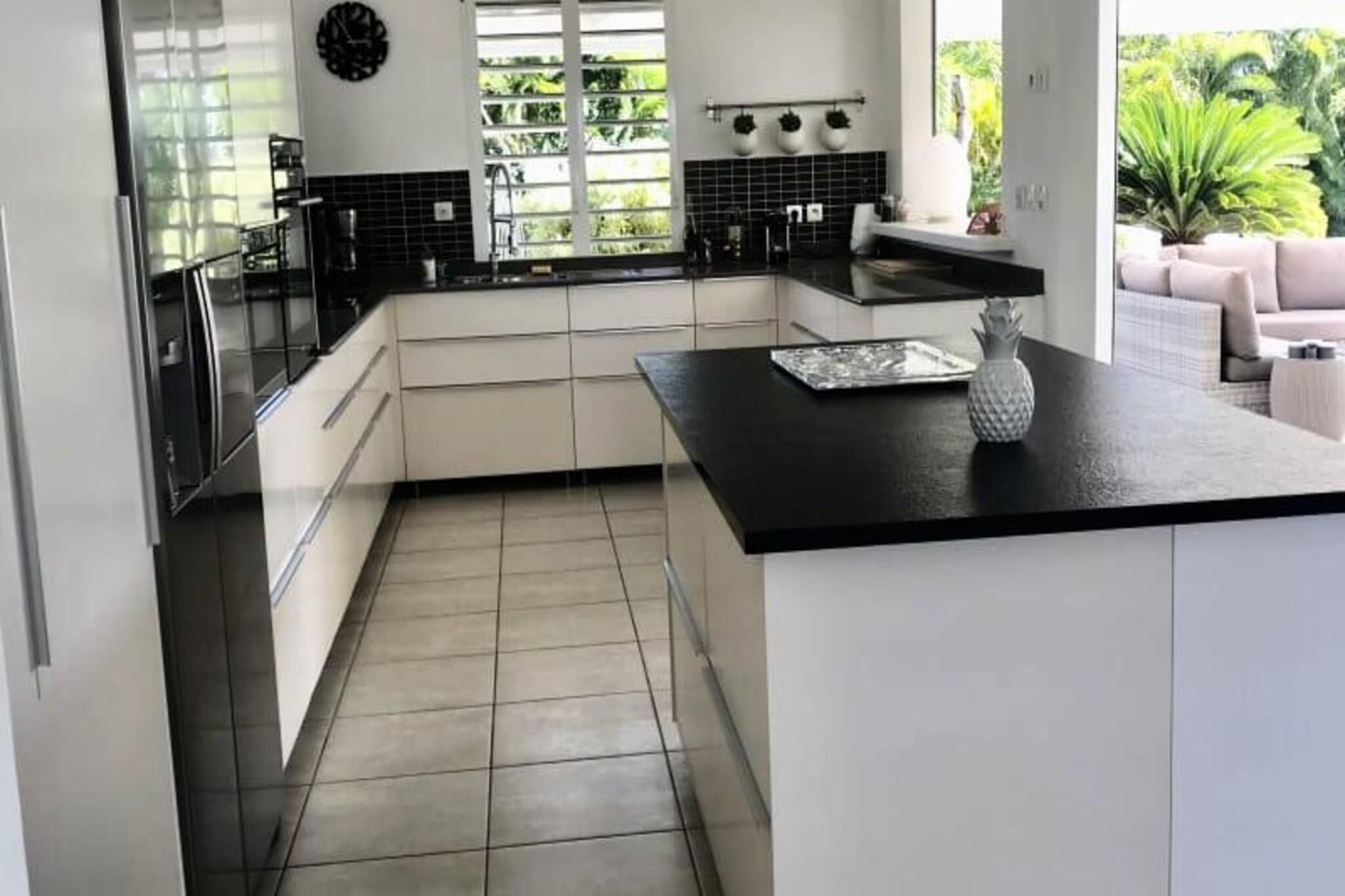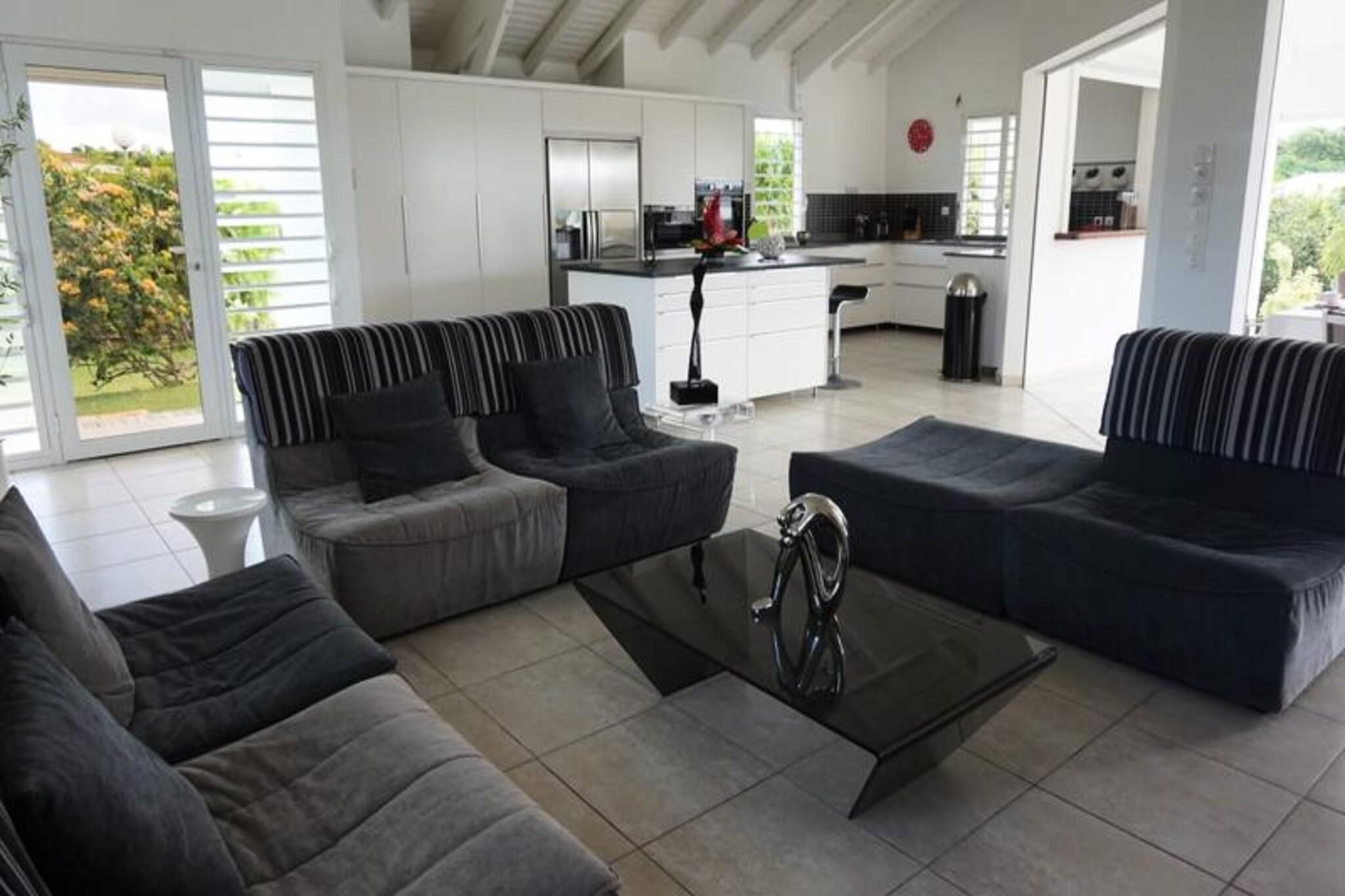 Denne luksuriøse villa er en sand tropisk oase, og byder på tre soveværelser med aircondition og sengetøj i topkvalitet (to 160 cm senge og to 90 cm senge), hvilket sikrer et afslappende ophold. Villaen indeholder to uberørte badeværelser og to toiletter. De rummelige udendørsarealer er ideelle til afslapning og har flere terrasser, to lounger og et udendørs køkken, hvilket gør det perfekt til udendørs spisning og socialt samvær. Du vil have adgang til en privat swimmingpool omgivet af frodige tropiske grønne områder, med masser af plads til at slappe af og nyde solen. Villaen ligger kun 10 minutters gang fra den smukke Anse des Rochers-strand og tilbyder nem adgang til lokale attraktioner. Centrum af Saint-François ligger kun 5 minutter væk i bil, hvor du finder supermarkeder, bagerier, markeder og andre vigtige faciliteter. Derudover er du i gåafstand til Saint-François Marina, der er kendt for sine restauranter, butikker og pulserende atmosfære. Villaen ligger også tæt på Saint-François International Golf Course, kasinoet og Aerodrome. Villaens interiør inkluderer et fuldt udstyret køkken, både indendørs og udendørs, med kvalitetsapparater og et ventilationssystem for maksimal komfort. Et vandreservesystem sikrer, at du altid er forsynet med vand. Ejendommen er udstyret med højhastighedsinternet, og dit ophold inkluderer rengøring før og efter dit besøg. En dedikeret concierge er tilgængelig for at imødekomme dine behov og hjælpe med udflugter, leje af køretøjer og særlige ønsker, hvilket sikrer et personligt og enestående ophold.