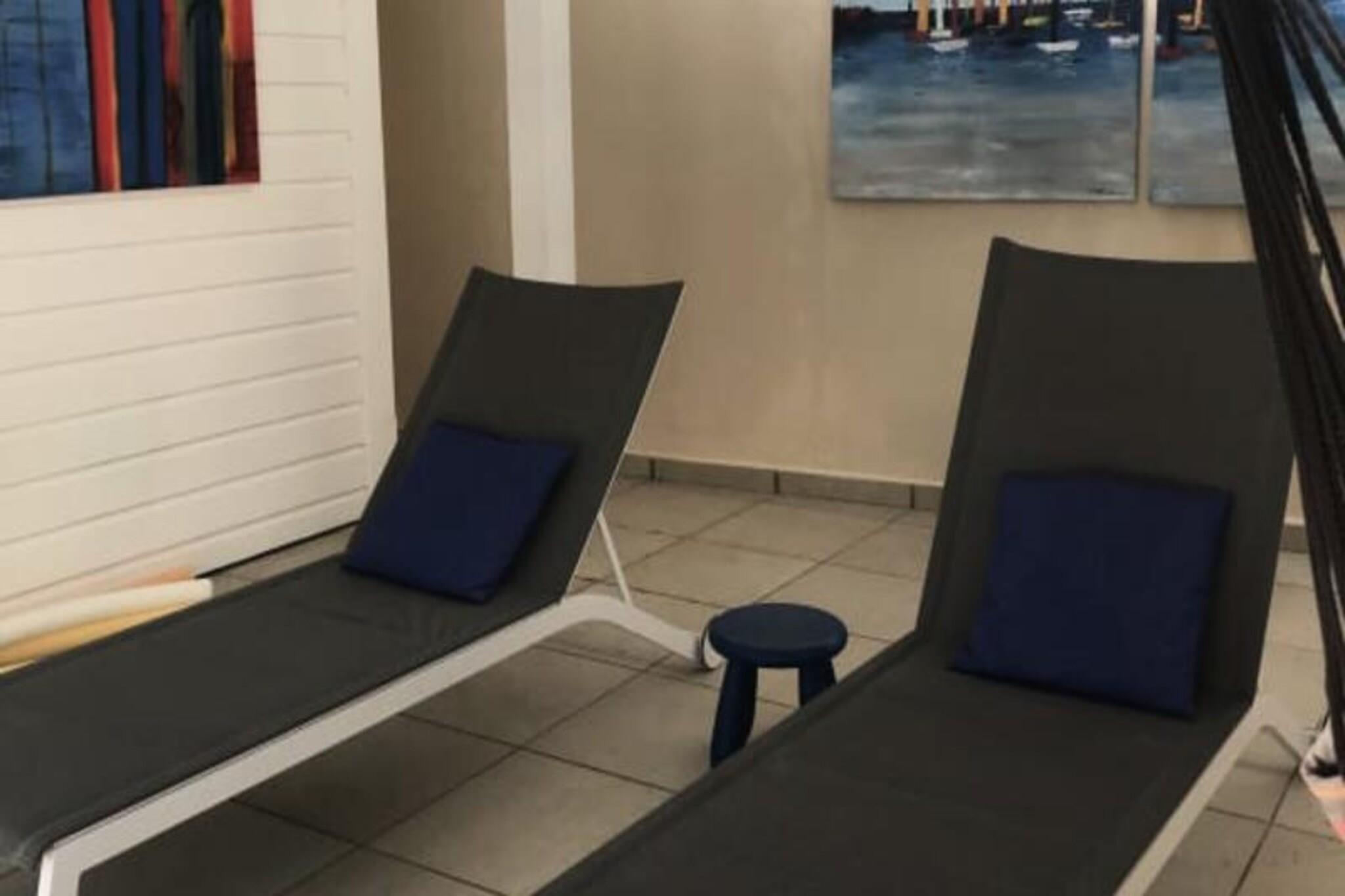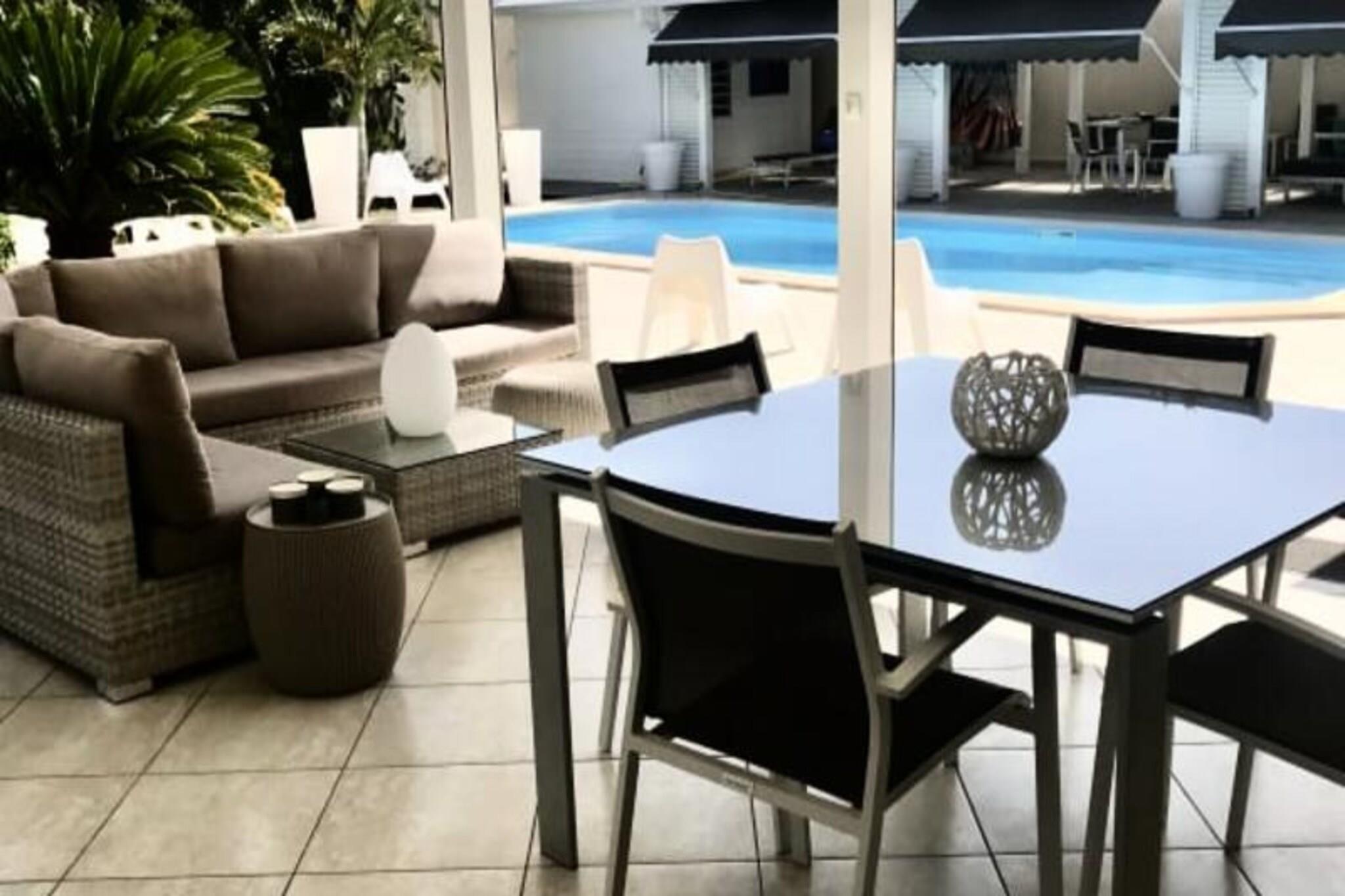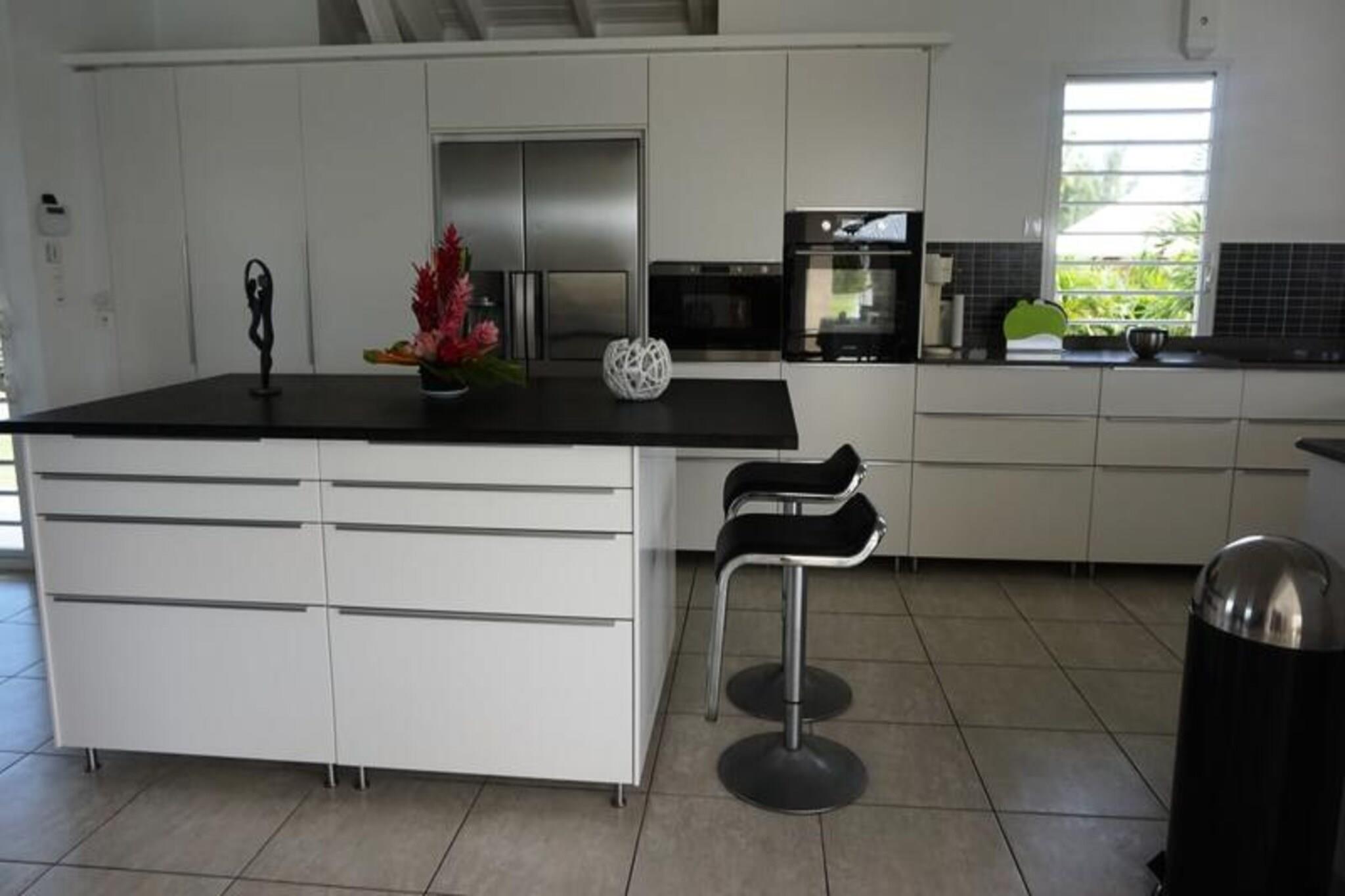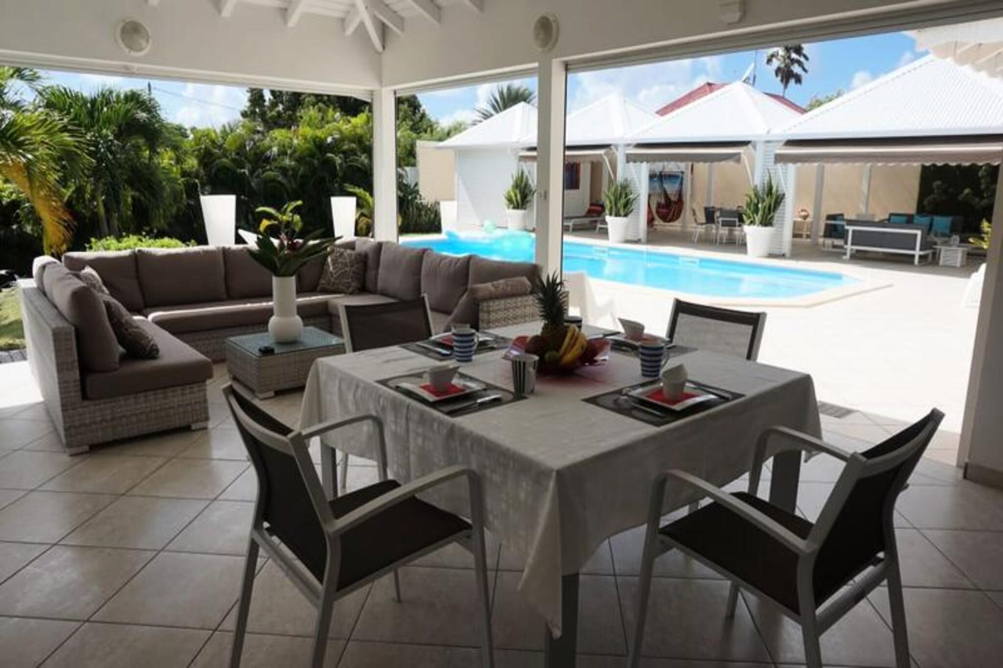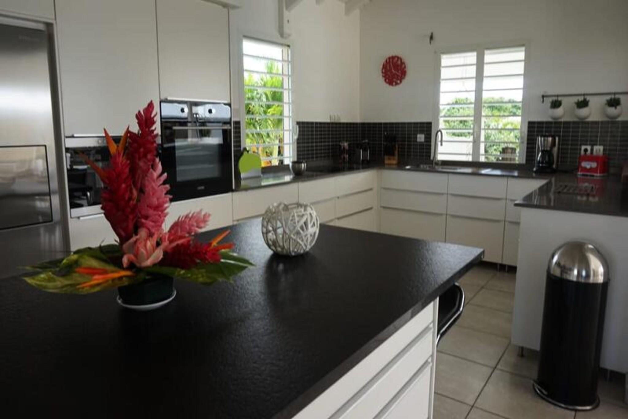 Denne luksuriøse villa er en sand tropisk oase, og byder på tre soveværelser med aircondition og sengetøj i topkvalitet (to 160 cm senge og to 90 cm senge), hvilket sikrer et afslappende ophold. Villaen indeholder to uberørte badeværelser og to toiletter. De rummelige udendørsarealer er ideelle til afslapning og har flere terrasser, to lounger og et udendørs køkken, hvilket gør det perfekt til udendørs spisning og socialt samvær. Du vil have adgang til en privat swimmingpool omgivet af frodige tropiske grønne områder, med masser af plads til at slappe af og nyde solen. Villaen ligger kun 10 minutters gang fra den smukke Anse des Rochers-strand og tilbyder nem adgang til lokale attraktioner. Centrum af Saint-François ligger kun 5 minutter væk i bil, hvor du finder supermarkeder, bagerier, markeder og andre vigtige faciliteter. Derudover er du i gåafstand til Saint-François Marina, der er kendt for sine restauranter, butikker og pulserende atmosfære. Villaen ligger også tæt på Saint-François International Golf Course, kasinoet og Aerodrome. Villaens interiør inkluderer et fuldt udstyret køkken, både indendørs og udendørs, med kvalitetsapparater og et ventilationssystem for maksimal komfort. Et vandreservesystem sikrer, at du altid er forsynet med vand. Ejendommen er udstyret med højhastighedsinternet, og dit ophold inkluderer rengøring før og efter dit besøg. En dedikeret concierge er tilgængelig for at imødekomme dine behov og hjælpe med udflugter, leje af køretøjer og særlige ønsker, hvilket sikrer et personligt og enestående ophold.