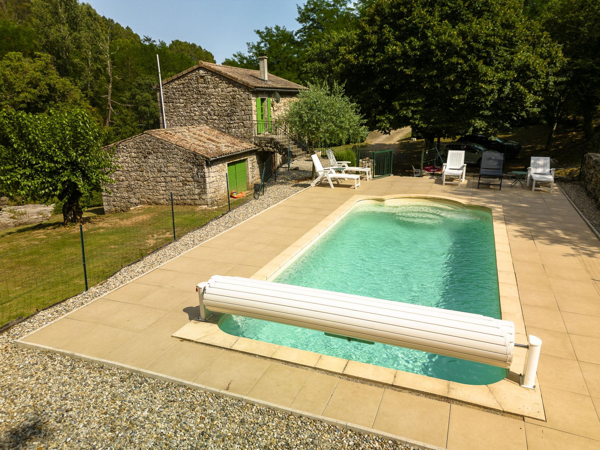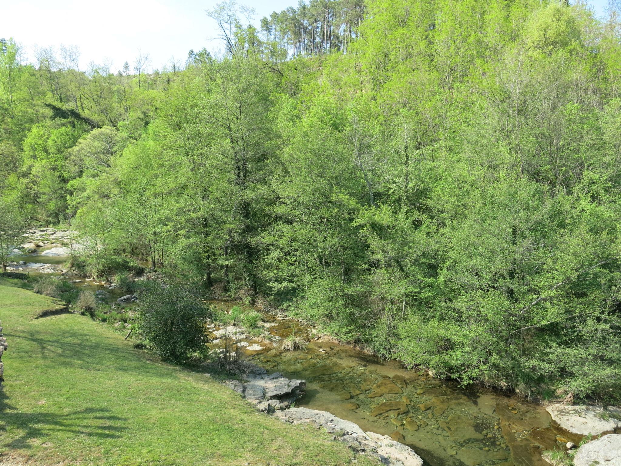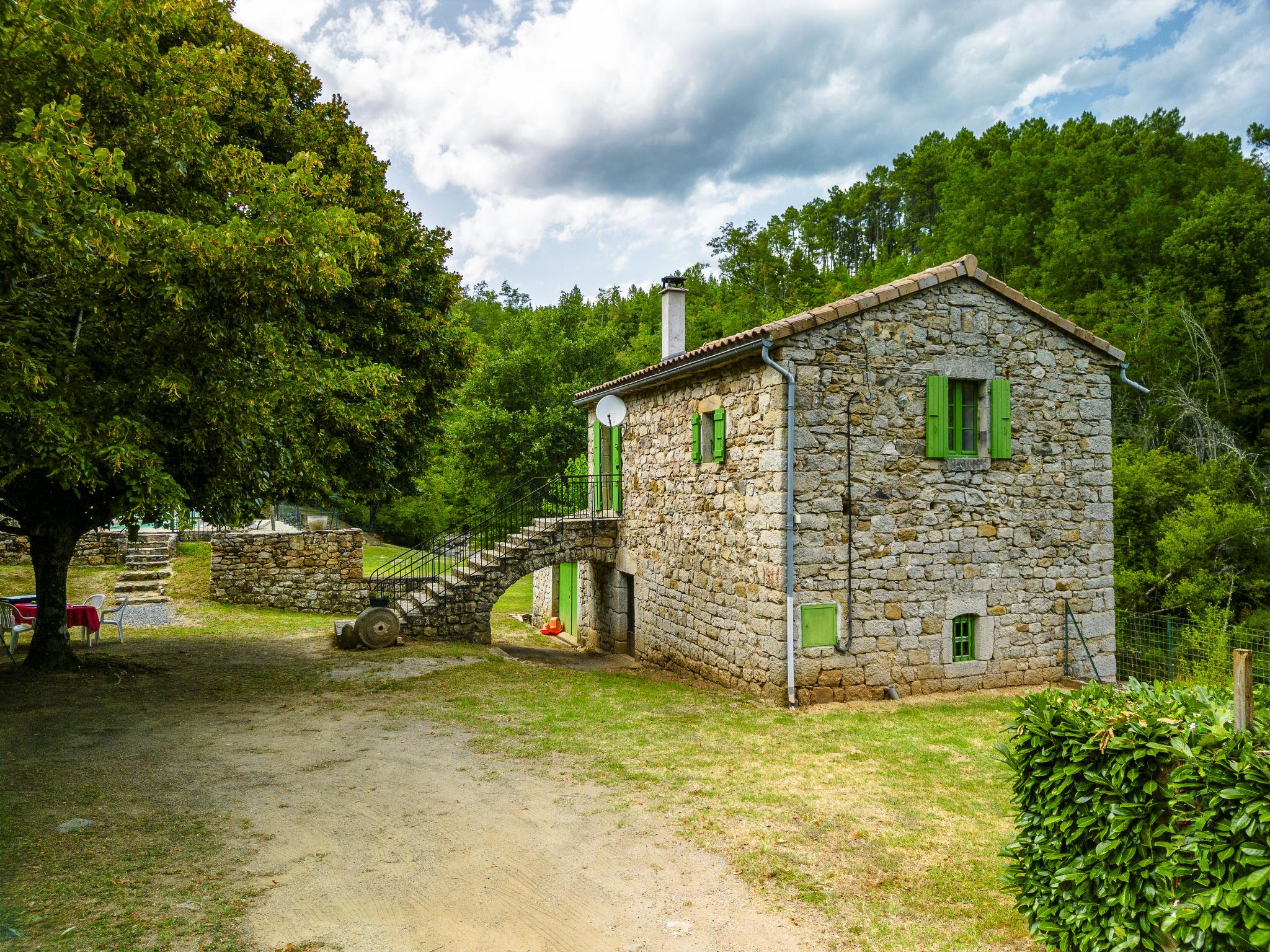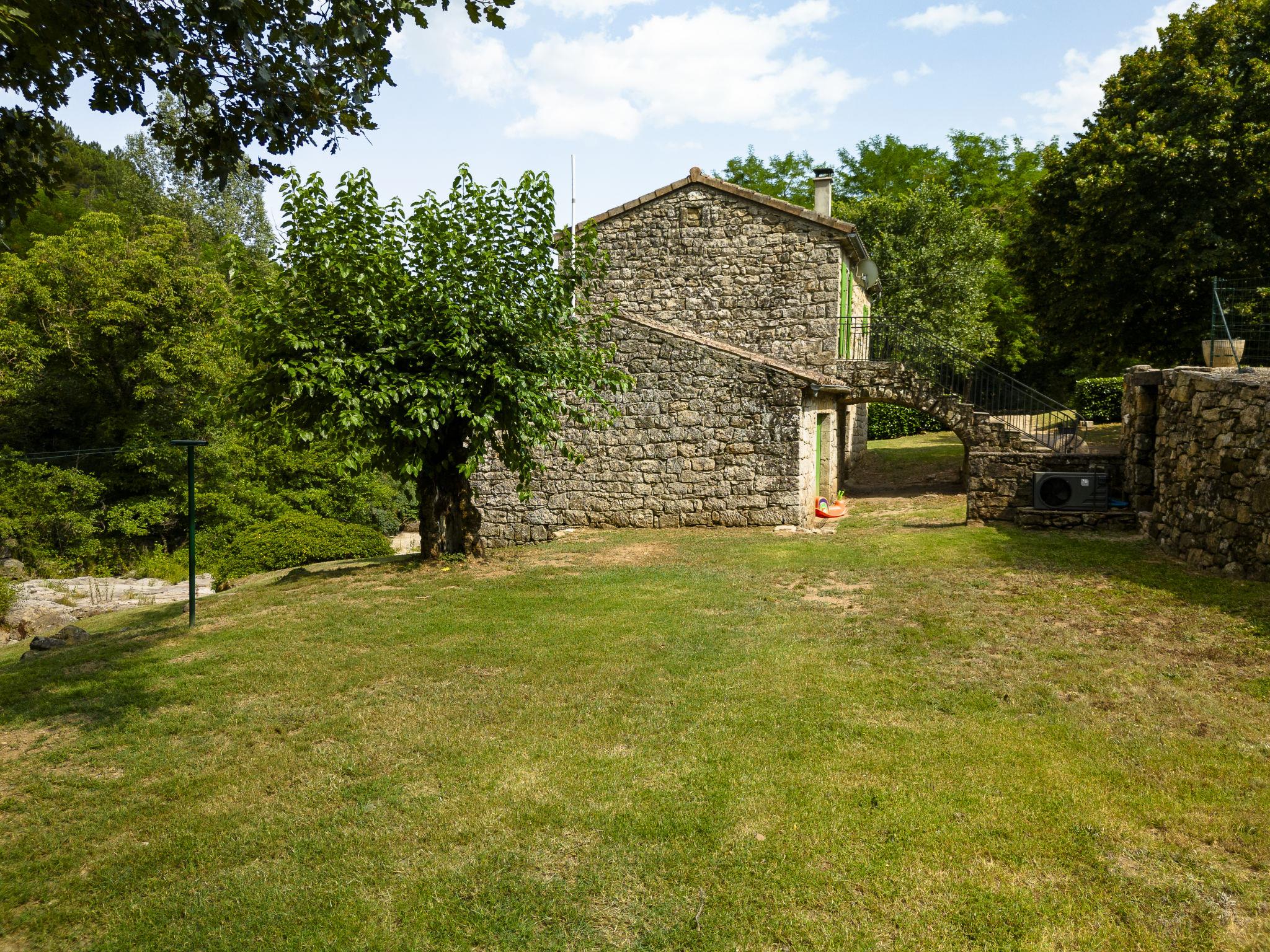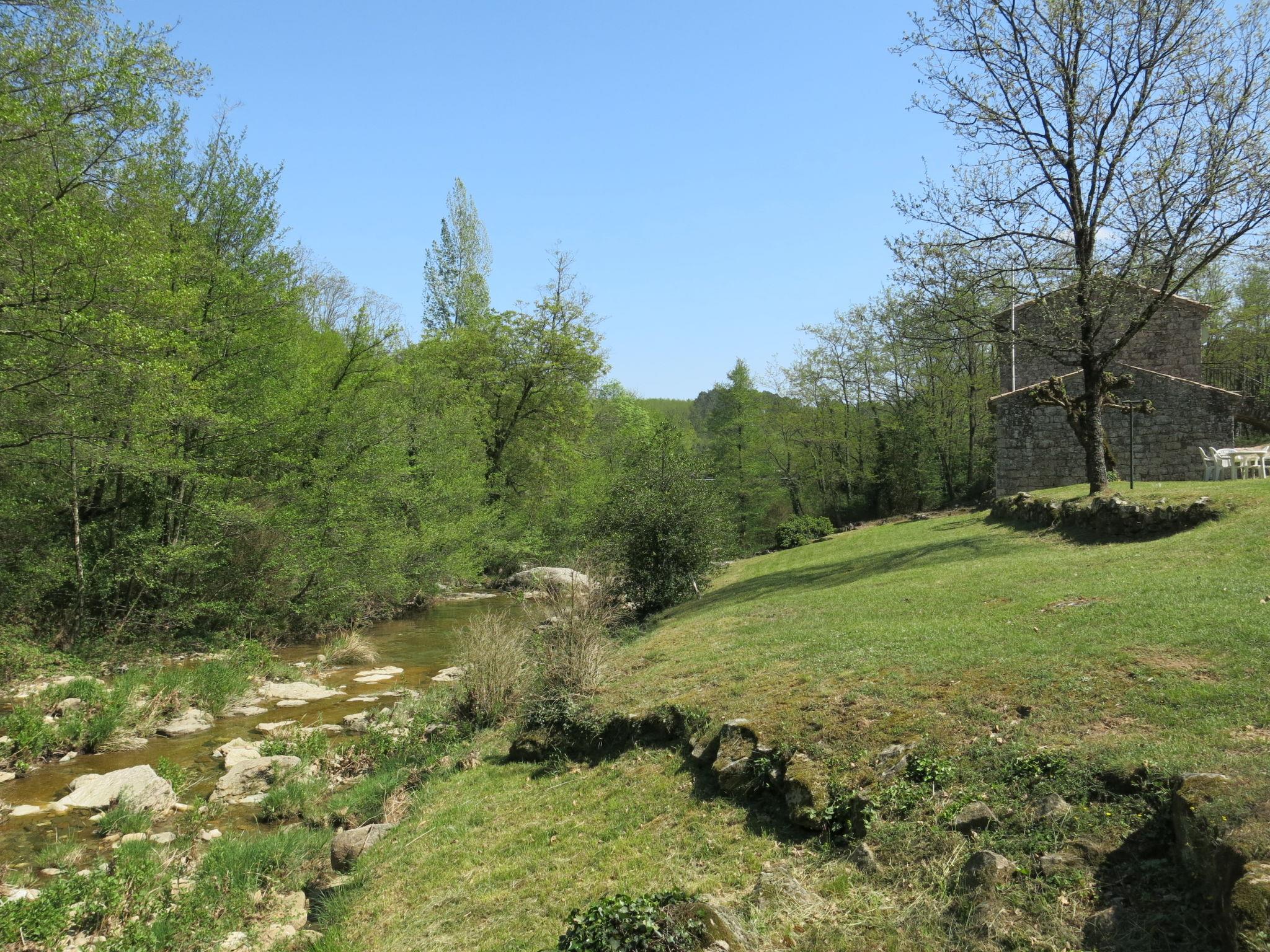 The river can run dry during the hottest periods. Cosy, rustic, historical windmill "Le Moulin", surrounded by trees. 500 m from the centre of St. Genest-de-Beauzon, 3 km from the centre of Lablachère, 25 km from the centre of Vallon Pont d'Arc, in a secluded, sunny position on a slope, in a cul-de-sac, in the woods. Private: property 1 ha (fenced) with trees, meadow, swimming pool heated, fenced (8 x 4 m, depth 140 cm, seasonal availability: 29.Apr. - 15.Oct.) with shutter cover. In the house: storage room for bicycles. Motor access (50 m via unmade road). Parking (for 2 cars) on the premises, single garage. Shop 3 km, supermarket 5 km, bus stop "Lablachère centre" 2 km.