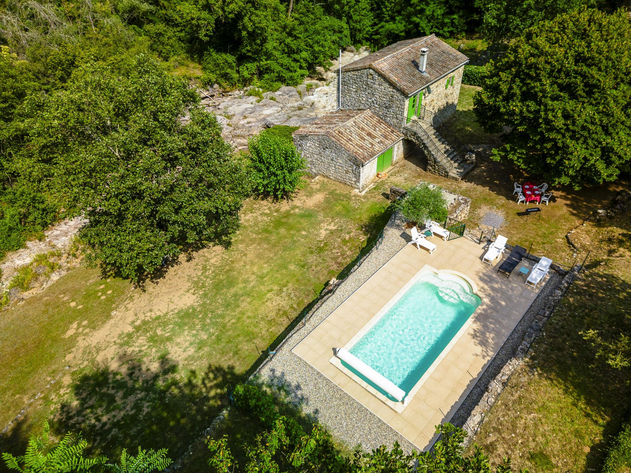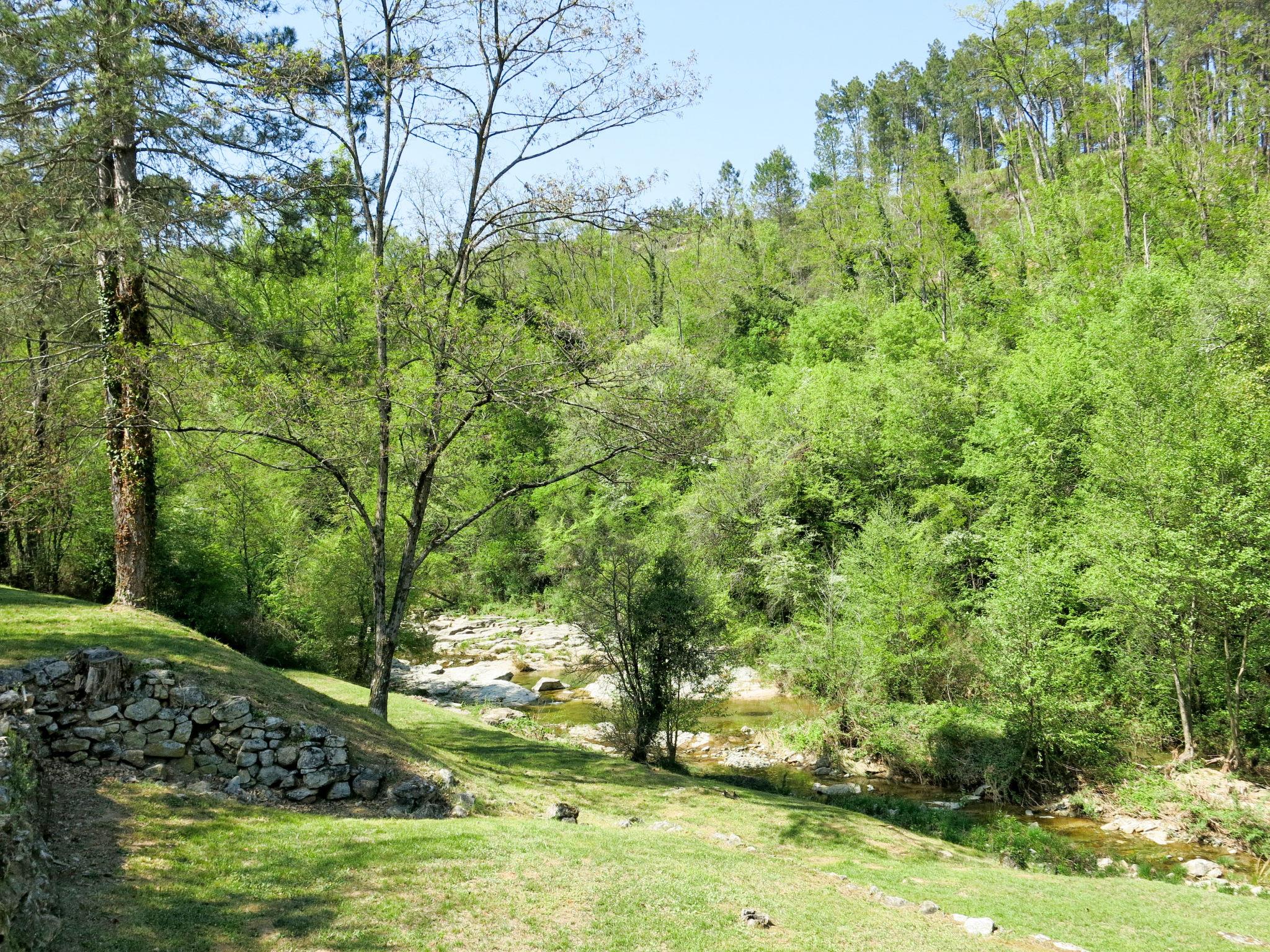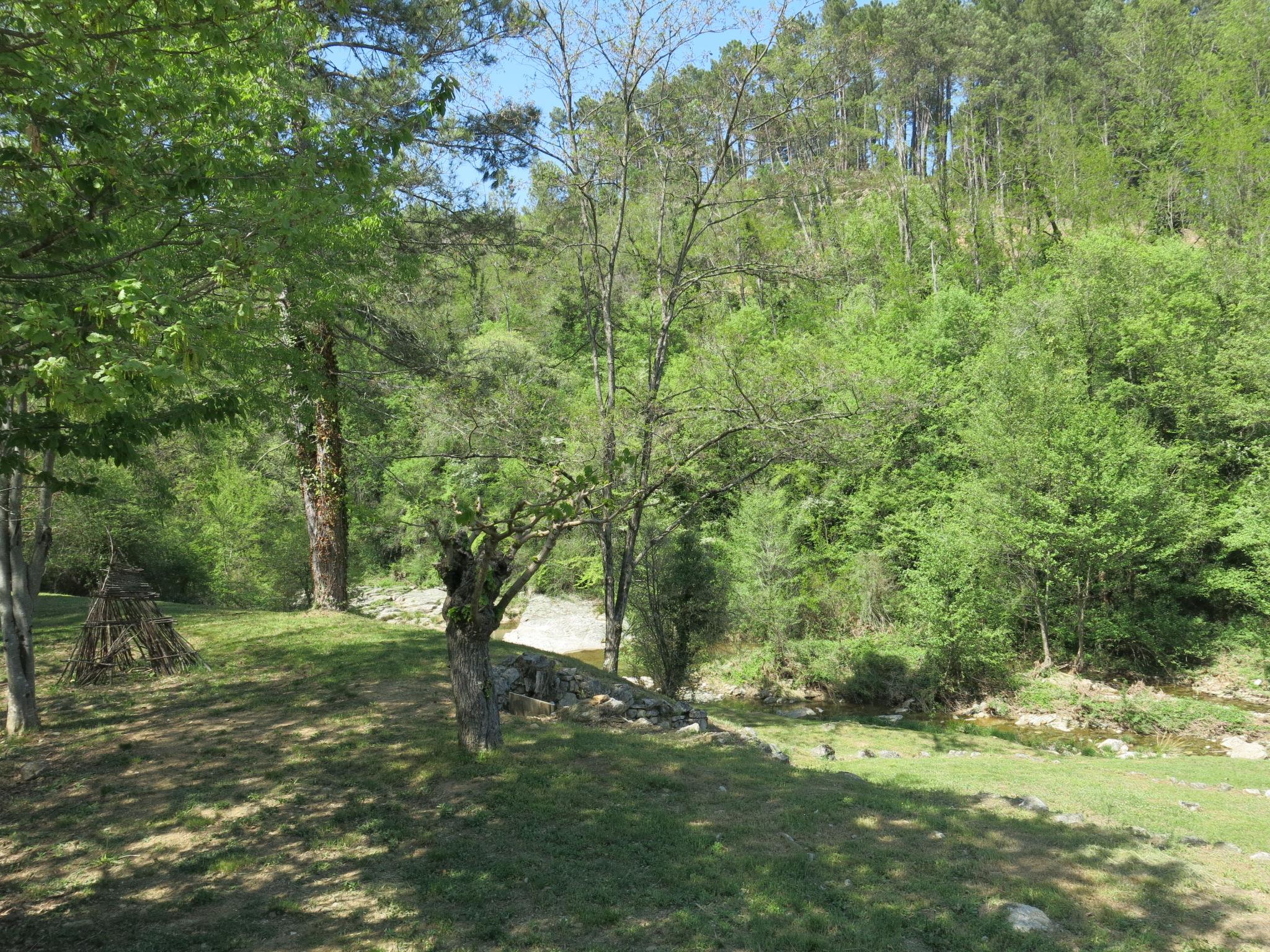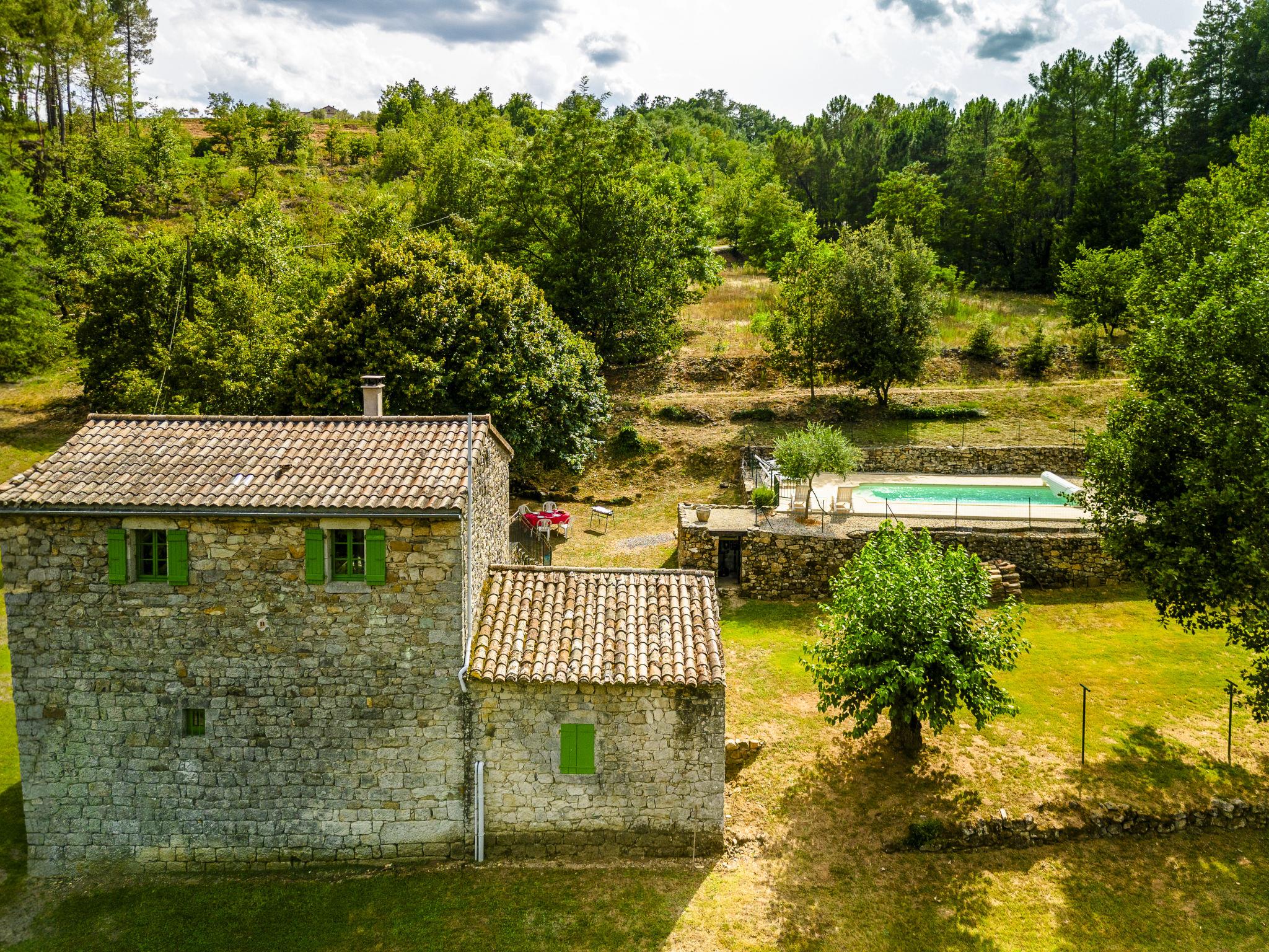 The river can run dry during the hottest periods. Cosy, rustic, historical windmill "Le Moulin", surrounded by trees. 500 m from the centre of St. Genest-de-Beauzon, 3 km from the centre of Lablachère, 25 km from the centre of Vallon Pont d'Arc, in a secluded, sunny position on a slope, in a cul-de-sac, in the woods. Private: property 1 ha (fenced) with trees, meadow, swimming pool heated, fenced (8 x 4 m, depth 140 cm, seasonal availability: 29.Apr. - 15.Oct.) with shutter cover. In the house: storage room for bicycles. Motor access (50 m via unmade road). Parking (for 2 cars) on the premises, single garage. Shop 3 km, supermarket 5 km, bus stop "Lablachère centre" 2 km.
