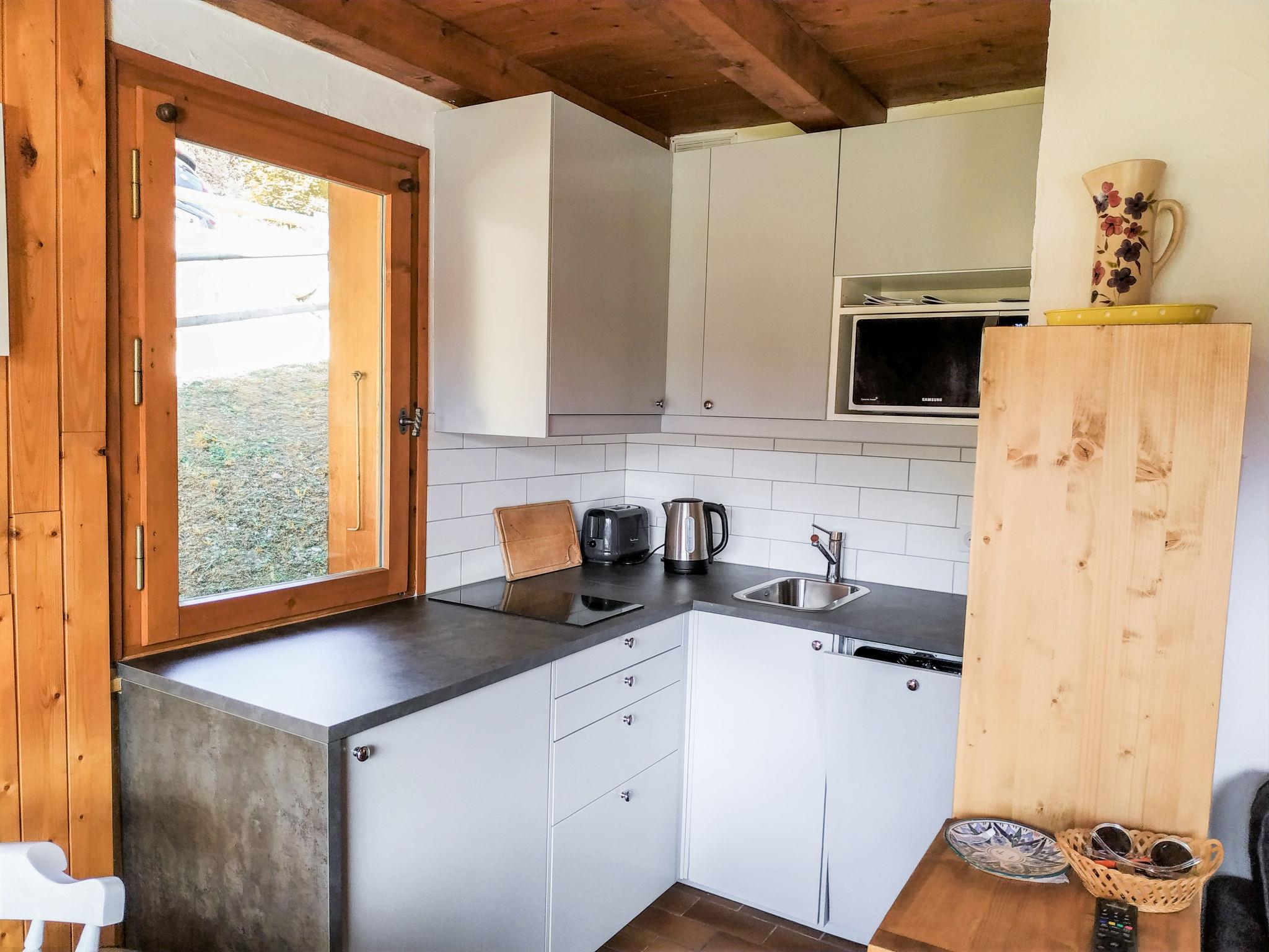 2-room apartment 33 m2 on 1st floor. Entrance hall with 1 x 2 bunk beds. 1 room with 1 french bed. Living/dining room with TV and DVD. Exit to the balcony. Kitchenette (2 ceramic glass hob hotplates, toaster, kettle, microwave, electric coffee machine, raclette grill) with dining table. Bathroom, sep. WC. Electric heating. Balcony furniture. View of the mountains. Facilities: Internet (WiFi, extra). Please note: fridge without freezer, non-smokers only.
