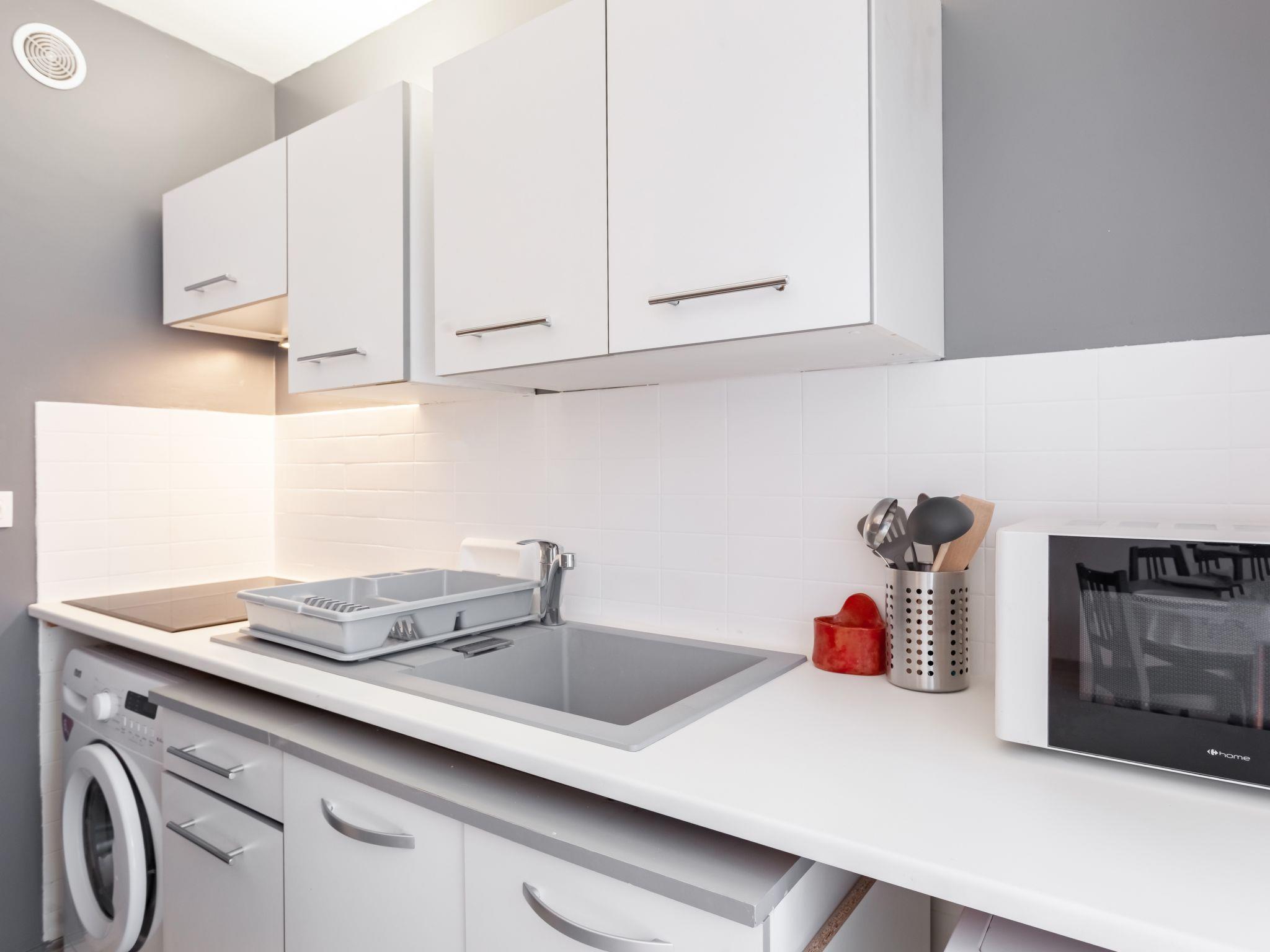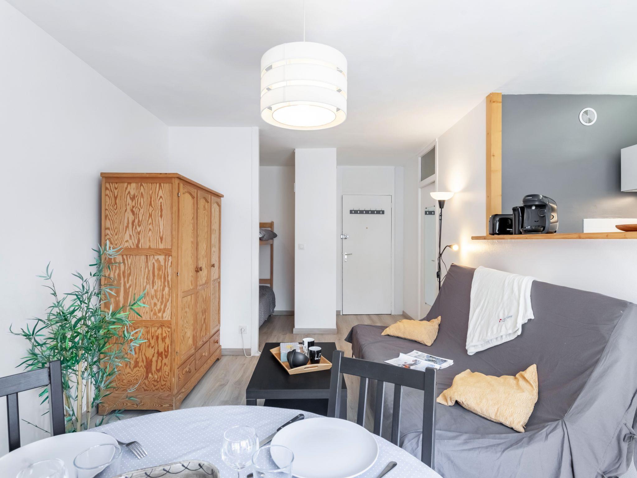 "Castel des roches A36", 1-room studio 20 m2 on 3rd floor. Living/dining room with 1 sofabed (140 cm, length 190 cm), dining table and TV (flat screen). Exit to the balcony. Alcove with 1 x 2 bunk beds (80 cm, length 190 cm). Open kitchen (4 ceramic glass hob hotplates, toaster, kettle, electric coffee machine, combination microwave). Bath/WC. Heating. Small balcony 3 m2, south-west facing position. View of the mountains. Facilities: washing machine. Internet (WiFi, extra). Parking (1 car). Please note: TV only FR. Smoke alarm. Instead of an enclosed bedroom, some sleeping areas are located in an open-plan area (gallery, alcove, etc.). Offer by a private individual according to Art. 155, IV of CGI.