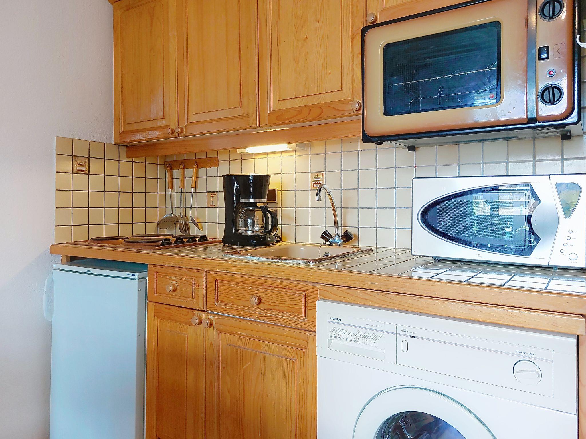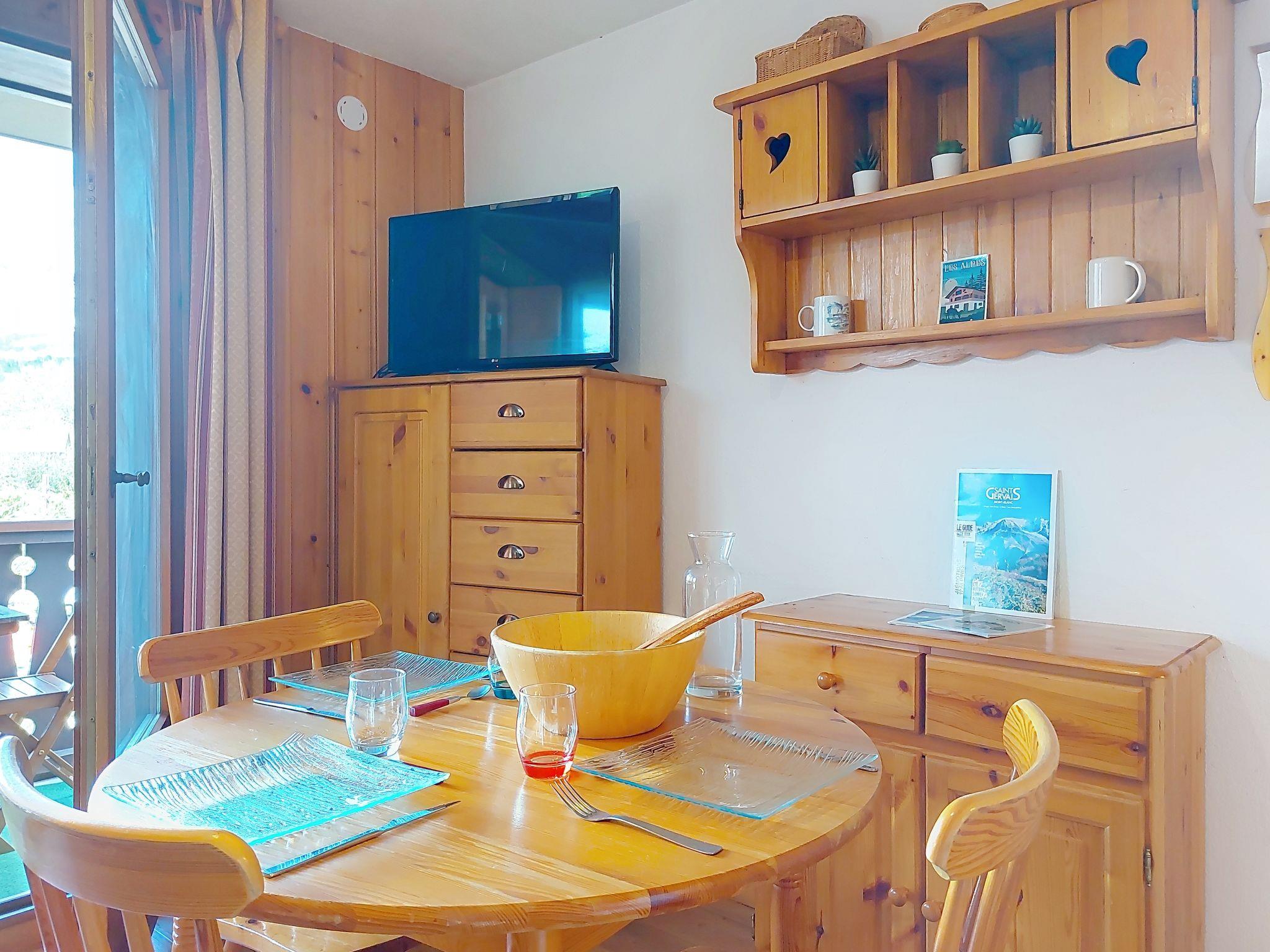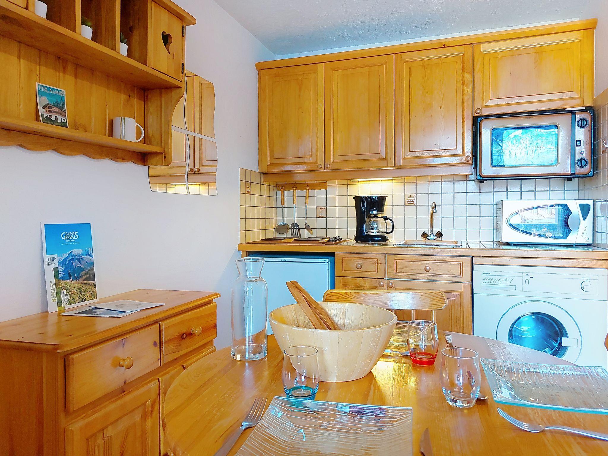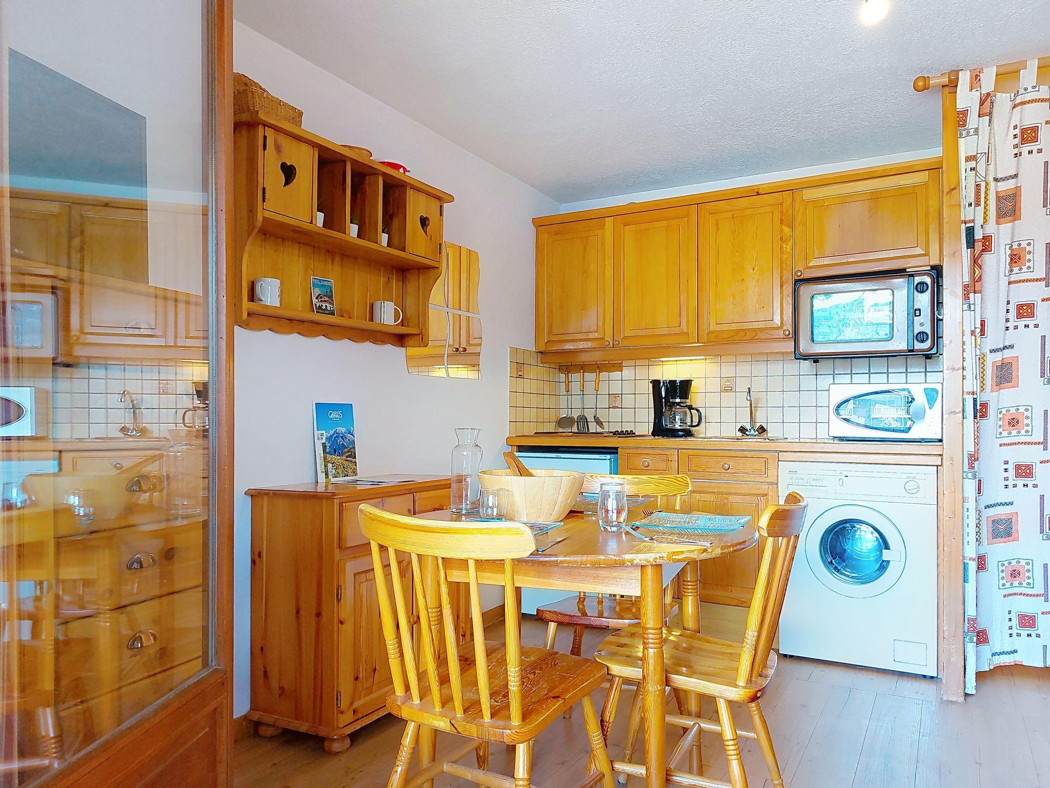 "La pointe des Aravis 3", 1-room studio 20 m2 on 1st floor. Entrance hall with 1 wall-trunk bed (90 cm, length 190 cm). Living/dining room with 1 double sofabed (140 cm), TV and flat screen. Exit to the balcony. Kitchenette (mini-oven, toaster, kettle, electric coffee machine). Bathroom, sep. WC. Electric heating. Balcony, north facing position and, east facing position. Beautiful view of the mountains. Facilities: washing machine. Internet (WiFi, extra). Please note: non-smokers only. 1 small pet/ dog allowed. TV only FR. Smoke alarm, no lift.