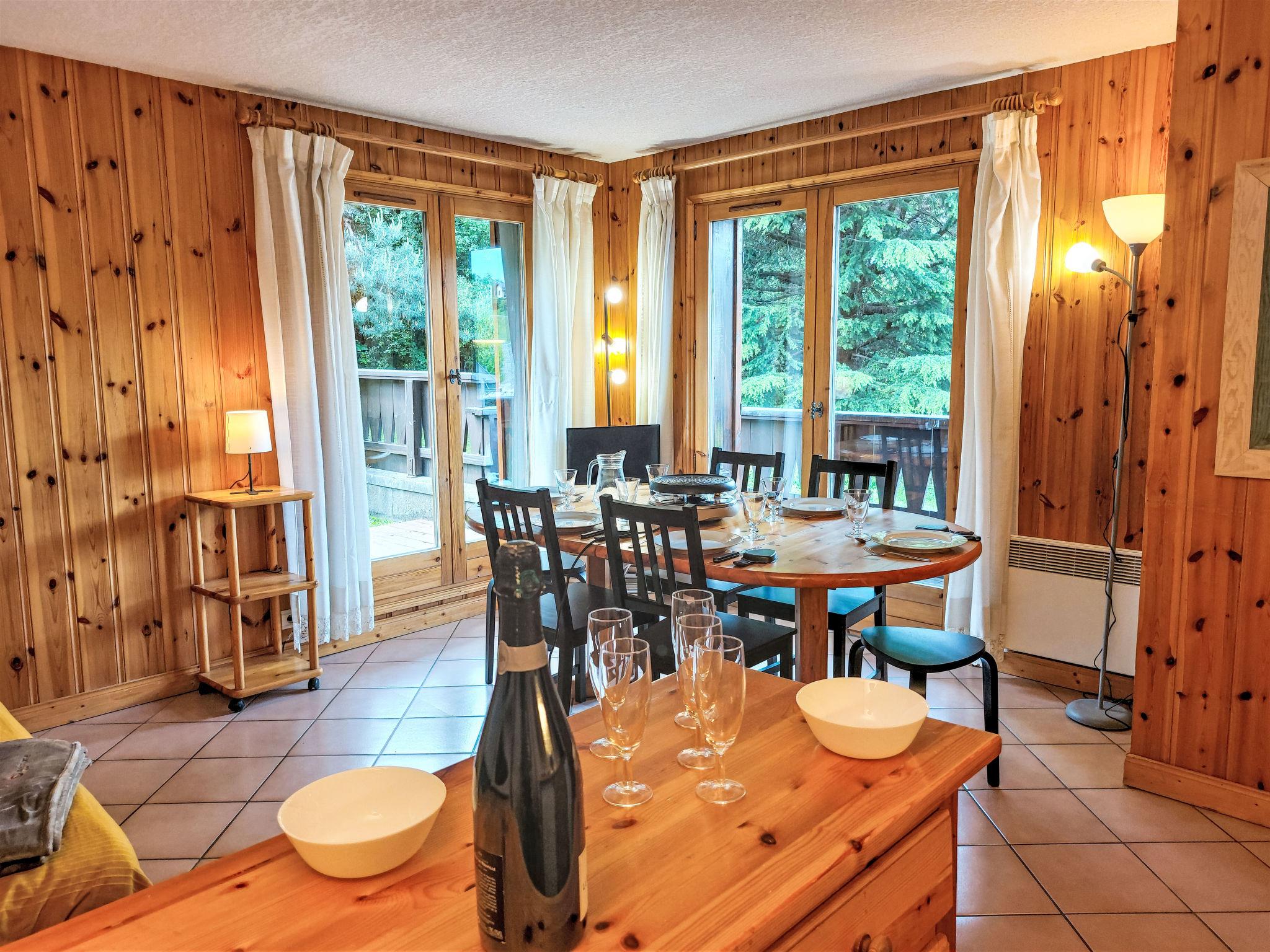 "Jardins Alpins 8", 3-room apartment 53 m2 on 1st floor. Living/dining room with 1 double sofabed (140 cm), TV. Exit to the balcony, to the terrace, south facing position and west facing position. 1 small room with 1 x 2 bunk beds (90 cm). Exit to the terrace. 1 room with 1 french bed (2 x 80 cm). Exit to the terrace. Open kitchen (4 hot plates, oven, dishwasher, toaster, kettle, electric coffee machine, raclette grill, combination microwave, fondue Set (cheese)). Bathroom, sep. WC. Electric heating. Small balcony, large terrace, patio. View of the mountains. Facilities: Internet (WiFi, extra). Please note: non-smokers only. Maximum 1 pet/ dog allowed. TV only FR. Smoke alarm.