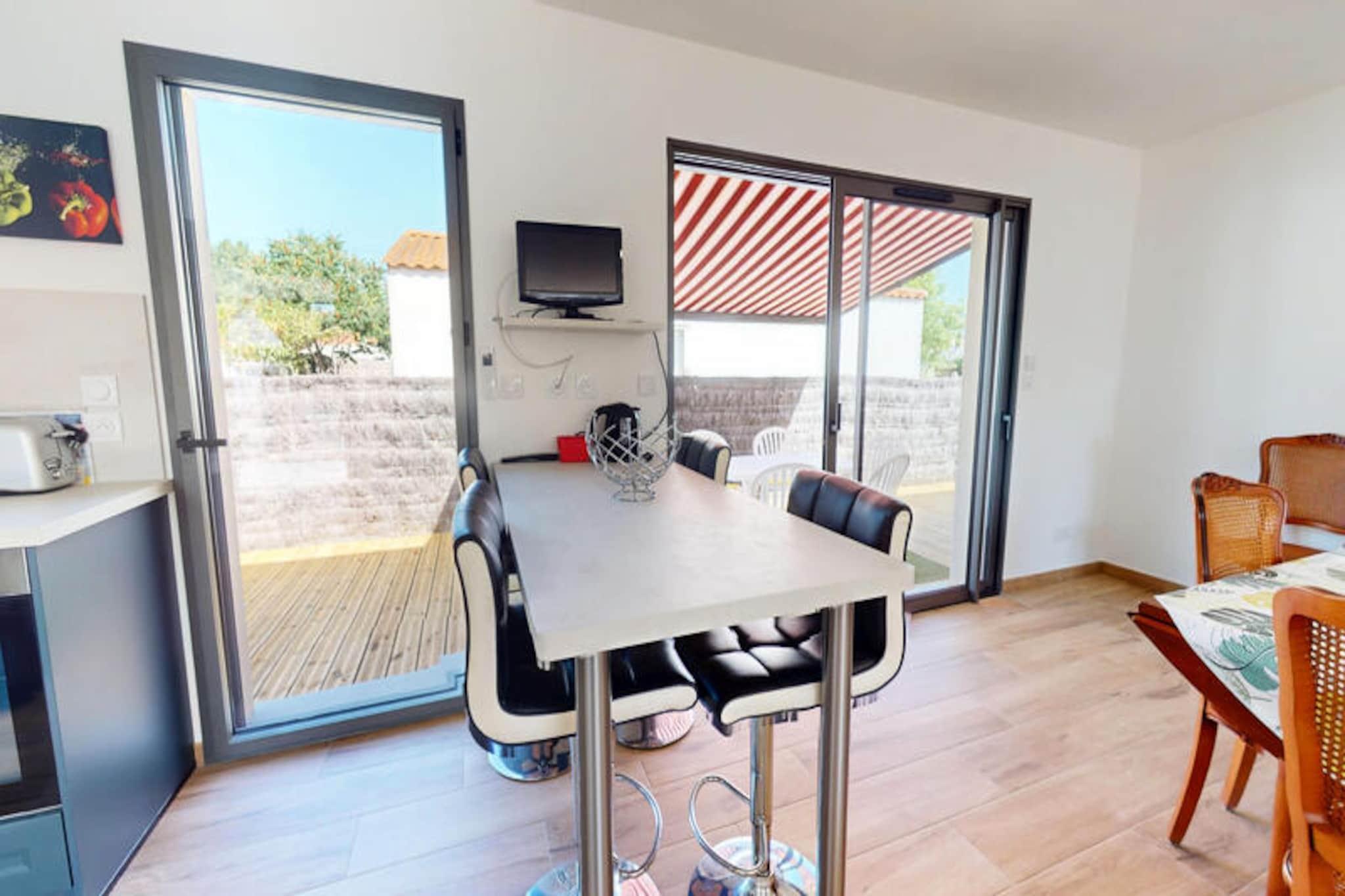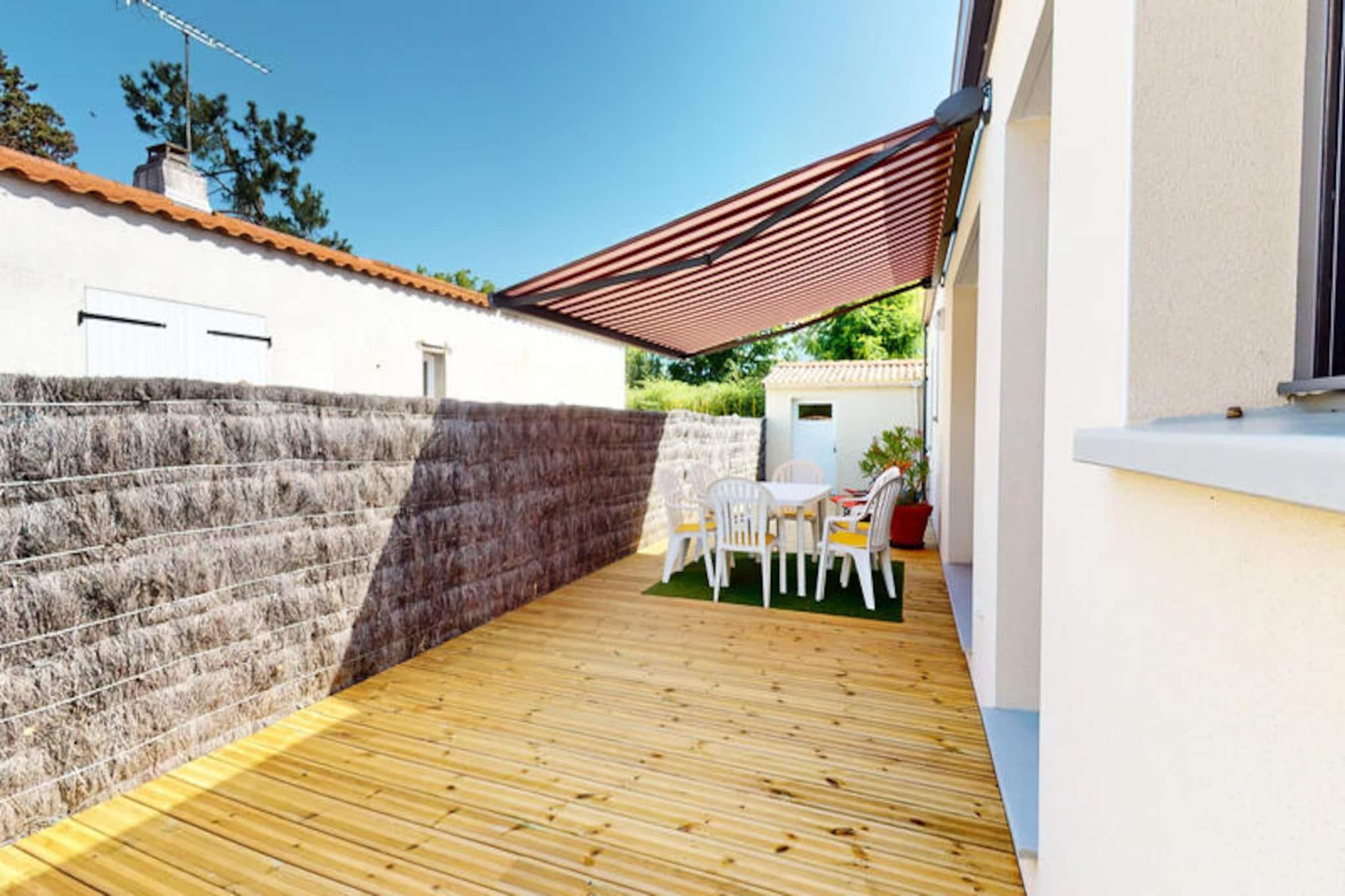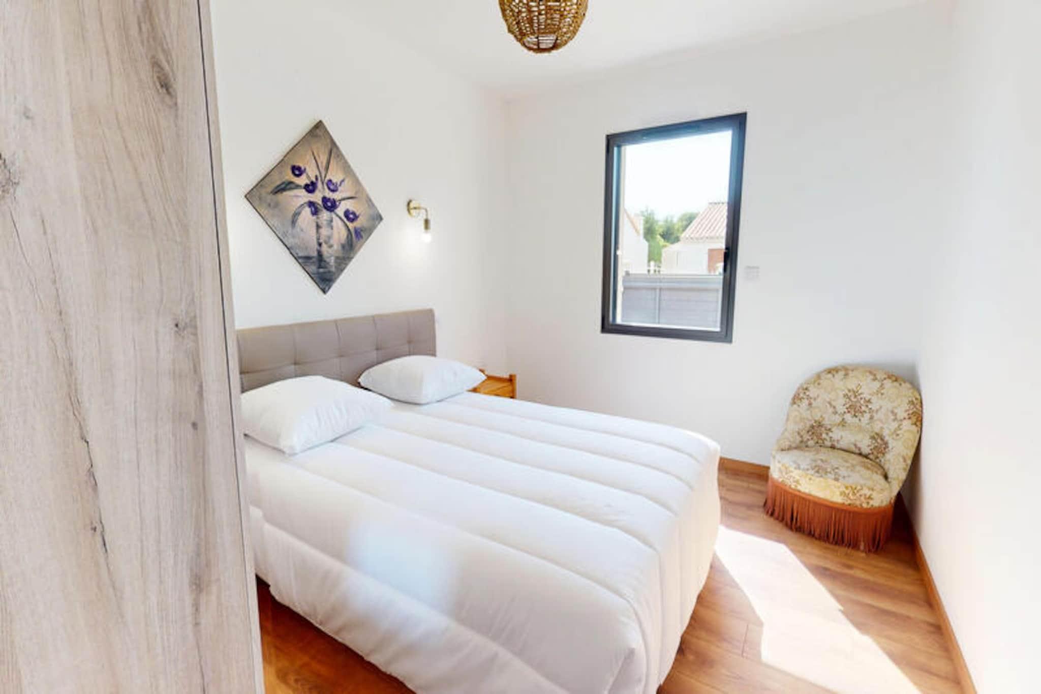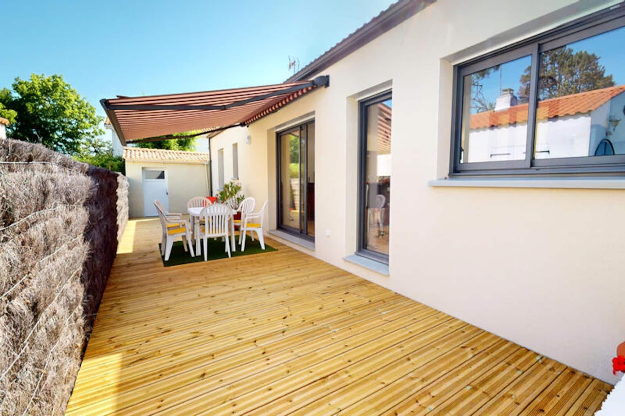 På den solbeskinnede Vendée-kyst tilbyder Casa Natura en harmonisk blanding af moderne komfort og naturlig ro. Dette indbydende hjem i Saint-Hilaire-de-Riez er perfekt til familier eller vennegrupper, der søger en afslappende ferie ved havet. Huset er omhyggeligt designet med et moderne præg, hvilket skaber en varm og imødekommende atmosfære under dit ophold.\n\nEjendommen har tre hyggelige soveværelser: et med to enkeltsenge, et andet med en dobbeltseng og et tredje med en enkeltseng, hvilket sikrer fleksible sovepladser til op til fem gæster. Den rummelige opholdsstue omfatter en komfortabel stue med tv, en spisestue og et stilfuldt siddeområde med høje borde og skamler i nærheden af ??det fuldt udstyrede køkken. Udenfor venter en stor terrasse med en elektrisk markise, liggestole og et havebord og stole, perfekt til at nyde måltider under åben himmel eller blot nyde kystsolen. En sikker garage er også tilgængelig for din bekvemmelighed.\n\nCasa Naturas beliggenhed er ideel til at udforske det bedste af Saint-Hilaire-de-Riez og omegn. Gå en tur langs de nærliggende sandstrande, cykl gennem maleriske fyrreskove, eller besøg de travle lokale markeder. For familiesjov ligger forlystelsesparken Atlantic Toboggan og Dino's Park kun en kort køretur væk. Vandsportsentusiaster vil elske Sion vandsportscenter, mens den charmerende havn i Saint-Gilles-Croix-de-Vie tilbyder et dejligt sted for en afslappet dagstur. Gå ikke glip af chancen for at udforske den fortryllende ø Noirmoutier, en sand perle i regionen.\n\nUanset om du søger eventyr eller ro, er Casa Natura den perfekte base for en uforglemmelig kystferie. Med sine moderne faciliteter og førsteklasses beliggenhed er det et paradis, hvor dyrebare minder skabes.