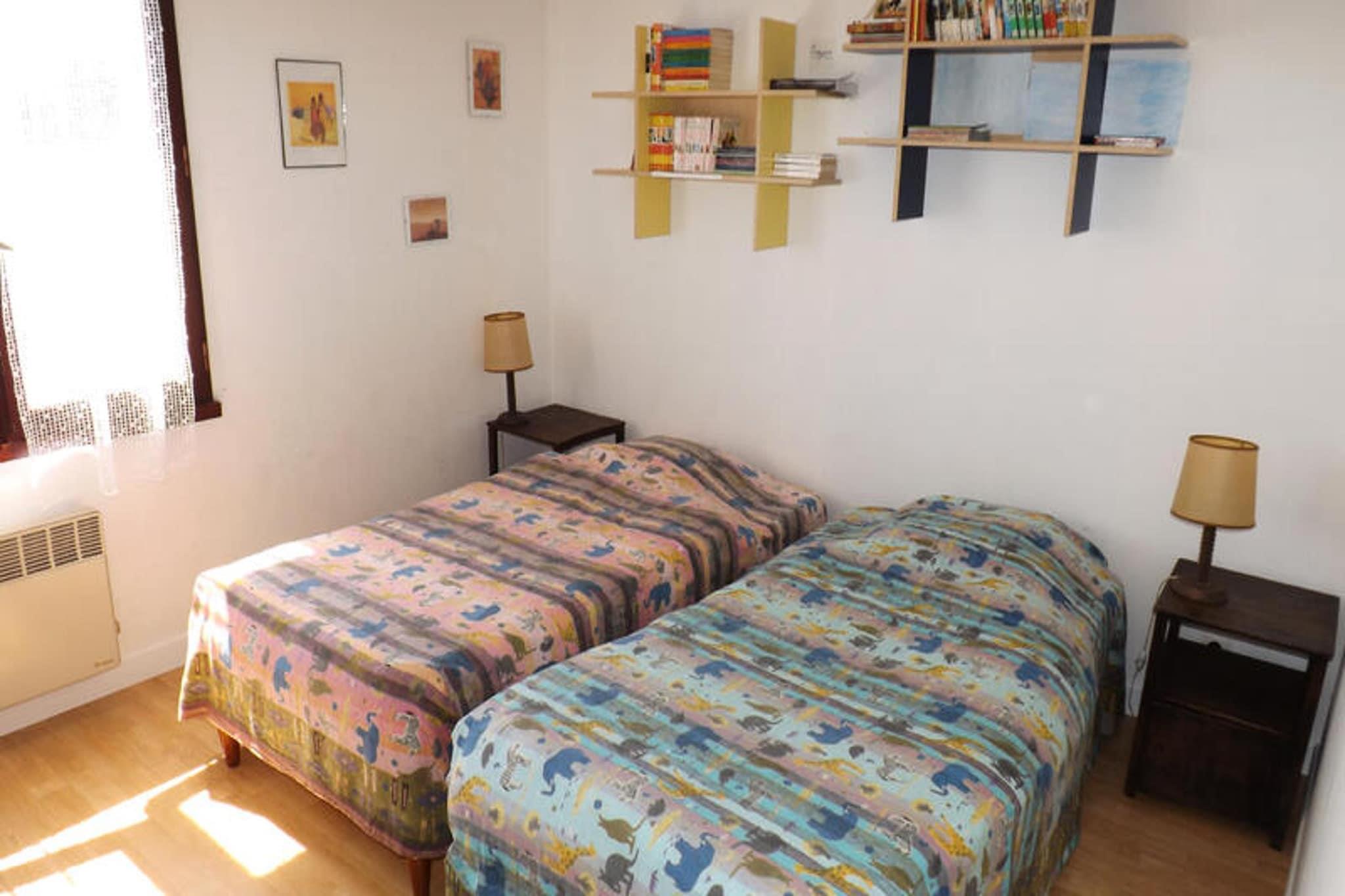 Dette rummelige feriehus, beliggende i Saint Gilles kommune, ligger kun 400 meter fra Boisvinet Strand og tilbyder et behageligt ophold for op til 6 personer. Det har tre soveværelser, hvoraf et værelse tilbyder en 140 cm seng, et andet med to 90 cm senge og et tredje med en 140 cm seng. Ejendommen tillader ikke kæledyr og inkluderer sengelinned for din bekvemmelighed. Der er parkering på gaden til din bil. Ejendommen er perfekt beliggende for udforskning, tæt på lokale caféer, markeder og butikker, hvilket gør det nemt at nyde det bedste fra området. Boisvinet-stranden ligger kun en kort gåtur væk, hvilket giver fredelige og naturskønne omgivelser for dine strandudflugter. Du finder også en række lokale attraktioner, der sikrer, at du kan opleve både afslapning og eventyr under dit ophold. Indvendigt er boligen udstyret med et fuldt funktionelt køkken med komfur, ovn, køle/fryseskab og opvaskemaskine. Stuen byder på rigelig plads med et bord og siddepladser til 6, perfekt til spisning eller afslapning. Der er to bruserum, et på hver etage, sammen med et separat toilet. Yderligere faciliteter inkluderer en vaskemaskine, garageplads og cykelopbevaring.