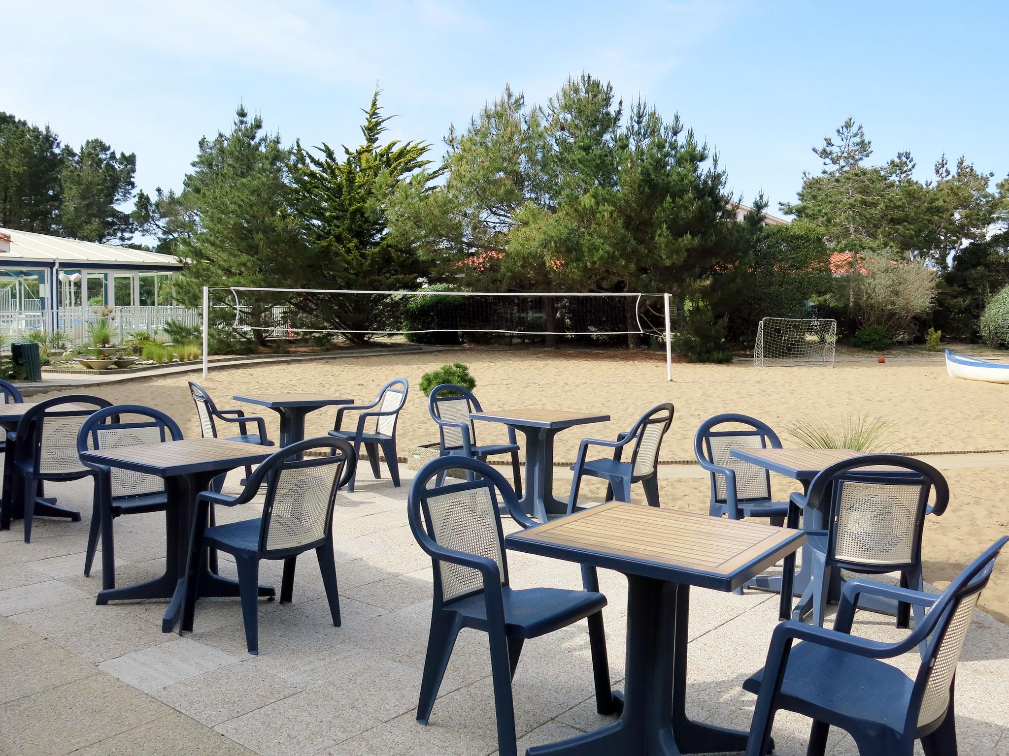 Holiday village "Hameau de l'Océan". 42 houses in the resort. 3 km from the centre of St Hilaire de Riez, 950 m from the sea. For shared use: park 2 ha (fenced) with plants and trees, indoor pool heated, fenced (18 x 8 m, seasonal availability: 03.Apr. - 01.Nov.). Shower/WC in the pool area, tennis, table tennis, basketball, boccia, beach volleyball, barbecue, children's playground. In the complex: reception, bar with TV, WiFi (all included), billiard table, table football, sun terrace, washing machine, tumble dryer (for shared use, extra), bicycle rental. Parking. Shop 3 km, bus stop 3 km, sandy beach 950 m. Nearby attractions: Saint Gilles Croix de Vie 6 km, Saint Jean de Monts 10 km, Ile de Noirmoutier 30 km, Les Sables d'Olonne 38 km, Nantes 70 km. Please note: car-free holiday complex. Entertainment in the season. The photograph shows a typical example.