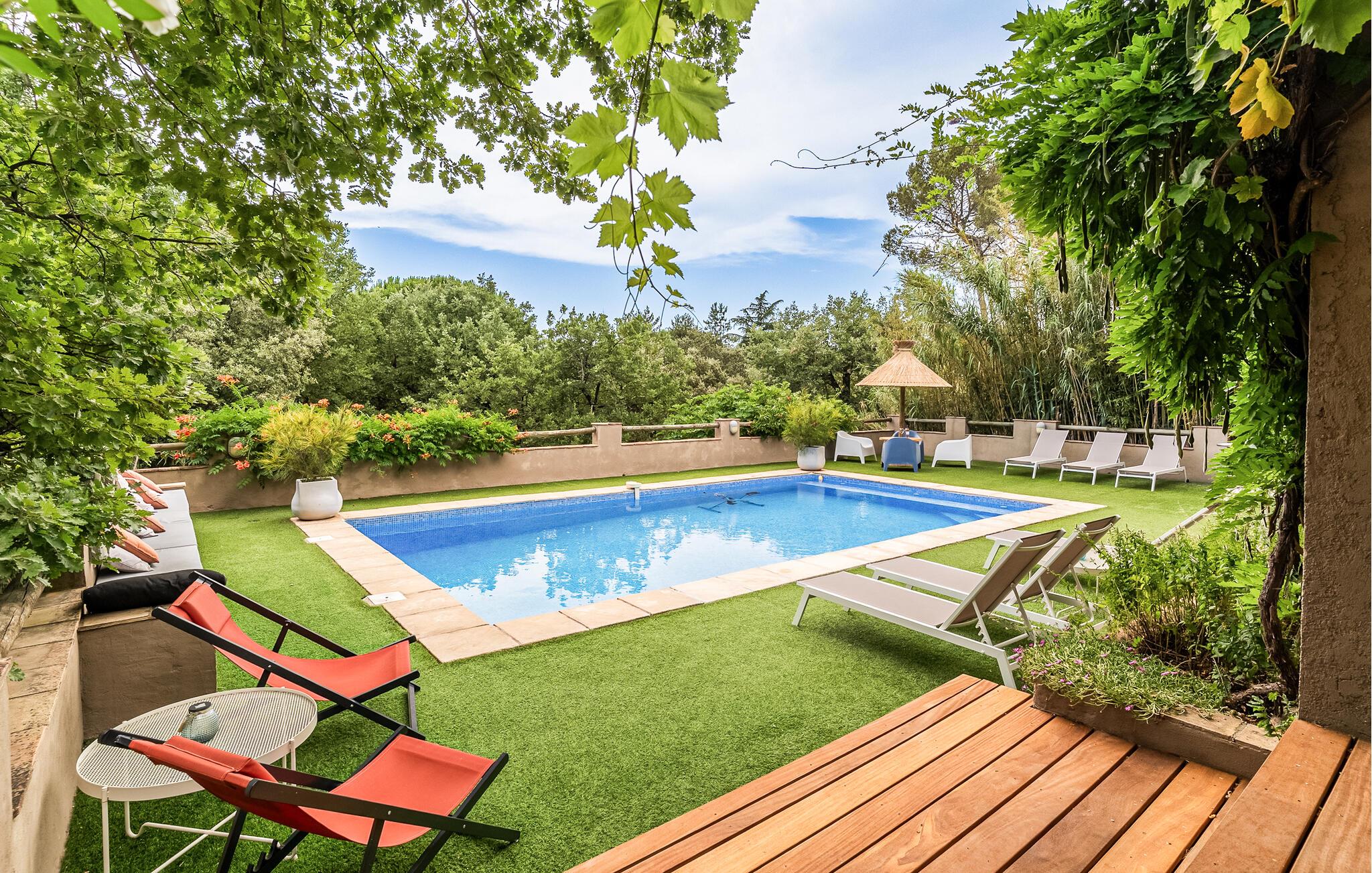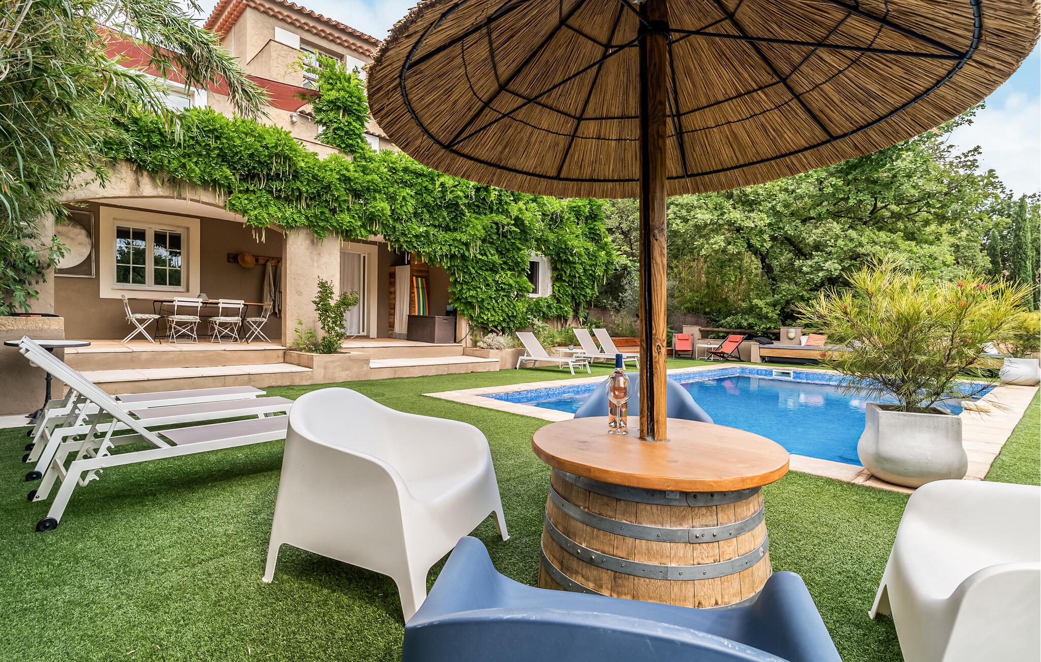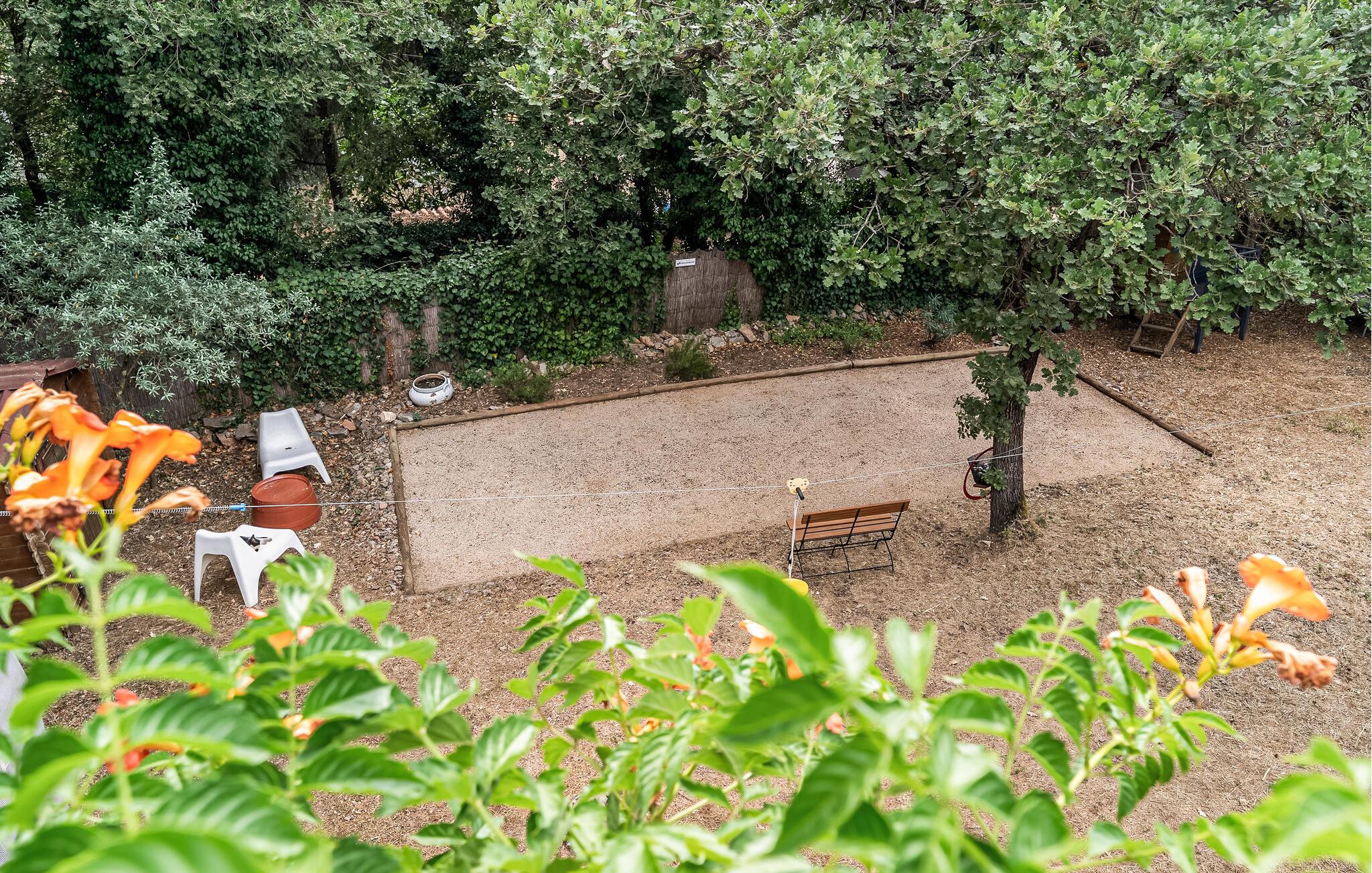 Med en rummelig saltpool, en solterrasse med liggestole og en overdækket terrasse med plancha inviterer ejendommen til at tilbringe afslappende dage udendørs. En petanquebane, en trampolin og en svævebane sørger for underholdning - perfekt for unge og gamle. Den hyggelige opholdsstue i stueetagen og et ekstra studie tilbyder nok plads til familien eller venner.