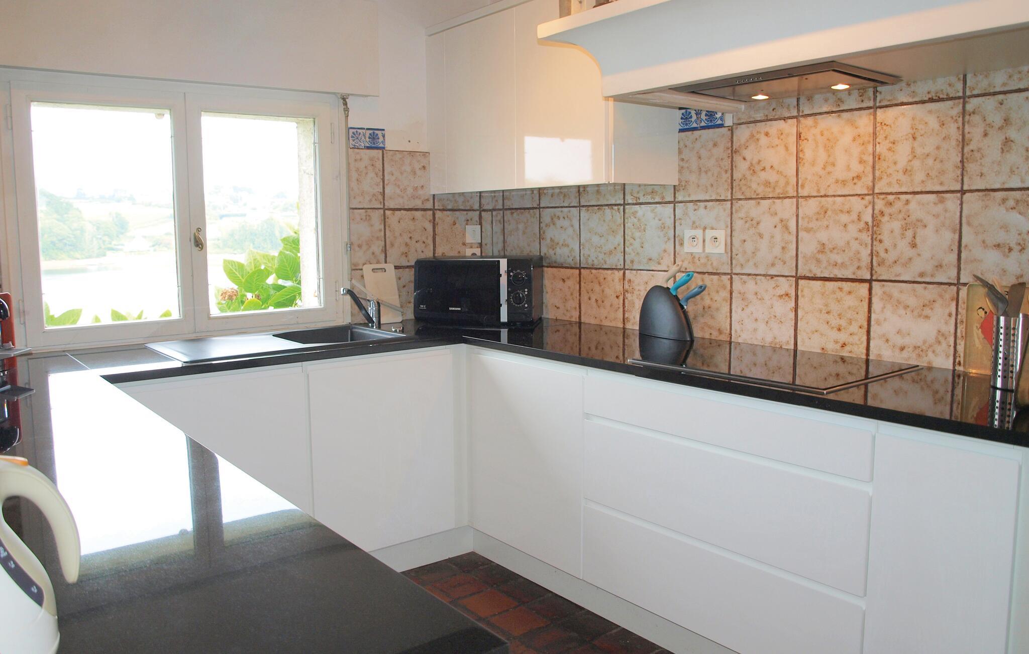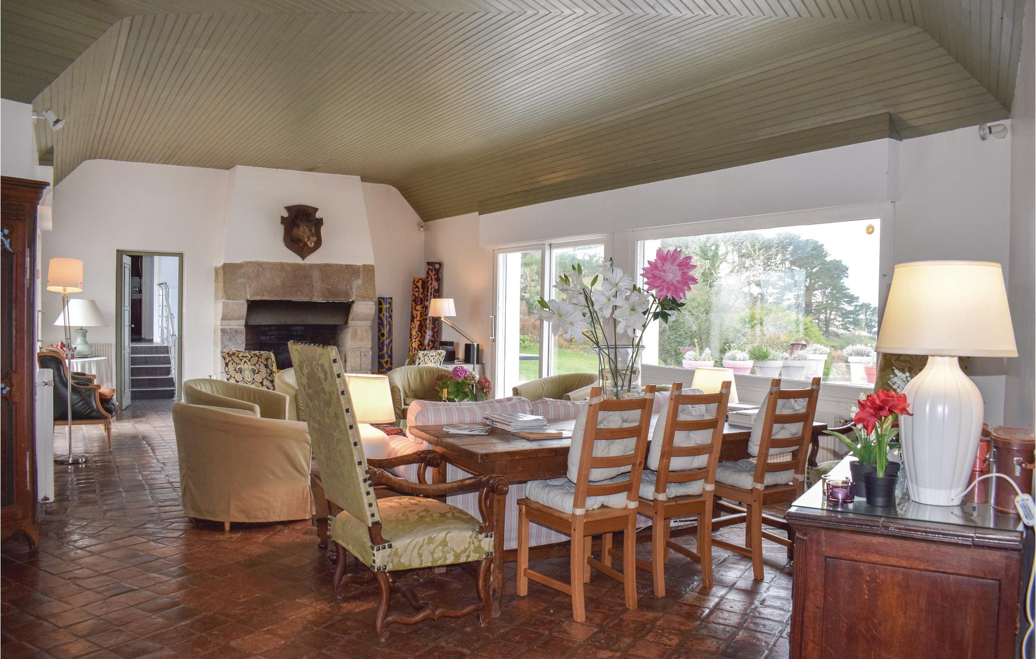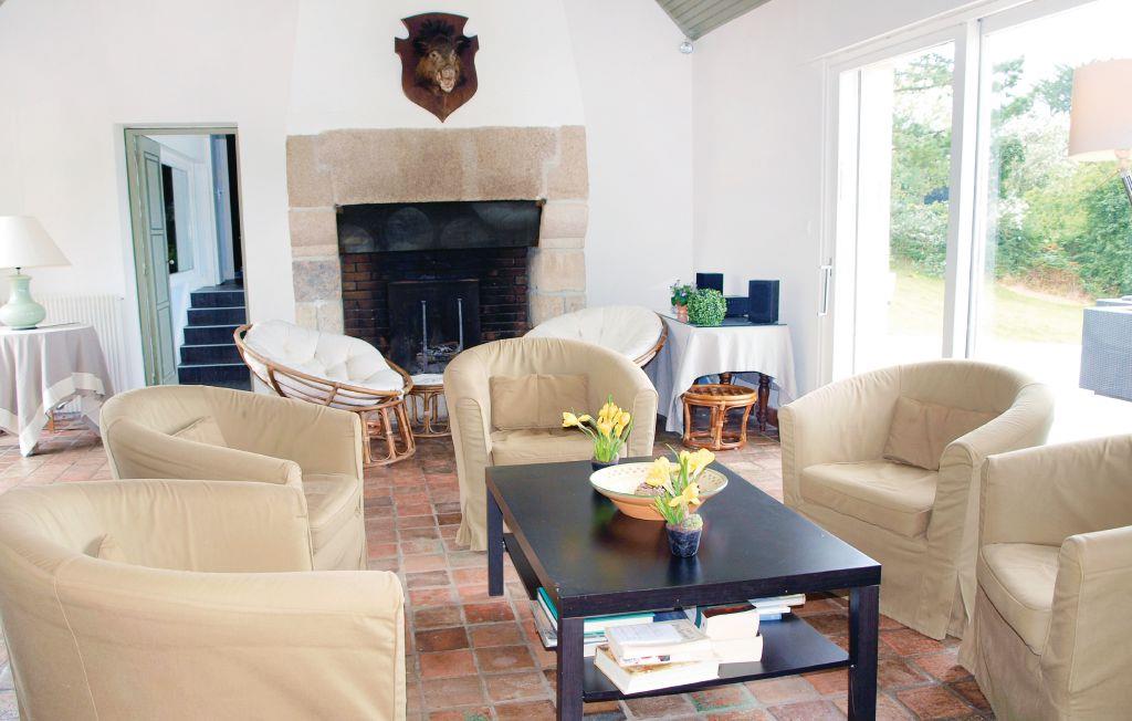 Takket være sin privilegerede beliggenhed og store panoramavinduer kan I nyde en fantastisk udsigt over det rolige vand i Aber Benoît fra dette lyse og rummelige hus. Pisk lækre retter op i det moderne køkken og tag plads i den hyggelige spiseplads. Glæd jer til hyggelige aftener ved brændeovnen i den store stue og afslut dagen med en hyggelig spilleaften eller et glas vin.