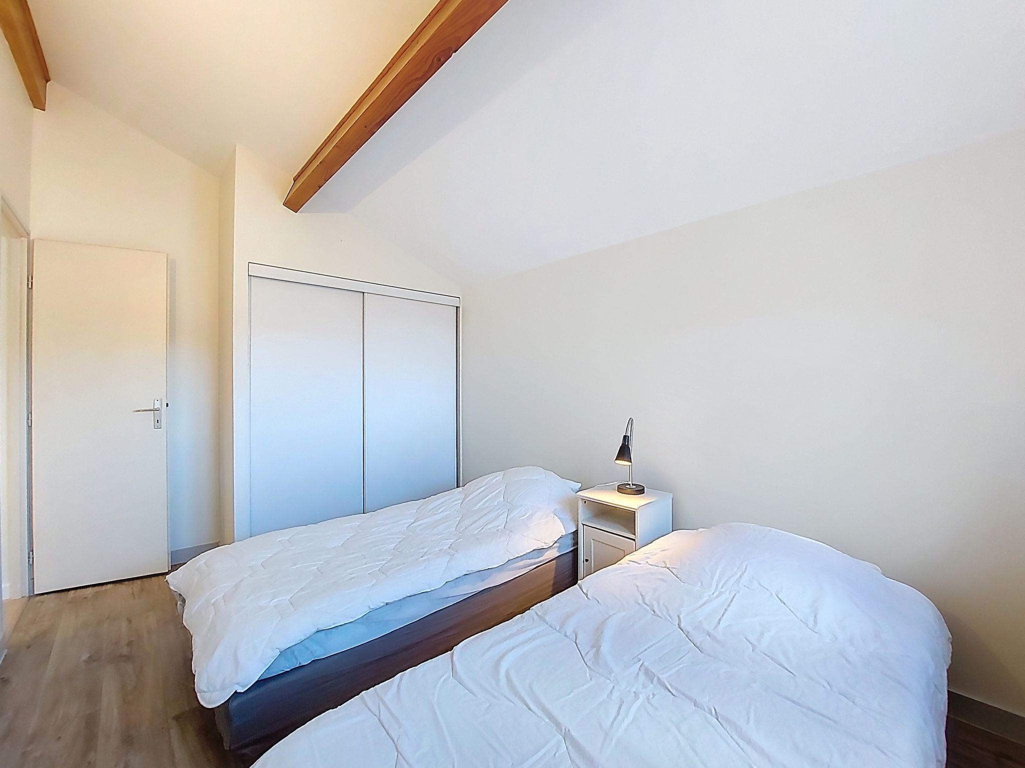 4-room house 100 m2 on 2 levels. Comfortable furnishings: living/dining room with TV (flat screen). Exit to the terrace. 1 room with 1 french bed (1 x 140 cm, length 190 cm). Exit to the garden. Kitchen (oven, dishwasher, 4 induction hot plates, microwave, freezer, electric coffee machine) with dining table. Exit to the terrace. Bathroom, sep. WC. Electric heating. Upper floor: gallery with sloping ceilings with rooflight with 1 double sofabed (1 x 140 cm, length 190 cm). 1 room with Dressing room with 1 french bed (1 x 160 cm, length 200 cm). 1 room with 2 beds (90 cm, length 190 cm). Shower/WC. Terrace. Terrace furniture. Very beautiful view of the sea. Facilities: washing machine. Internet (WiFi, free). Parking (2 cars), garage on the property. Please note: smoke alarm.