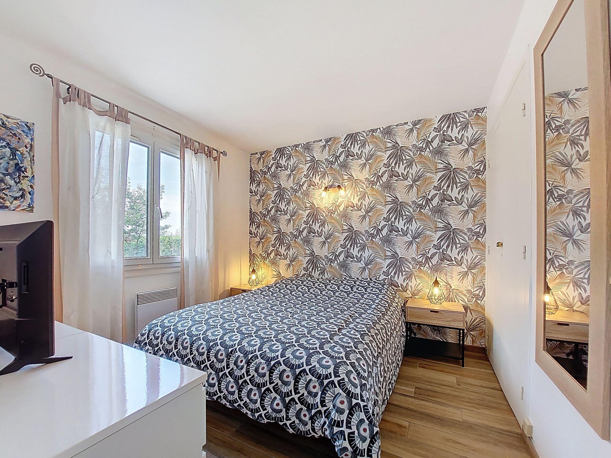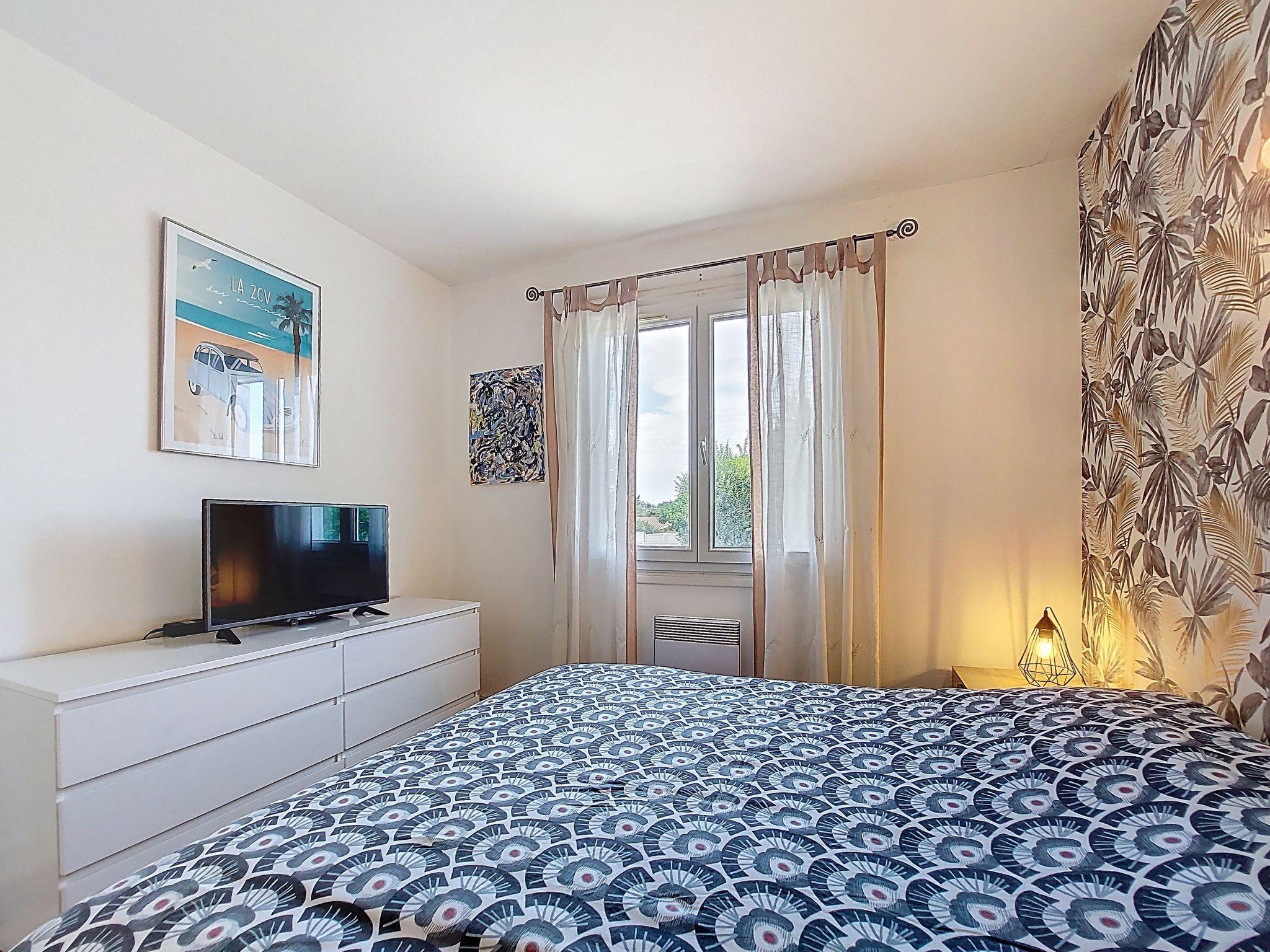 3-room house 60 m2, east facing position. Bright, cosy furnishings: living room with TV (flat screen). Exit to the garden, to the terrace. 1 room with 1 french bed (1 x 160 cm, length 190 cm), TV (flat screen). 1 room with 1 bed (90 cm, length 190 cm), 1 x 2 bunk beds (90 cm, length 190 cm). Open kitchen (dishwasher, 3 induction hot plates, toaster, kettle, freezer, electric coffee machine, combination microwave). Shower/WC. Air-conditioning. Terrace 8 m2, garden 650 m2. Terrace furniture. Facilities: washing machine. Internet (WiFi, free). Parking (2 cars). Please note: non-smoking house. 1 small pet/ dog allowed. Smoke alarm. Offer by a private individual according to Art. 155, IV of CGI.