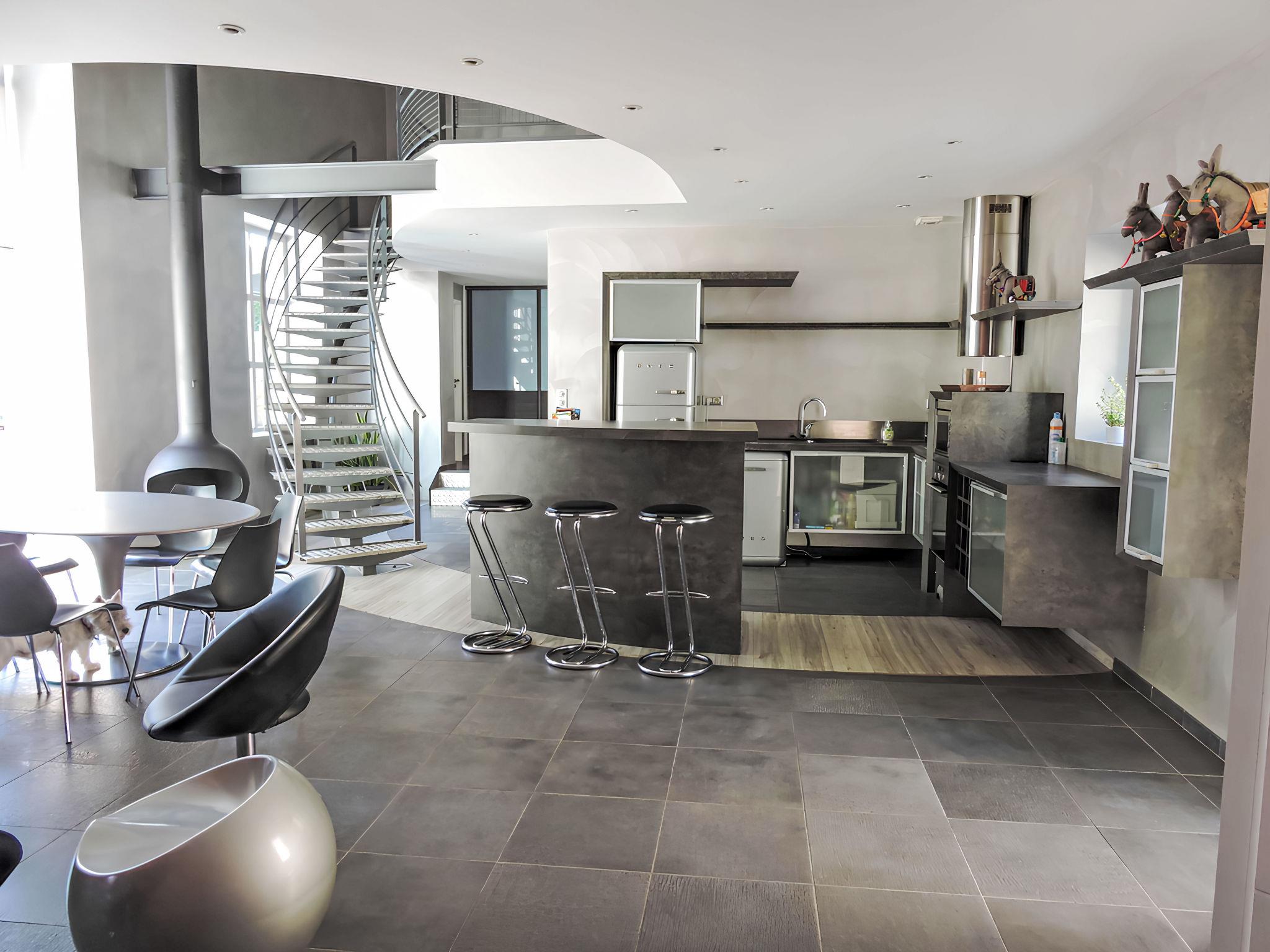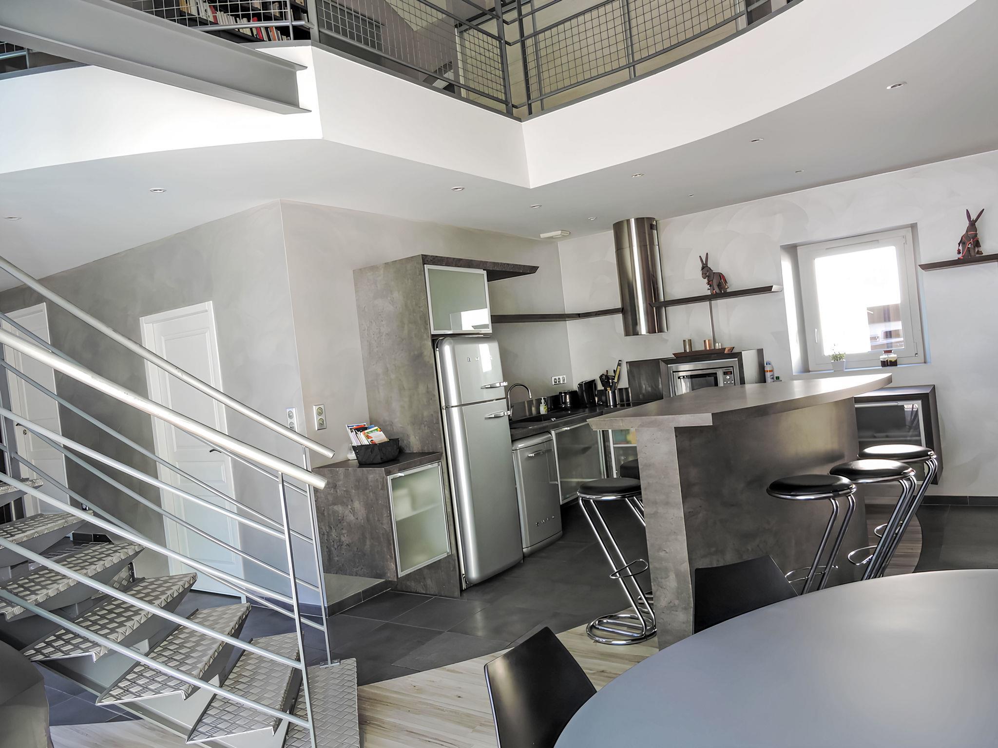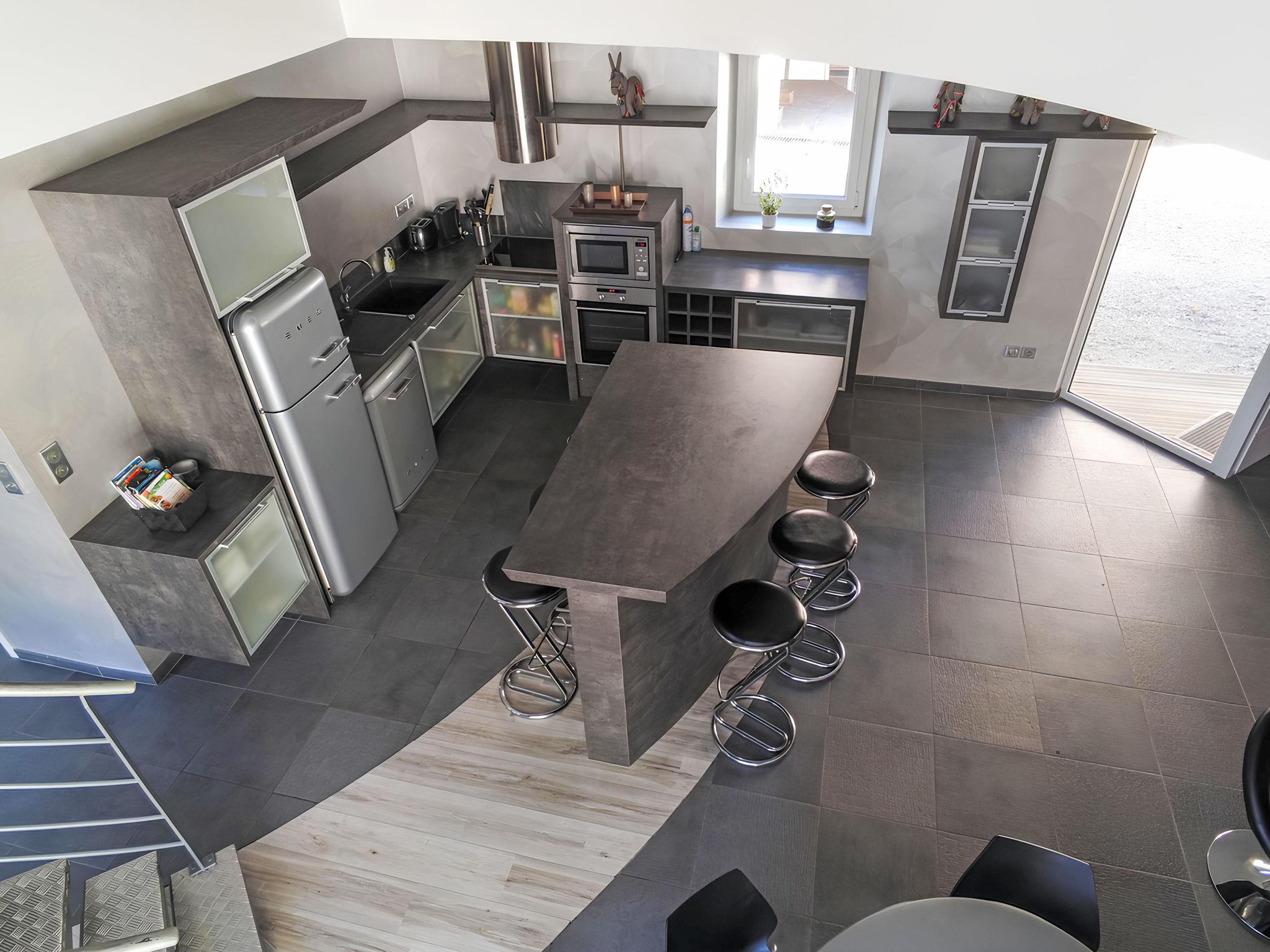 4-room house 180 m2 on 2 levels. Comfortable and modern furnishings: living/dining room with TV, radio and DVD. Exit to the terrace. 1 room with 1 french bed (1 x 140 cm, length 190 cm), shower. Open kitchen (oven, dishwasher, 1 ceramic glass hob hotplate, microwave, freezer, electric coffee machine). Sep. WC. Upper floor: 1 open room with 1 french bed (1 x 160 cm, length 190 cm). 1 room with 1 french bed (1 x 140 cm, length 190 cm). Bath/shower, sep. WC, double hand-basin. Heating. Large terrace. Deck chairs (5). Facilities: washing machine, iron, hair dryer. Internet (WiFi, free). Please note: apartment street side. Smoke alarm.