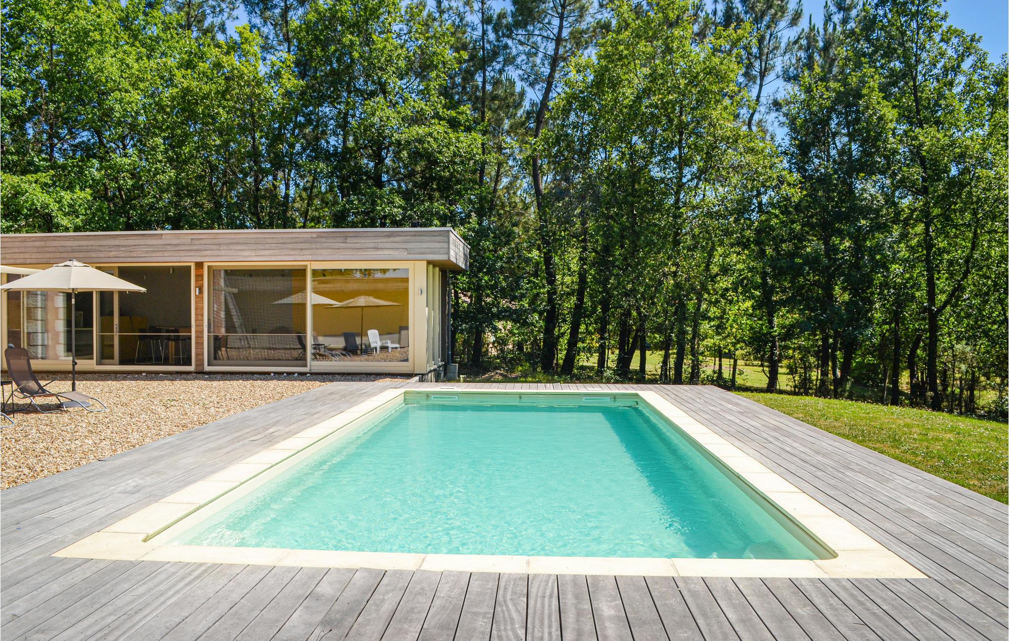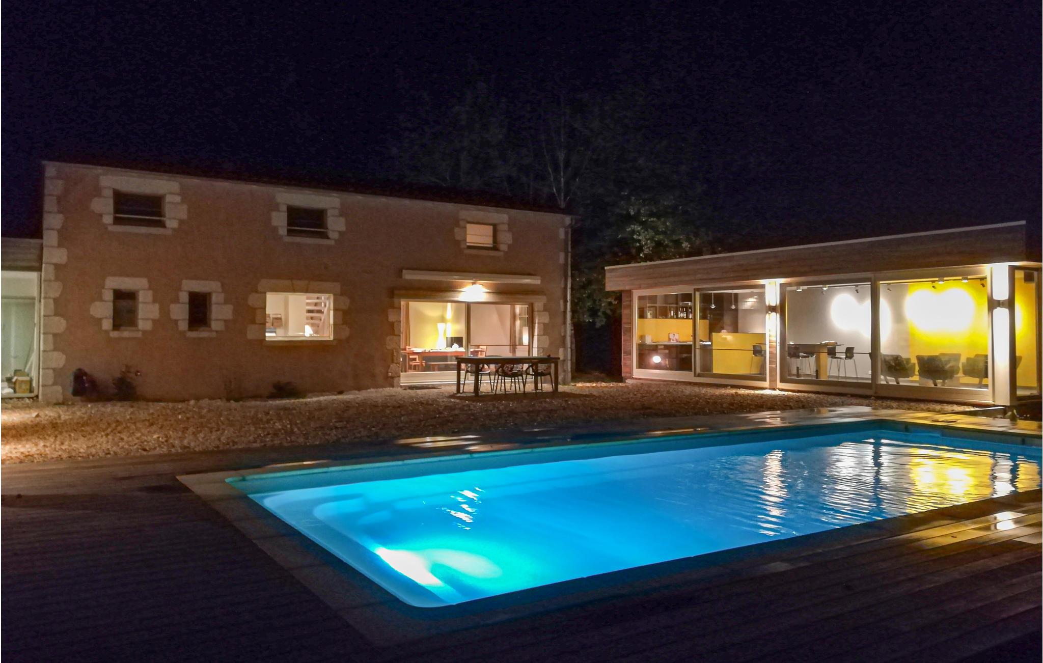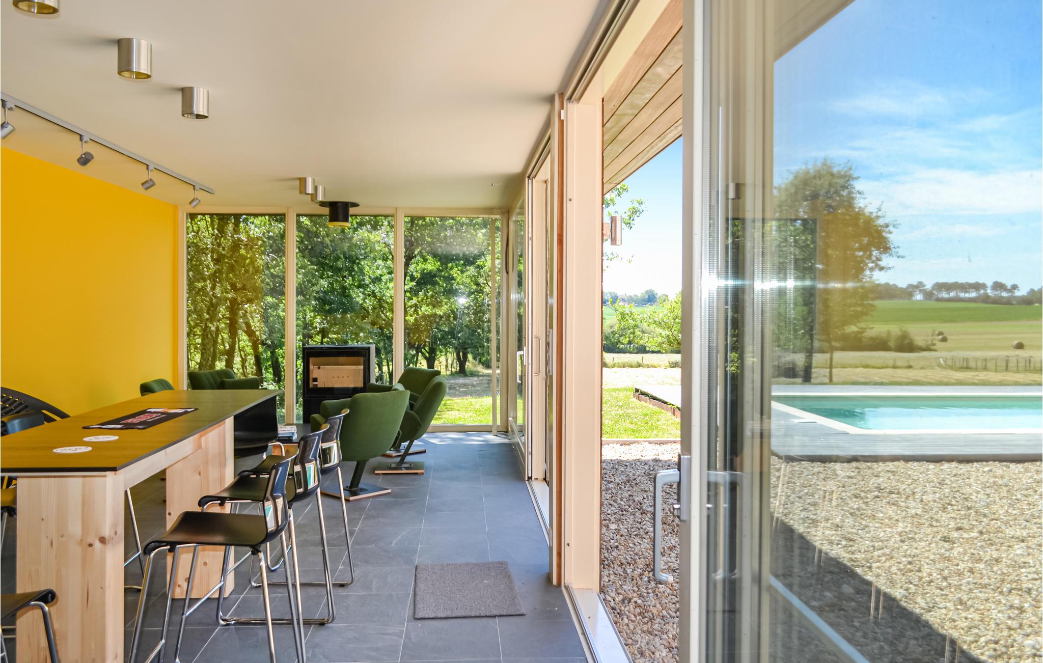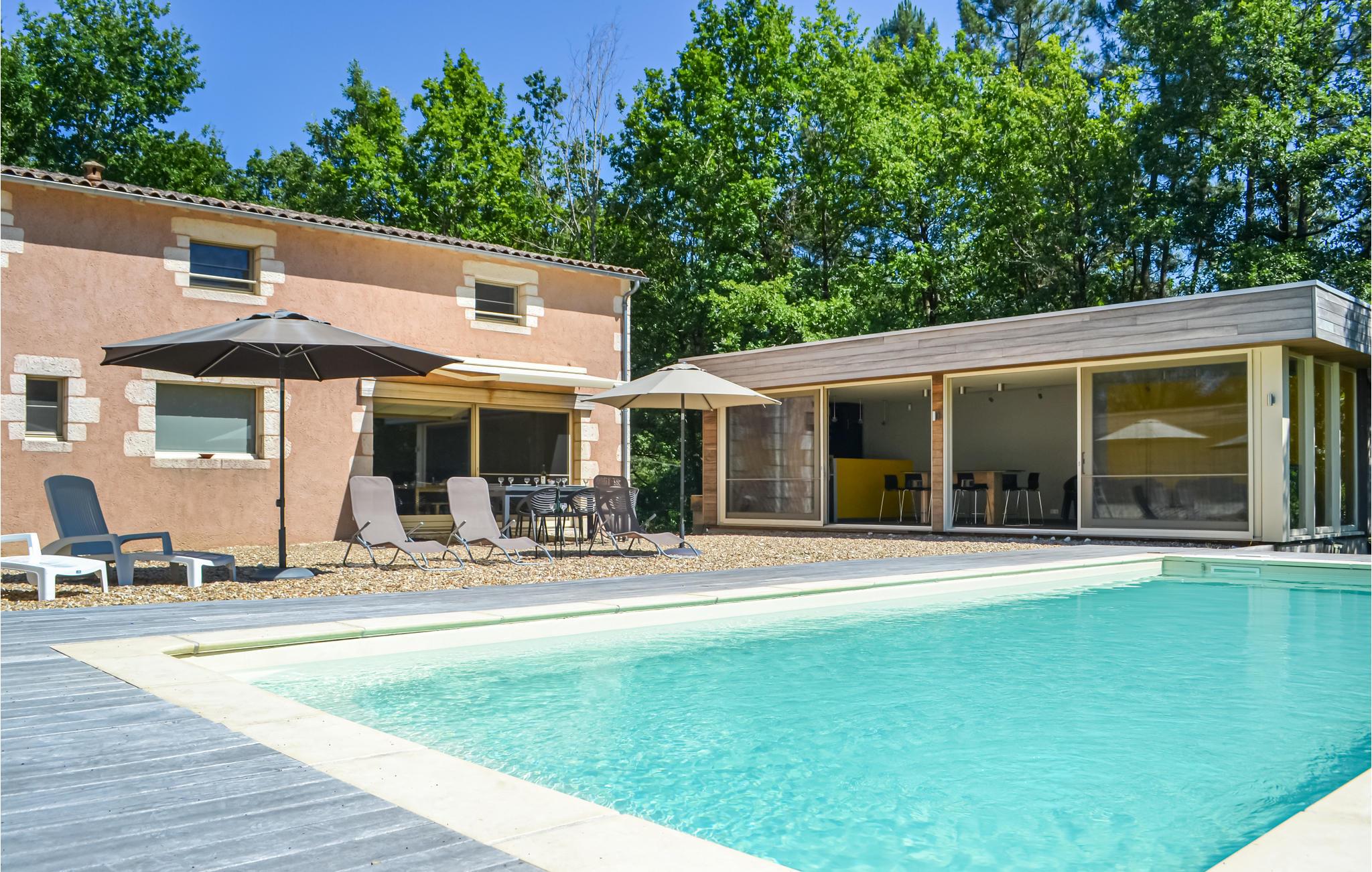 Det har plads til 10 personer fordelt på 4 soveværelser. Fra huset har du en smuk udsigt over landskabet og den nærliggende sø. I det moderne anneks ved siden af ??hovedhuset kan du hygge dig om aftenen og nyde en drink i baren med udsigt over poolen.