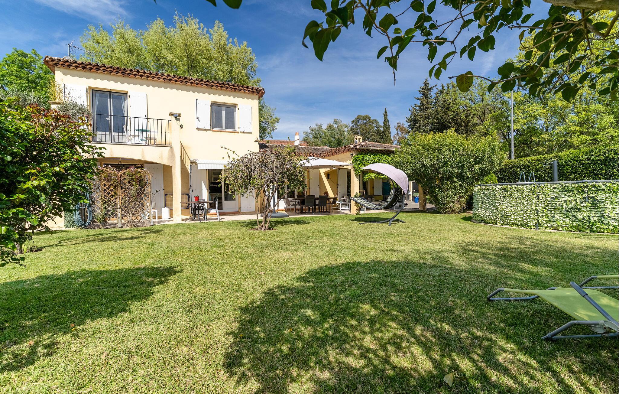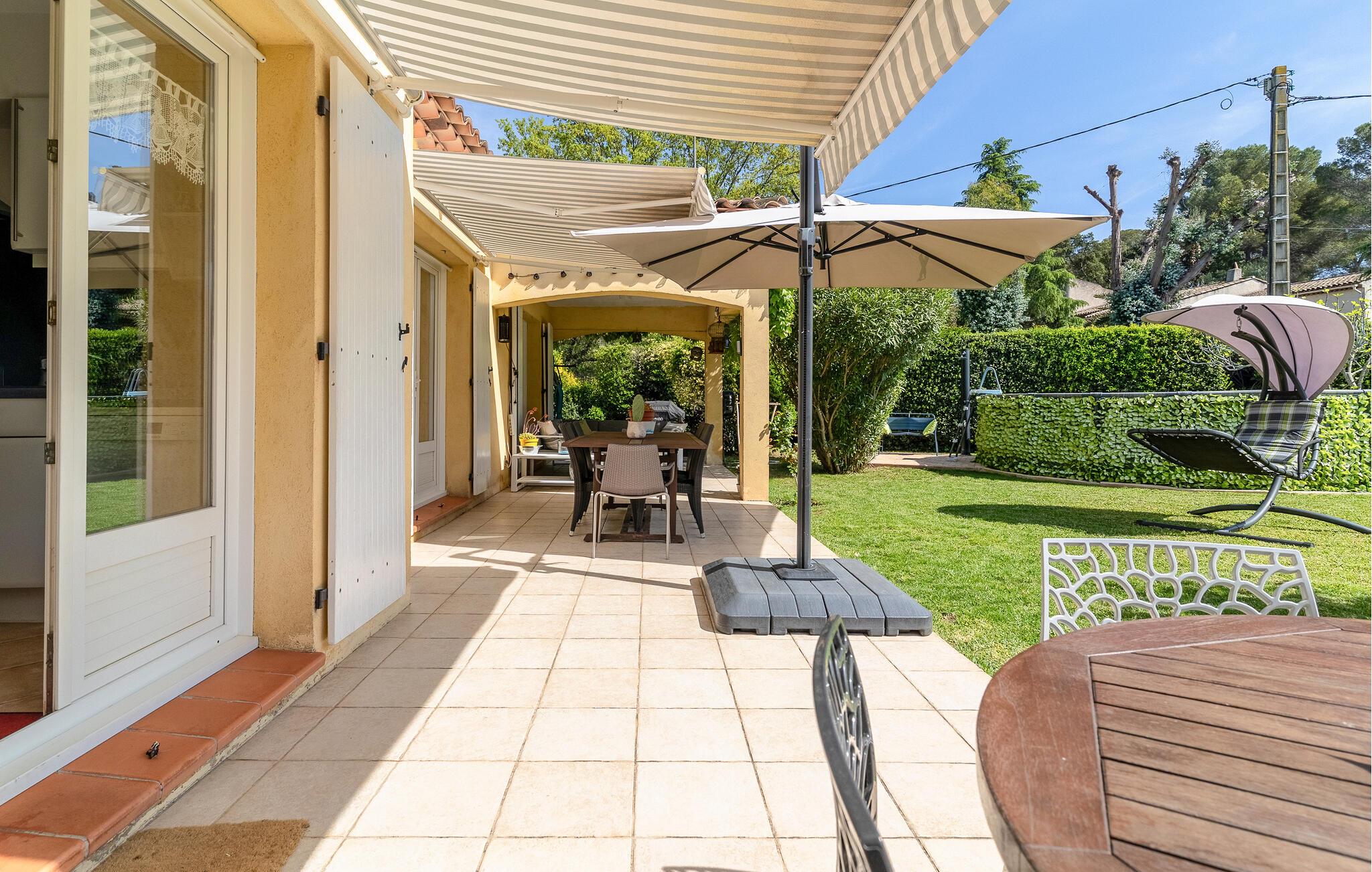 I den velholdte have kan I fuldt ud nyde det vidunderlige klima på Côte d'Azur. snup en frisk dukkert i poolen, lad børnene boltre sig på den store græsplæne og slumre i træernes skygge. Atmosfærefulde grillaftener og hyggelige timer med et glas vin i loungen venter jer på den rummelige, overdækkede terrasse.
