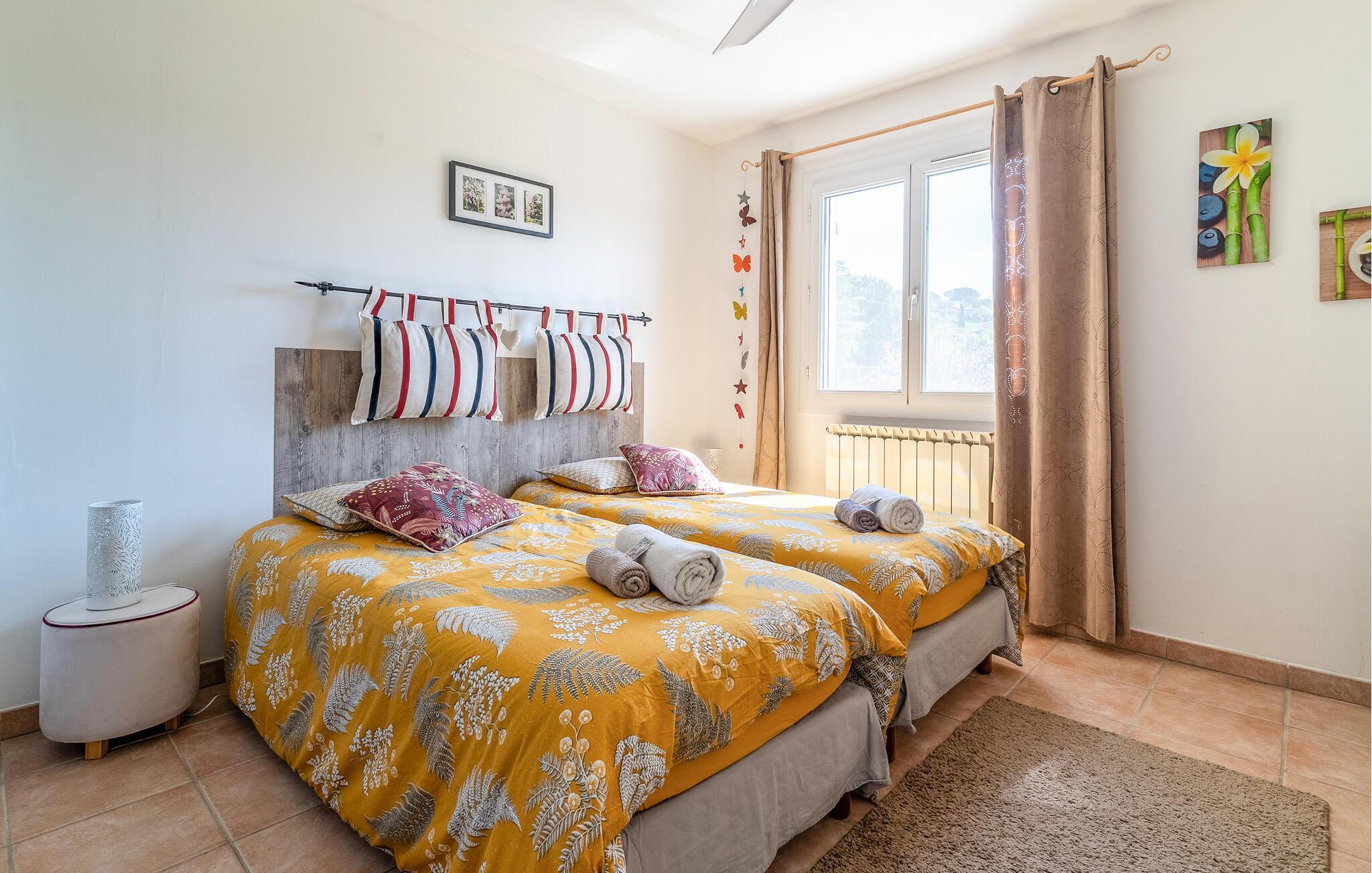 Velkommen til dette rummelige feriehus, som giver jer et komfortabelt hjem og en ideel base for en uforglemmelig ferie, ikke langt fra Middelhavets sandstrande. Eksperimentér med provencalske krydderurter i det lyse køkken, planlæg jeres aktiviteter over hyggelige måltider i den hyggelige opholdsstue, og synk ned i de komfortable sofaer med en bog efter en lang dag.