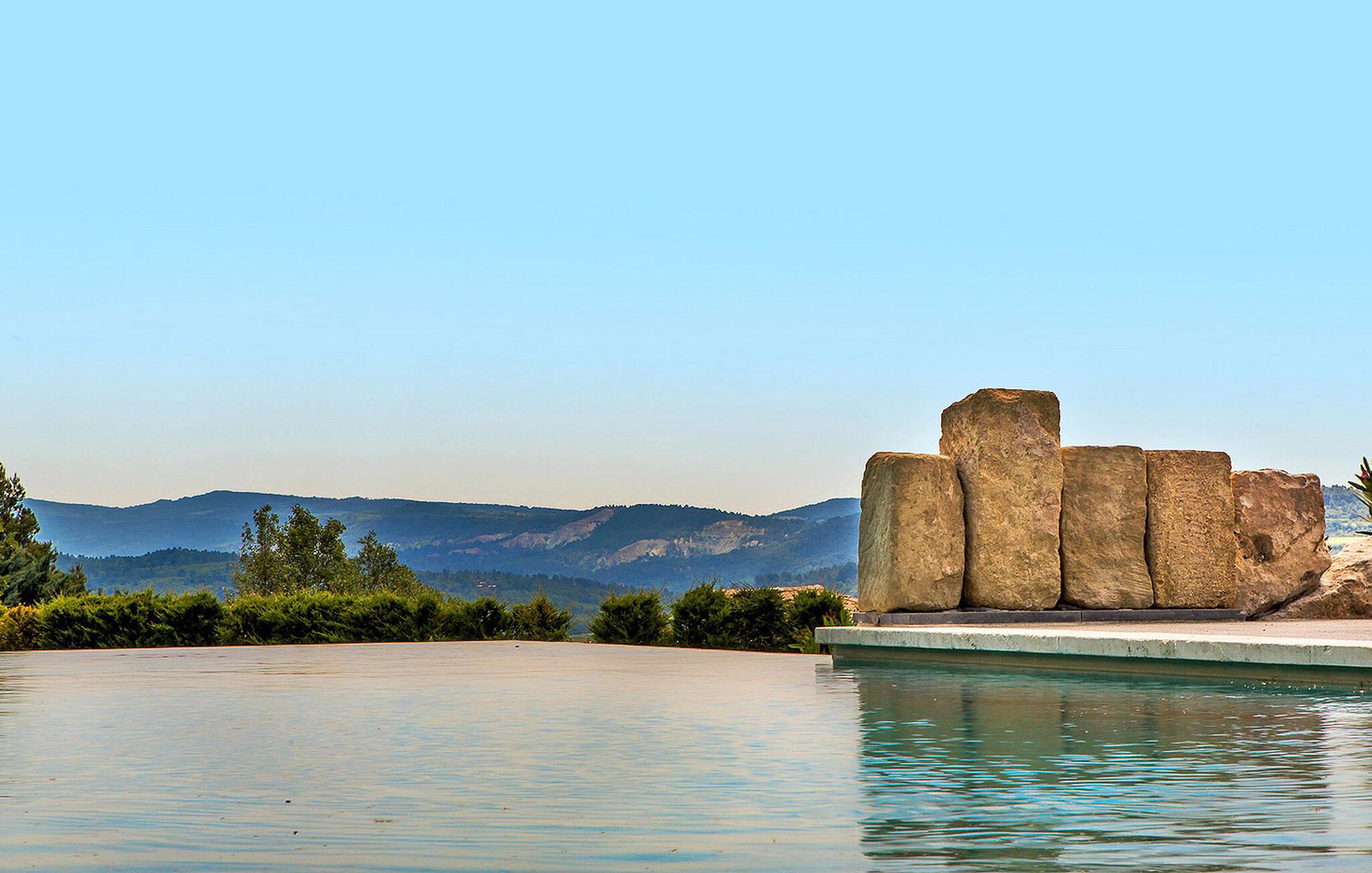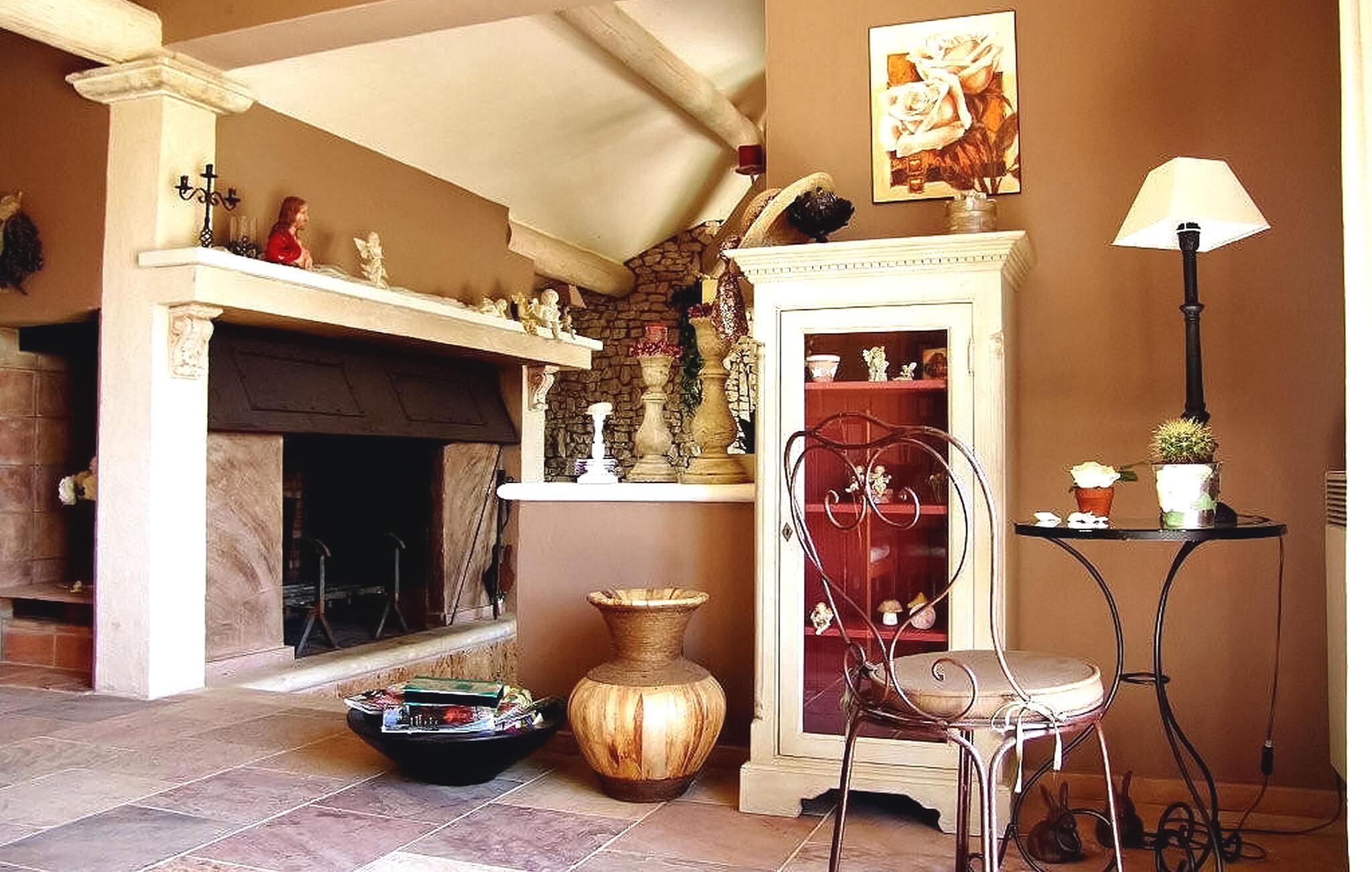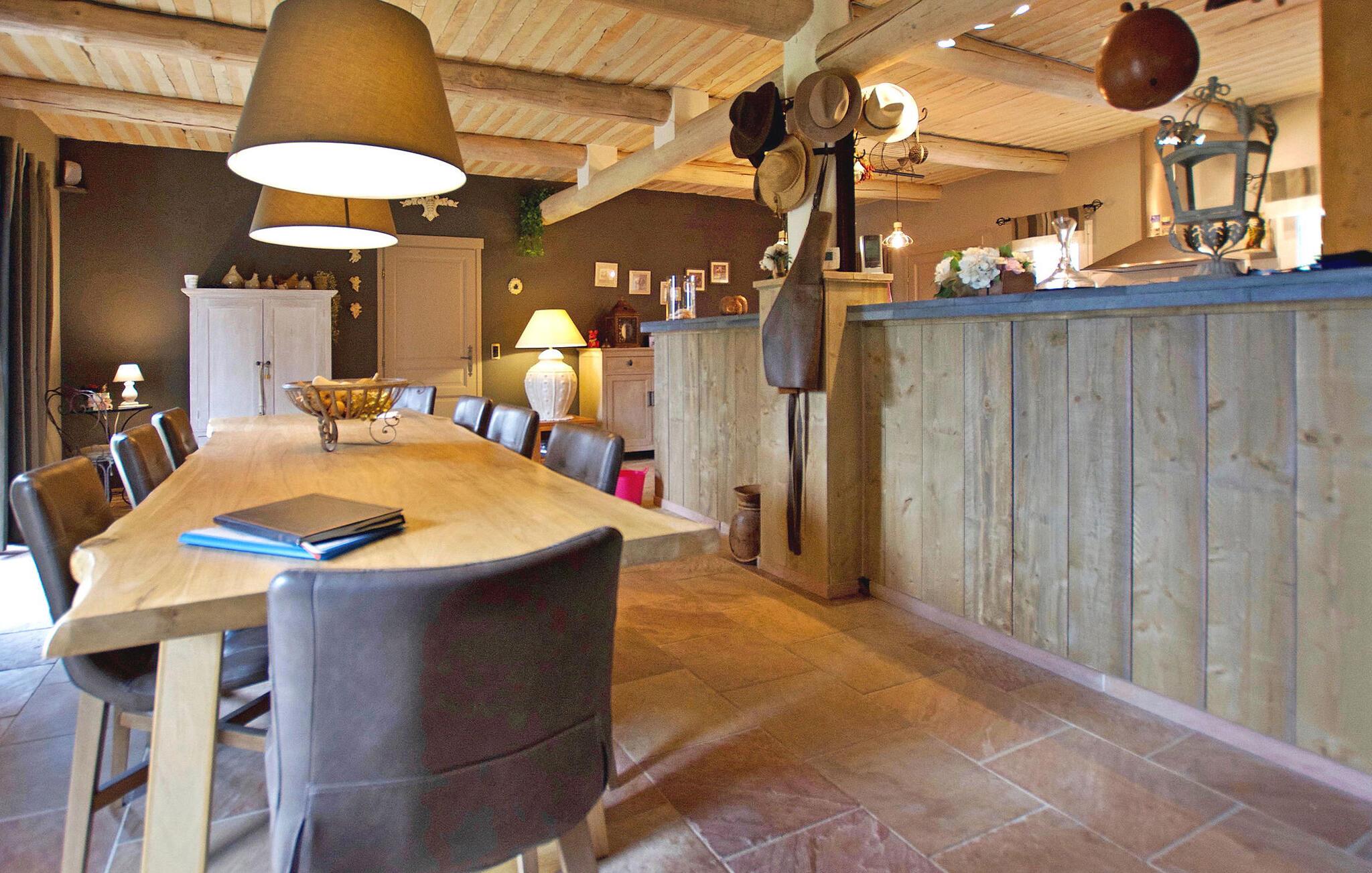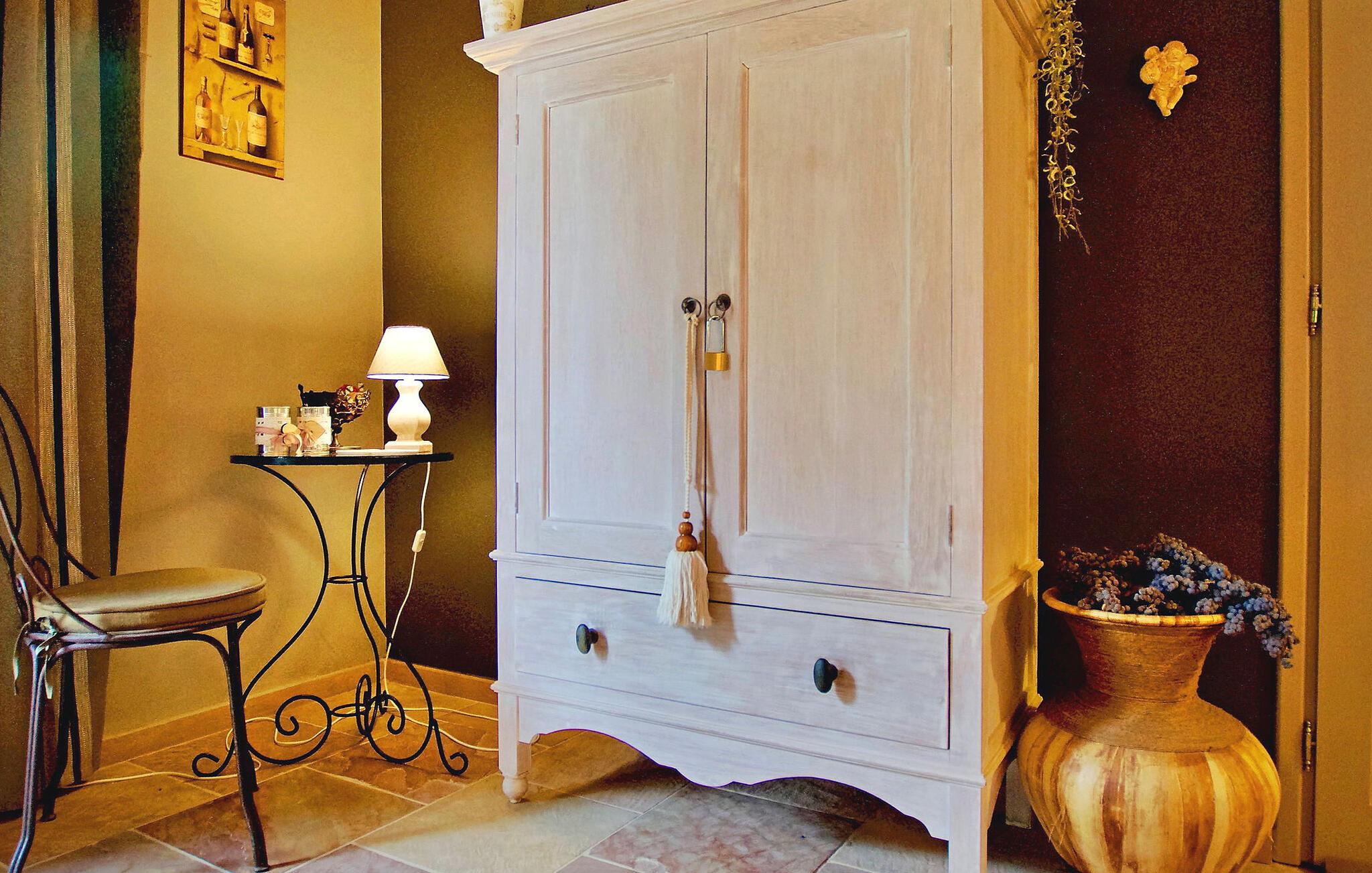 Beliggende på en bjergskråning, nær den historiske landsby Saint Saturnin les Apt, tilbyder denne fængslende ferievilla en uforglemmelig flugt. Villaen er udformet med kvalitet og giver en fantastisk udsigt over Luberon-bjergene. Denne imponerende ejendom er opdelt i to dele; hovedhuset og en separat fløj, som er hjemsted for to sydvendte soveværelser, med udsigt over haven, poolen og Luberon, hver med eget brusebad. Udenfor omgiver smukt velplejede og ekspansive haver med middelhavsflora en stor 12,5 x 5 m opvarmet pool (solenergi). En overdækket terrasse med havemøbler og grill, liggestole og en elektrisk port for sikker adgang til parkeringspladsen fuldender oplevelsen. Huset nyder godt af en rolig landlig beliggenhed, mens det kun er 2 km fra centrum af Saint Saturnin les Apt, en typisk Luberon-landsby beliggende blandt frugtplantager, olivenlunde og vinmarker. Landsbyen har mange historiske monumenter og bygninger at udforske. Blot et par minutter længere i bil kan du opdage de smukkeste steder i Luberon og det omkringliggende område, såsom Colorado de Rustrel, Gordes, Roussillon, Oppède, Ménerbes, Lacoste, Saignon, Sault og dens lavendelmarker, eller vandre rundt i Provence farverige markeder. Fordyb dig i denne ferievilla, hvor hver detalje afspejler essensen af et perfekt tilflugtssted midt i Luberons skønhed.
