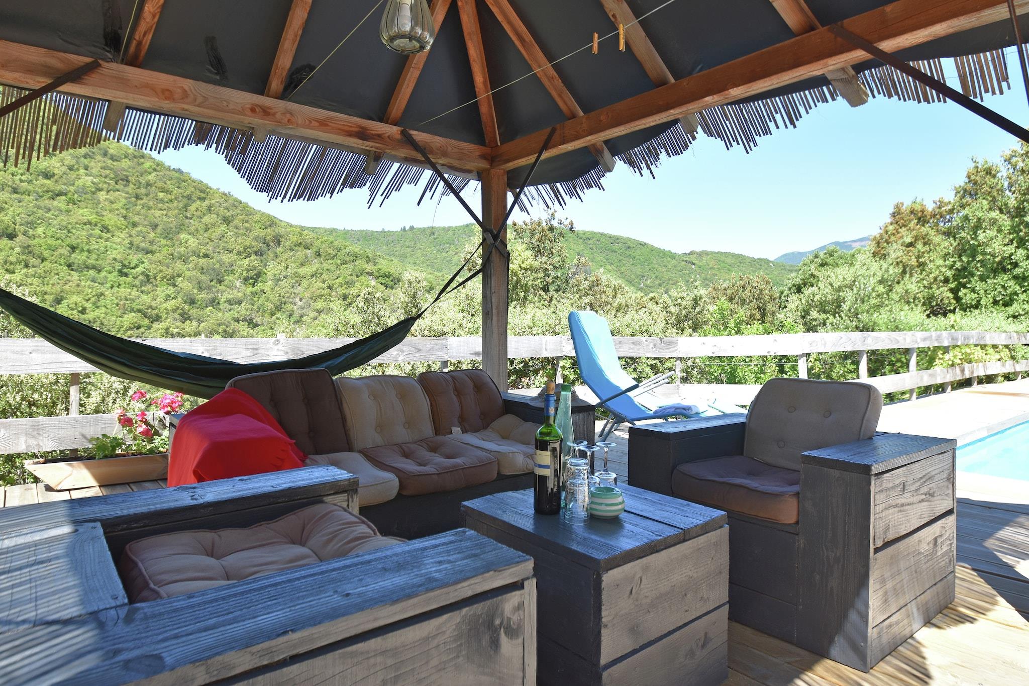 Stenhus med pool. På grund af den unikke beliggenhed, omgivet af naturen, er dette hus kun egnet til ægte naturelskere. Bortset fra det er du inden for en time fra kysten med flere strande som Agde, Sete, Marseillan Plage, Valras plage og så videre. Huset er velegnet til såvel familie som venner. På grund af de mange bakker i haven er dette hus ikke egnet til børn under 5/6 år. De ældre børn vil dog sætte pris på det som en stor fornøjelse så specielt som de går op til littekabinen i træerne. Udover de to soveværelser nedenunder på 1. sal er der også mulighed for to sovepladser i stuen. Interiøret kan beskrives som enkelt men charmerende på grund af dets karakteristiske natursten. I haven kan du tage et forfriskende dykke i poolen, et glas vin på terrassen eller nyde den fantastiske udsigt. Ideel til en fridag, efter for eksempel en lang gåtur gennem de naturlige omgivelser. På grund af en adgang, der er lidt kompliceret for at nå huset, vil du være sikker på at du kan blive her i fred og privatliv.