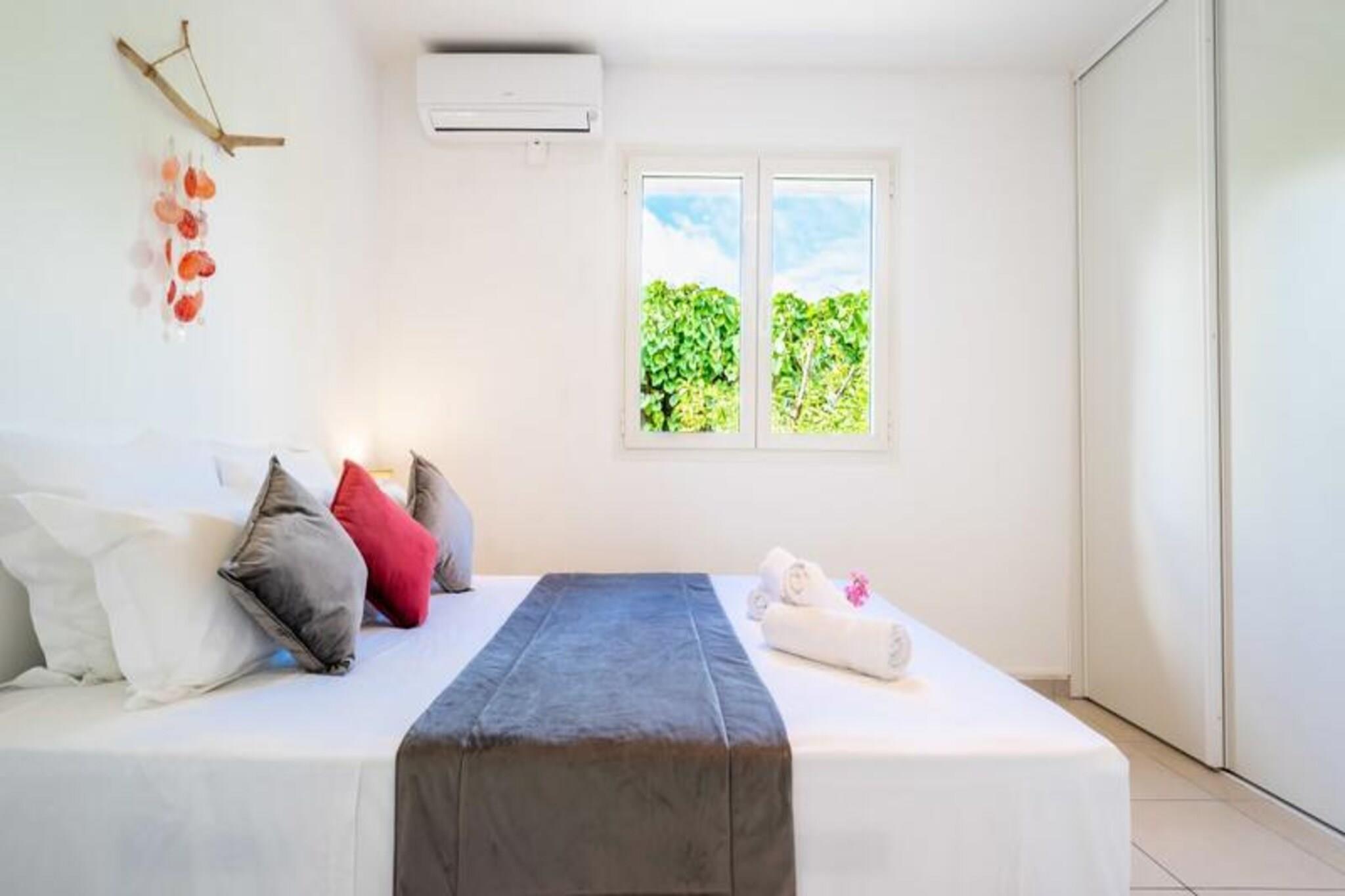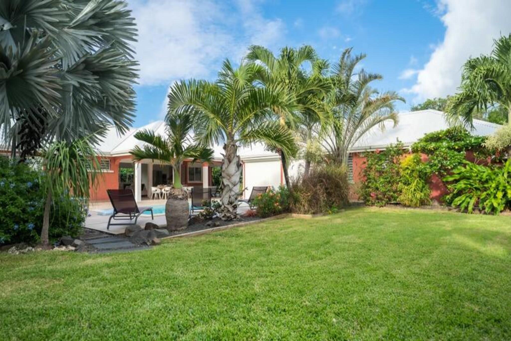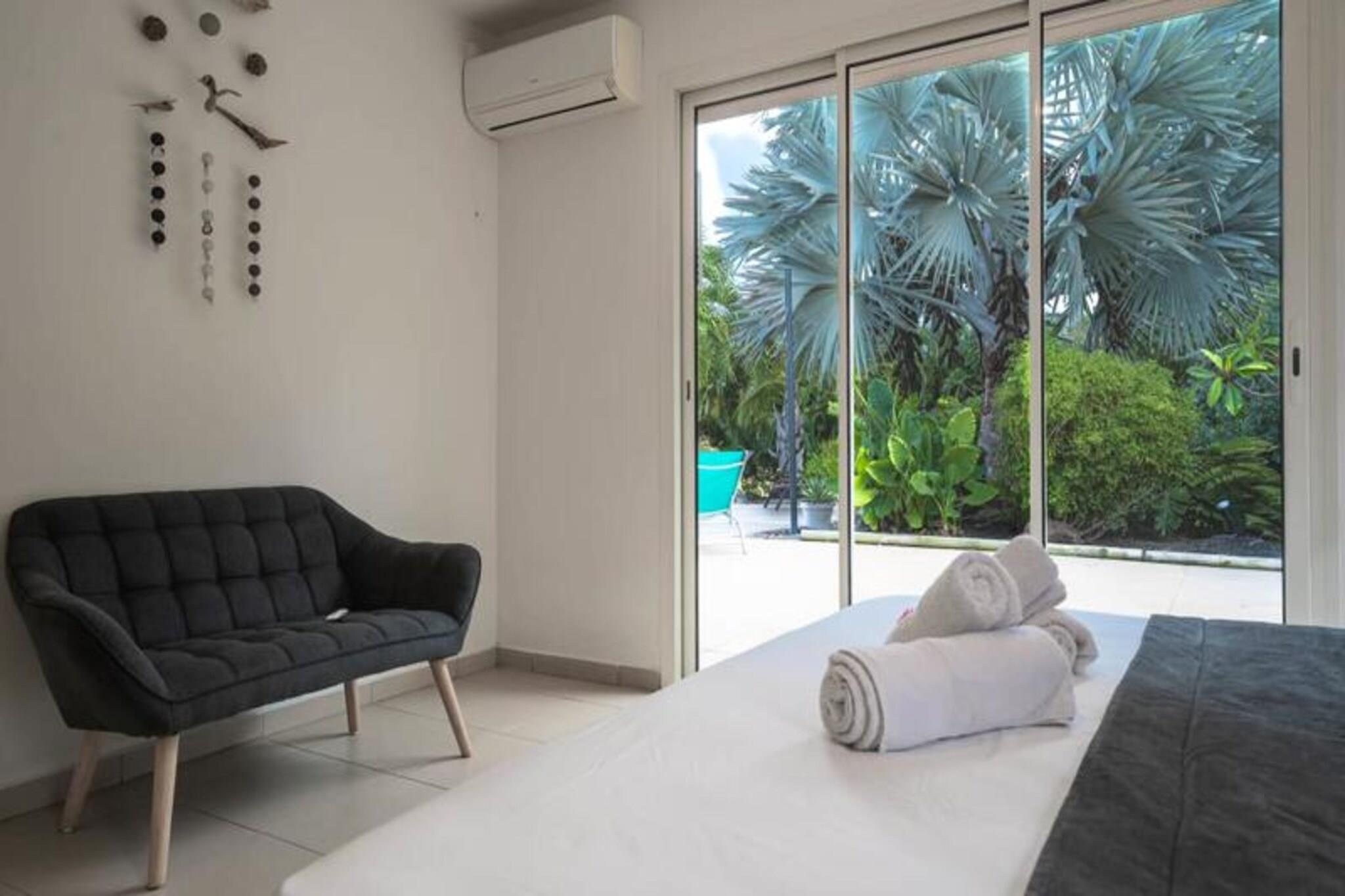 Denne rummelige ejendom best?r af to villaer med stor swimmingpool og kan rumme 12-15 personer. Den f?rste villa omfatter en stor stue med et katedralloft, der ?bner til en terrasse, en stor pool og frodige haver. Det tilbyder fire sovev?relser med aircondition, herunder en mastersuite med en 180 cm seng, p?kl?dningsv?relse, badev?relse og toilet. Den anden villa har et lyst k?kken, et opholdsomr?de og to sovev?relser med aircondition, hver med sit eget private badev?relse. Villaerne er ikke k?ledyrsvenlige, og der kr?ves et depositum p? EURO2500. Denne ejendom er ideelt beliggende i hjertet af Saint-Fran?ois, t?t p? kvalitetsbutikker, restauranter og marinaen. Kun 7 minutter fra golfbanen og 10 minutters k?rsel til en af ??de smukkeste strande p? Guadeloupe, Raisins Clairs. Saint-Annes storsl?ede strande er 15 minutter v?k, og Le Moule er en kort 5-minutters k?rsel. Omr?det er ideelt til vandsport, hvor havnen i Saint-Fran?ois tilbyder surflektioner, og de n?rliggende strande er perfekte til Wing Foil-ture. Villaerne er fuldt udstyret med moderne bekvemmeligheder, herunder aircondition, internetadgang og en saltvandsswimmingpool med alarmsystem for sikkerhed. Hver villa har et fuldt udstyret k?kken, private badev?relser og store terrasser med liggestole. G?sterne kan ogs? nyde concierge-tjenester, en velkomstcocktail og reng?ring f?r og efter deres ophold.
