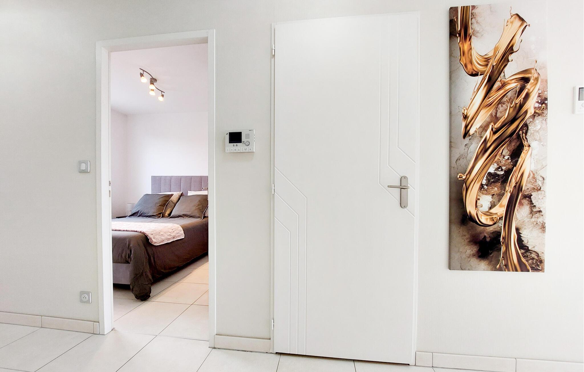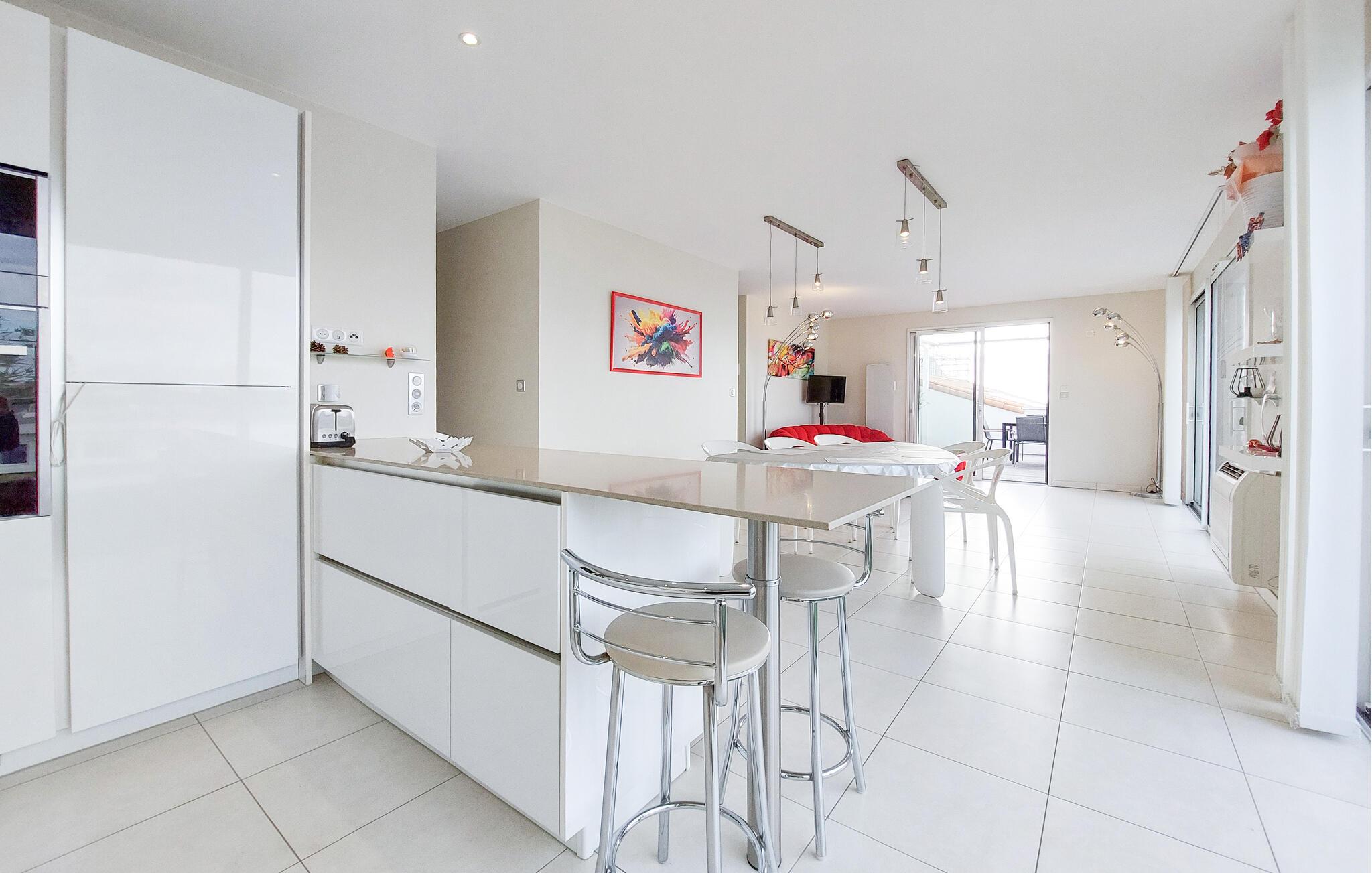 Denne rummelige lejlighed ligger nogle få skridt fra sandstranden og haren frisk og velholdt atmosfære, hvor I kan nyde den fortryllende havudsigt. Tilbered lækre måltider med friske ingredienser fra markedet, find sammen til afslappede måltider og sjove spilleaftener eller læn jer tilbage med en god bog i sofaen.