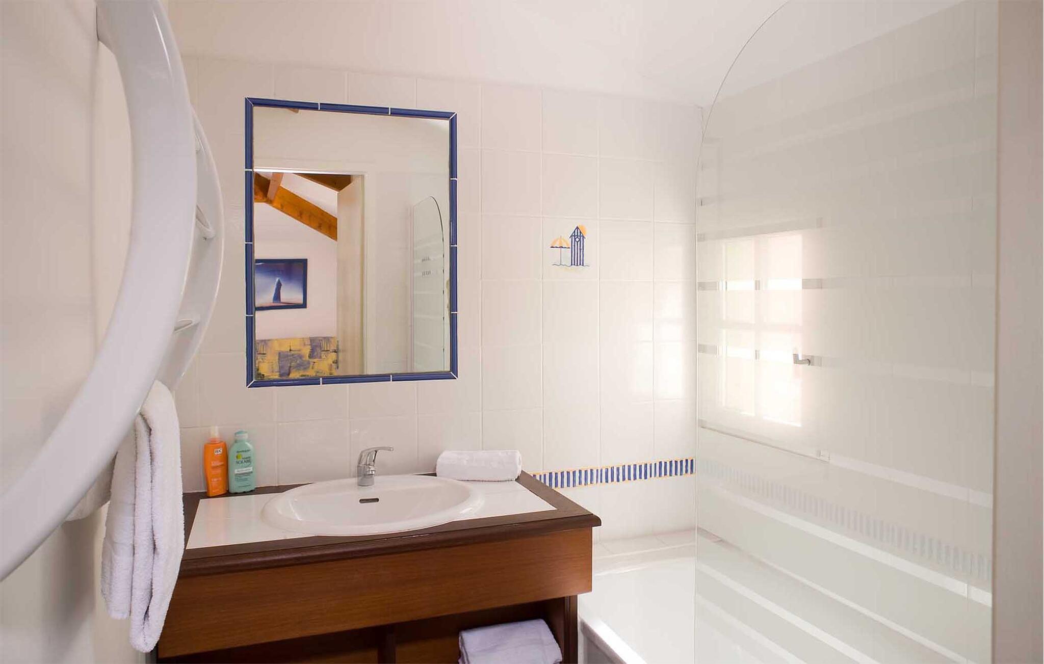 Bemærk: Farven og indretningen kan variere, soveværelserne har enten en dobbeltseng eller to enkeltsenge og badeværelserne har enten badekar eller bruser.