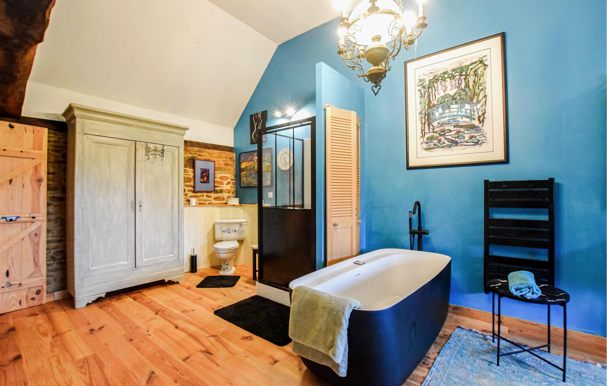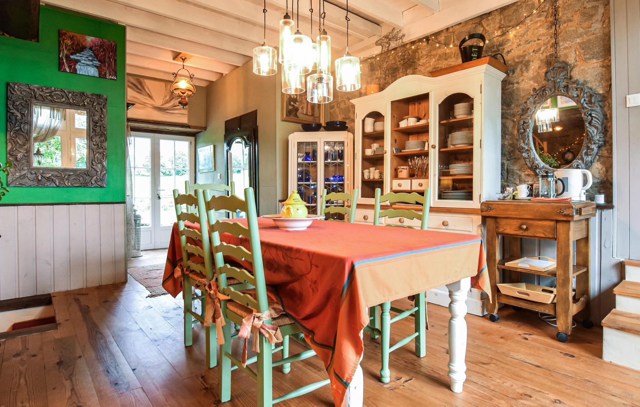 Dette charmerende feriehus i Saint-Hilaire-du-Harcouët føles som en skattekammer – et sandt „Ali Baba“-eventyr. Den rummelige indretning og kunstneriske dekoration gør hvert rum til noget særligt. Fra stuen er der adgang til sydterrassen, mens køkkenet og spisestuen åbner ud til en nordvendt terrasse, som giver jer både solrige og skyggefulde hjørner til afslapning. Nyd roen og den særlige atmosfære, mens I slapper af i solen eller ser børnene lege i haven.