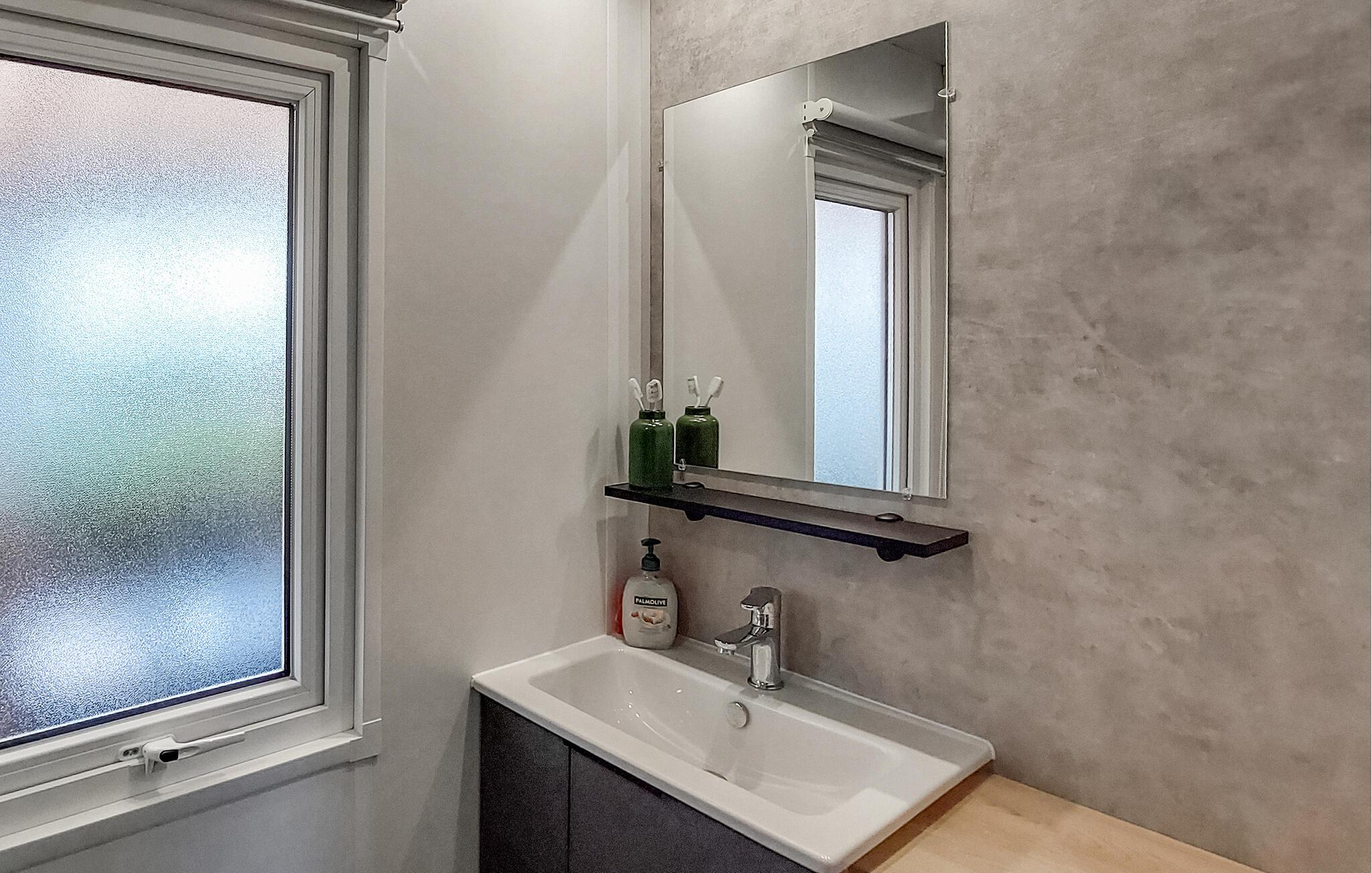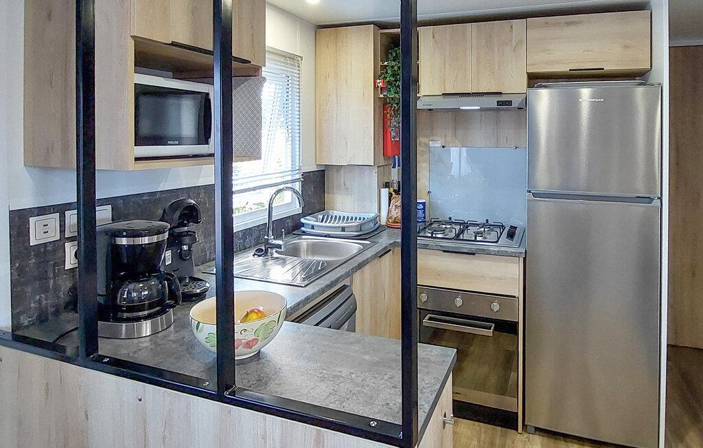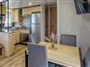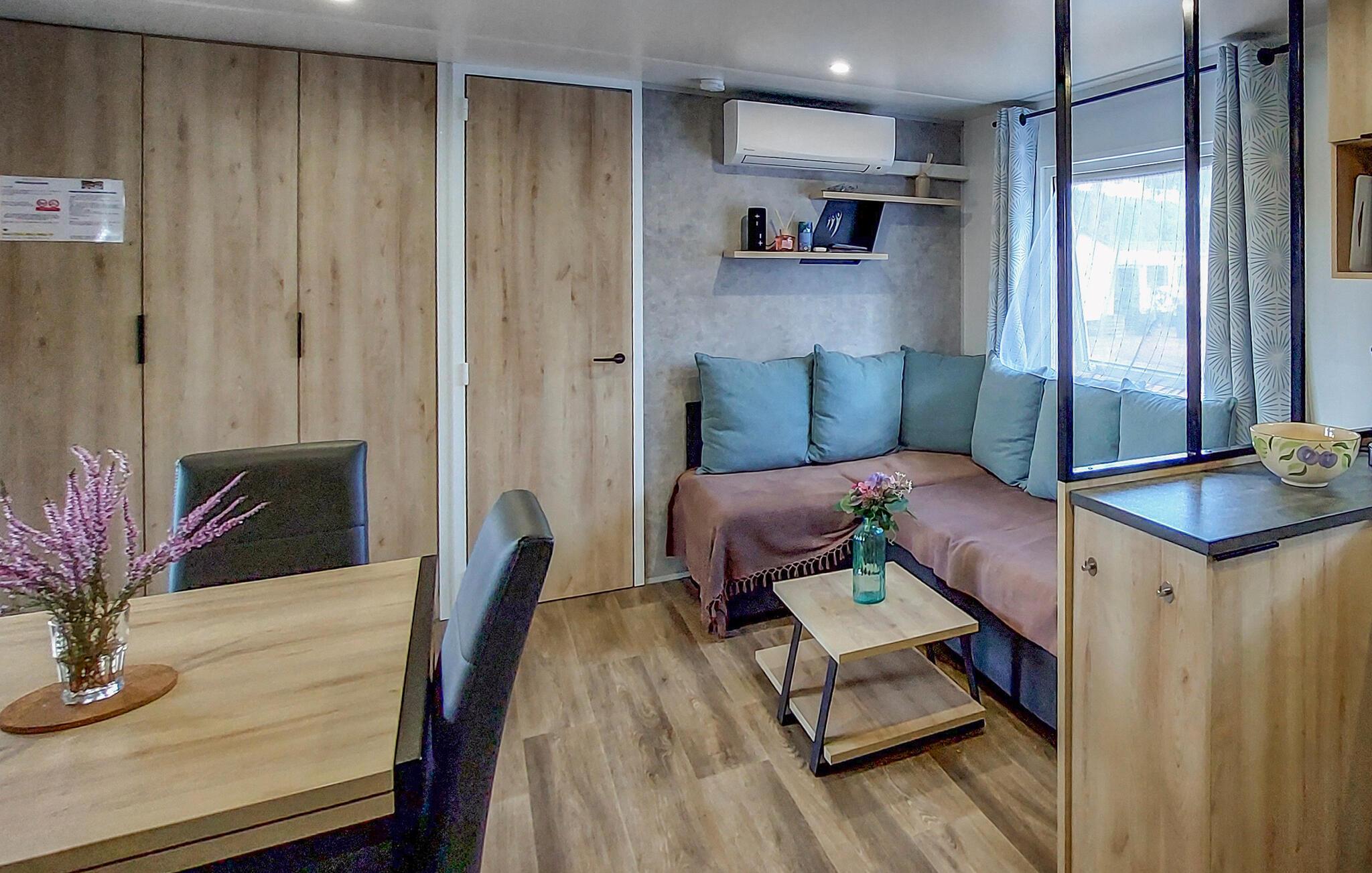 Inde i dette mobilehome finder I et moderne, gennemtænkt indretningskoncept med lyse farver og varme træelementer. I opholdsstuen kan I slappe af i det komfortable siddeområde, læse eller lytte til en interessant podcast. Køkkenet er kompakt og praktisk udstyret – et godt sted til nem feriemadlavning.