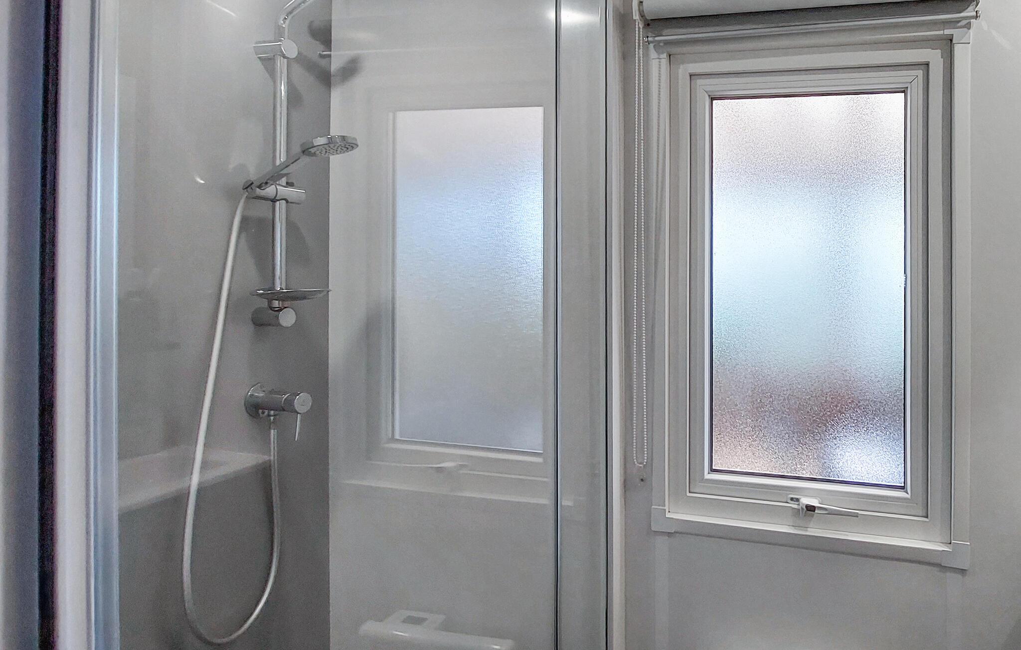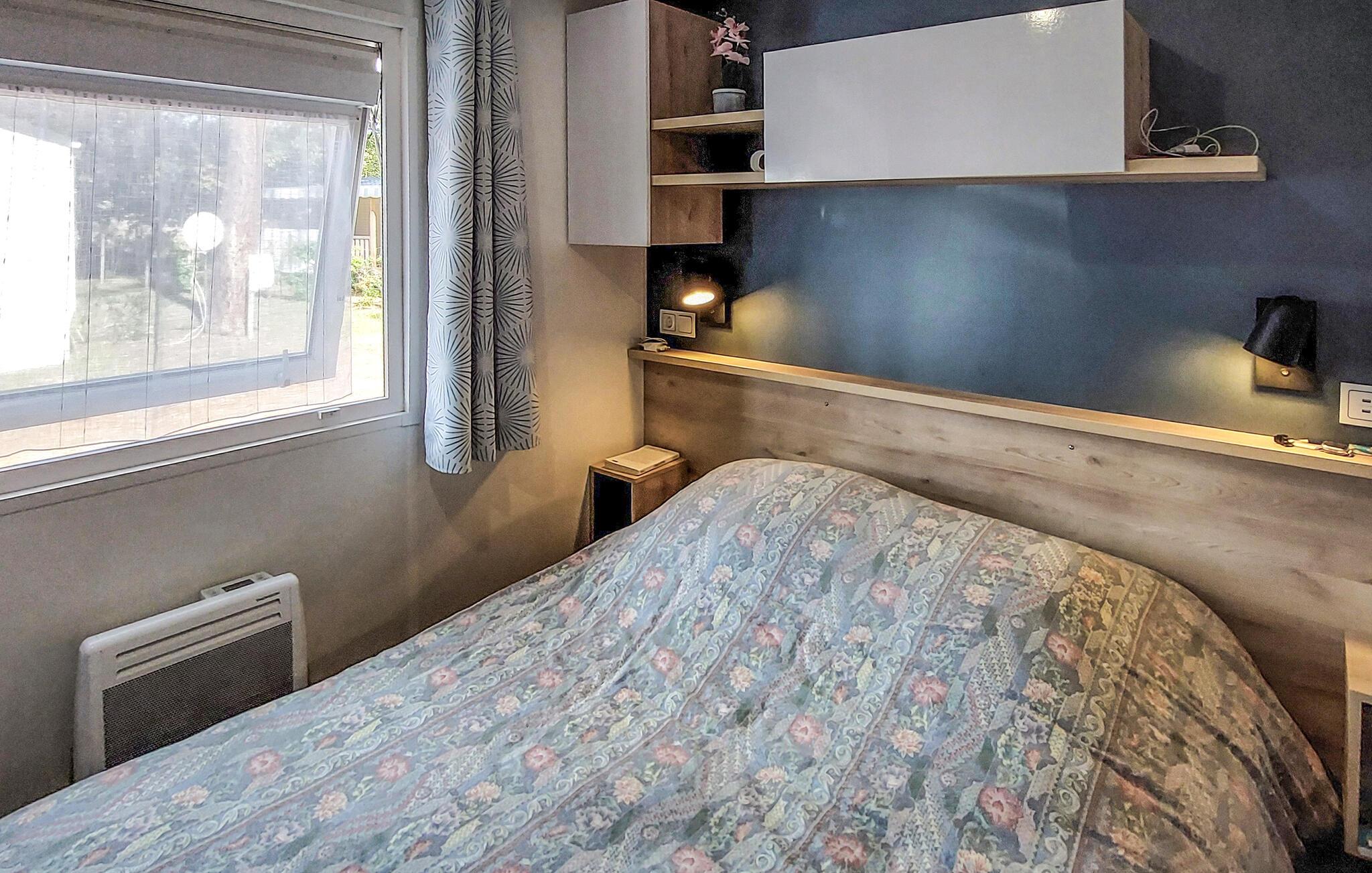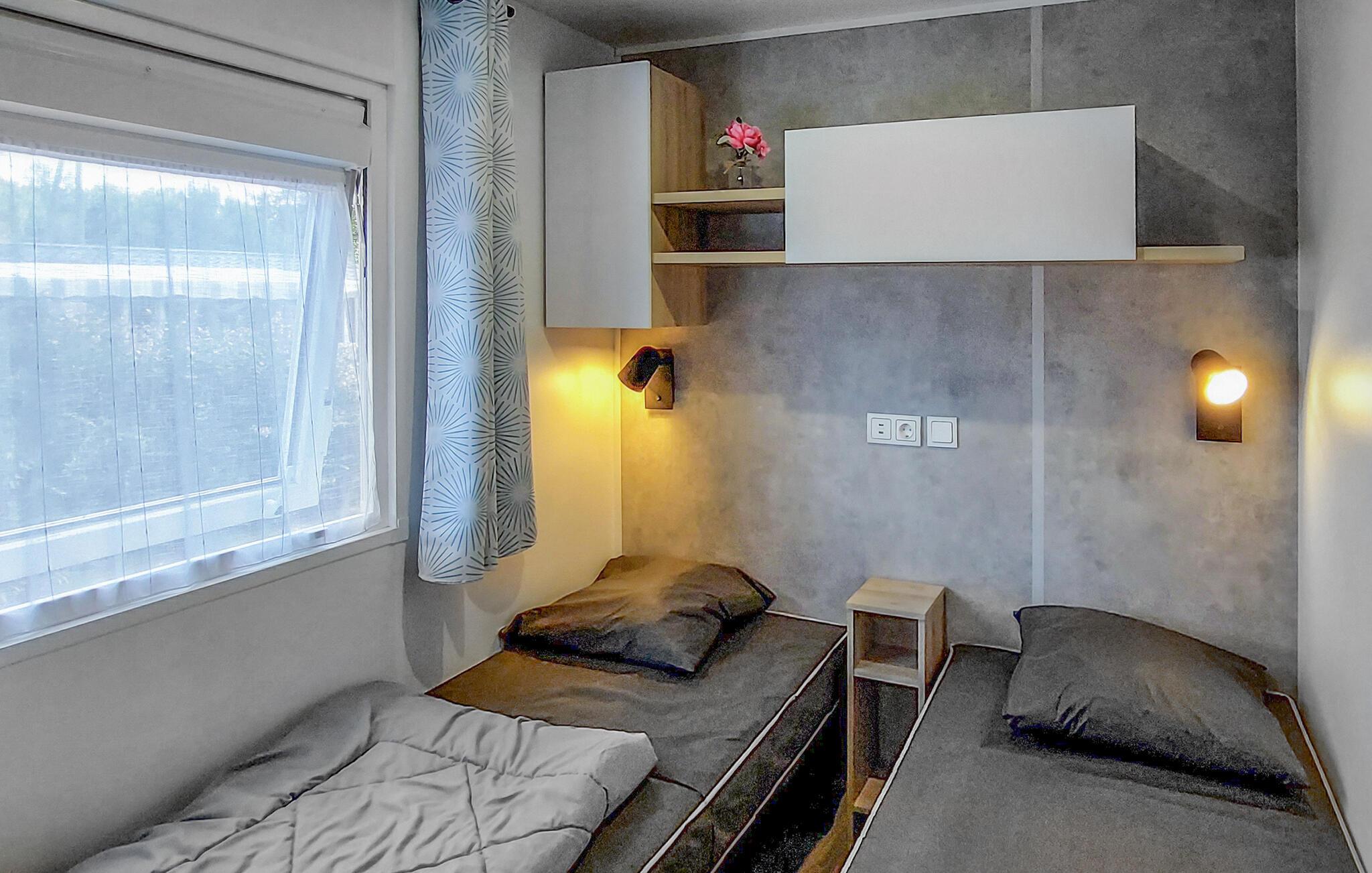 Inde i dette mobilehome finder I et moderne, gennemtænkt indretningskoncept med lyse farver og varme træelementer. I opholdsstuen kan I slappe af i det komfortable siddeområde, læse eller lytte til en interessant podcast. Køkkenet er kompakt og praktisk udstyret – et godt sted til nem feriemadlavning.