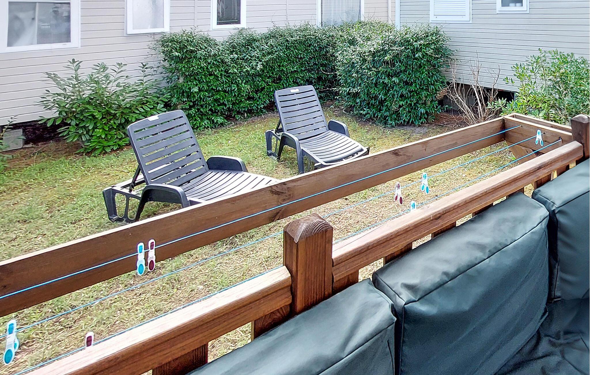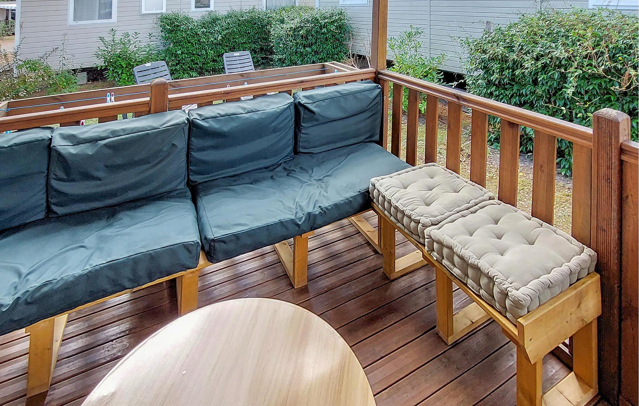 Udenfor venter en overdækket træterrasse med et komfortabelt siddeområde. Nyd måltider sammen under åben himmel eller afslappede aftener med et glas vin. I den lille have kan I nyde freden og roen på liggestolene, læse jeres ferieroman eller blot slappe af.