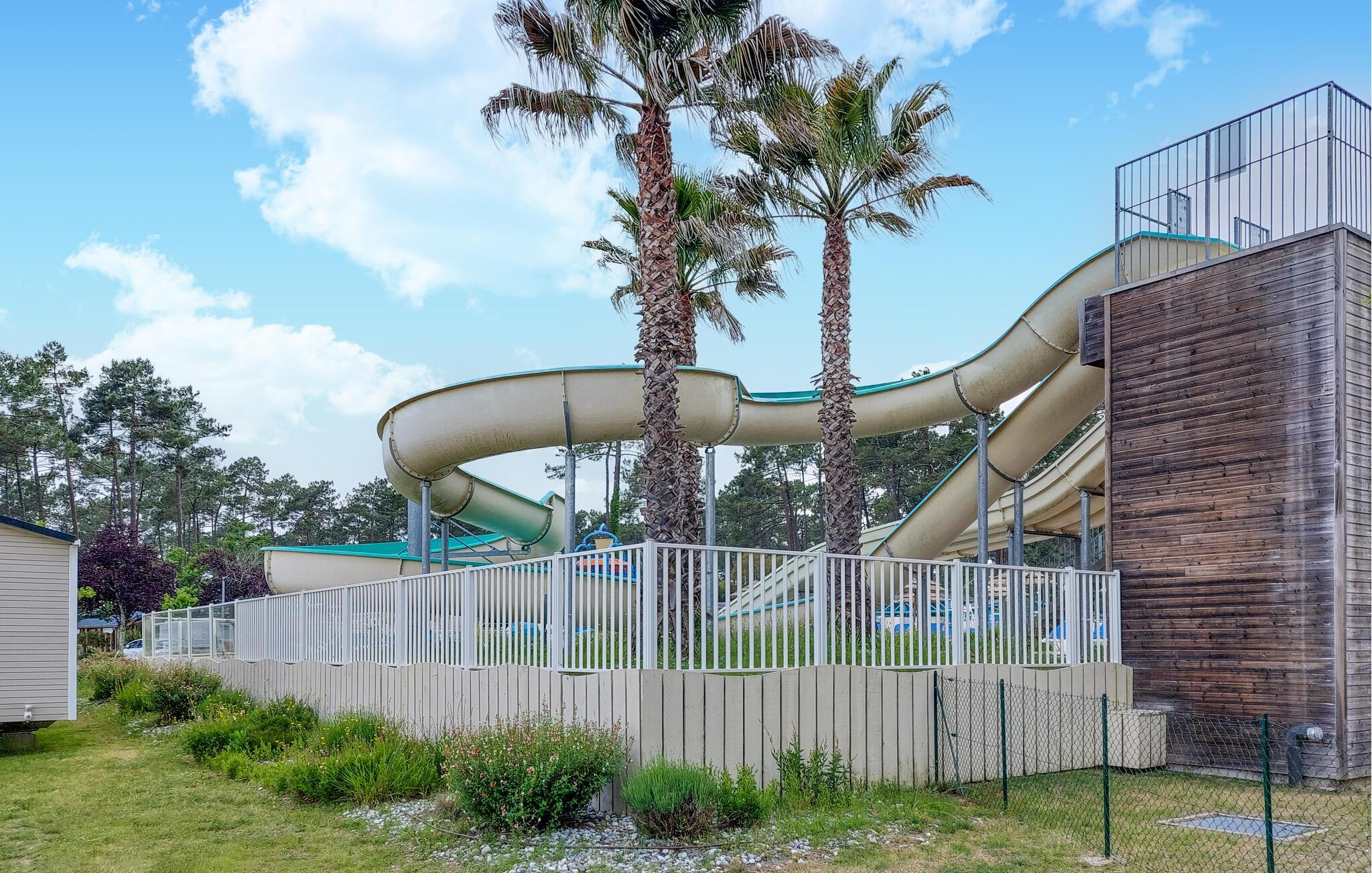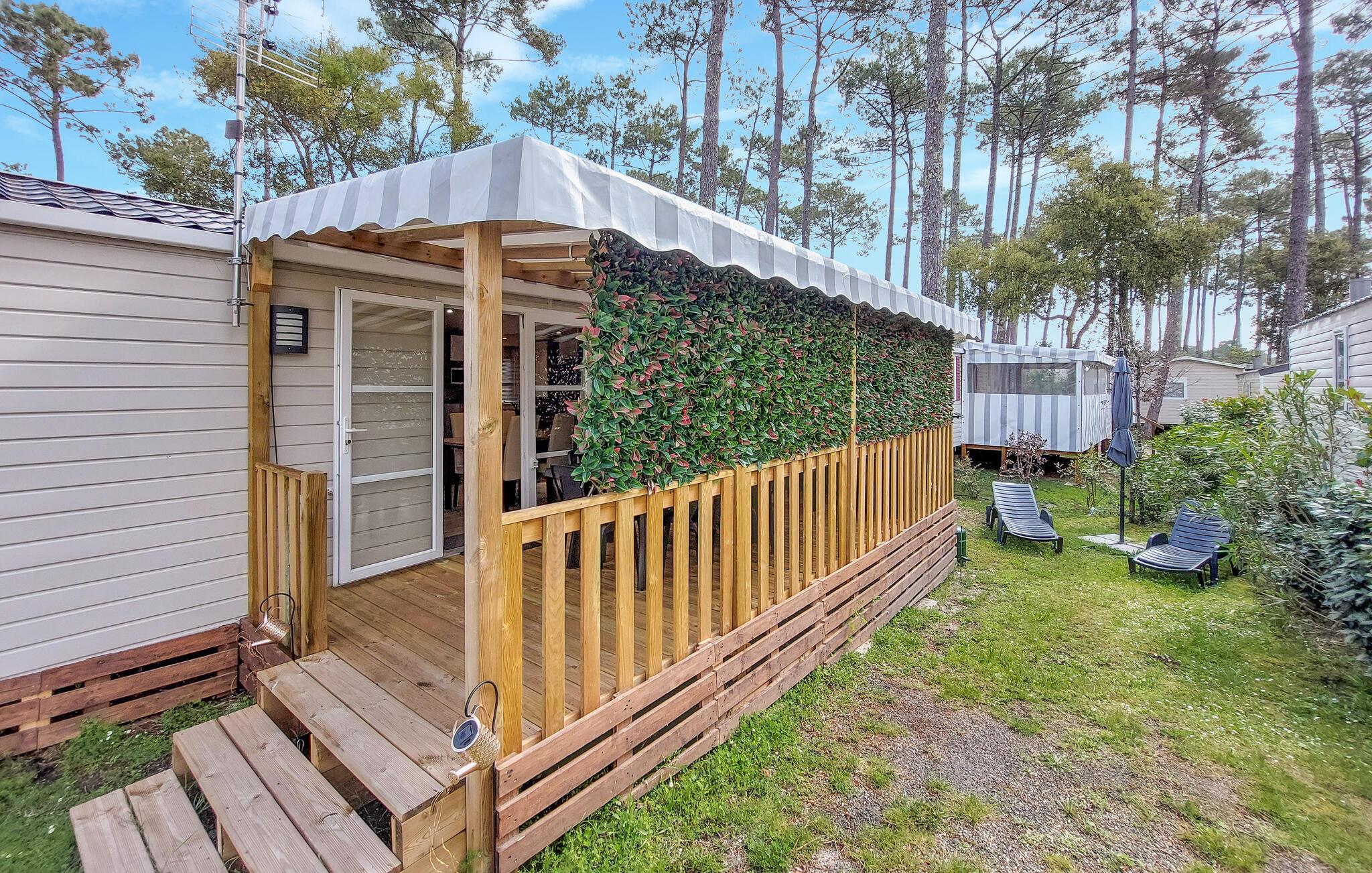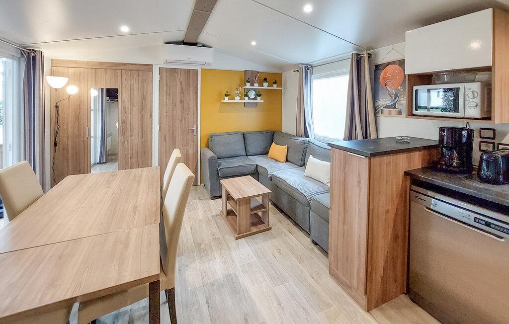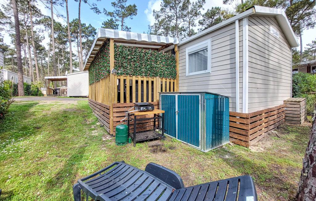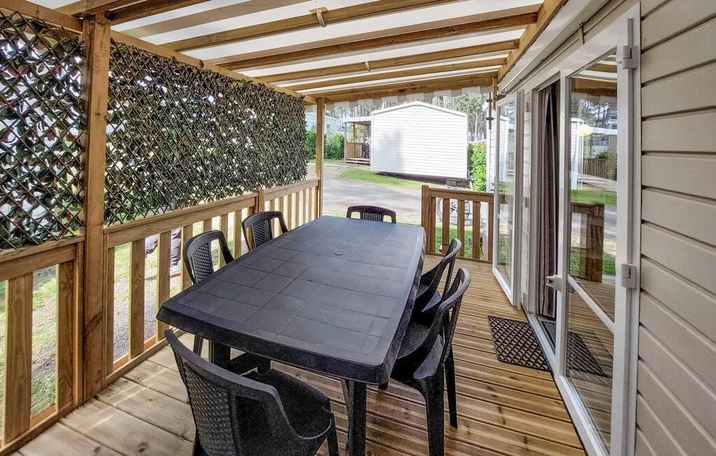Den overdækkede terrasse er det ideelle sted at begynde dagene med en kop kaffe eller slappe af om aftenen med et glas vin. En plancha lægger op til at tilberede lækre måltider udendørs. I bor på en campingplads, her finder I en restaurant, en bar, en petanquebane, en tennisbane, en købmand og meget mere. Forskellige shows og aktiviteter finder sted hver aften i den store eventhal. Campingpladsen har to opvarmede pools og et vandfaldsområde for børn og voksne.