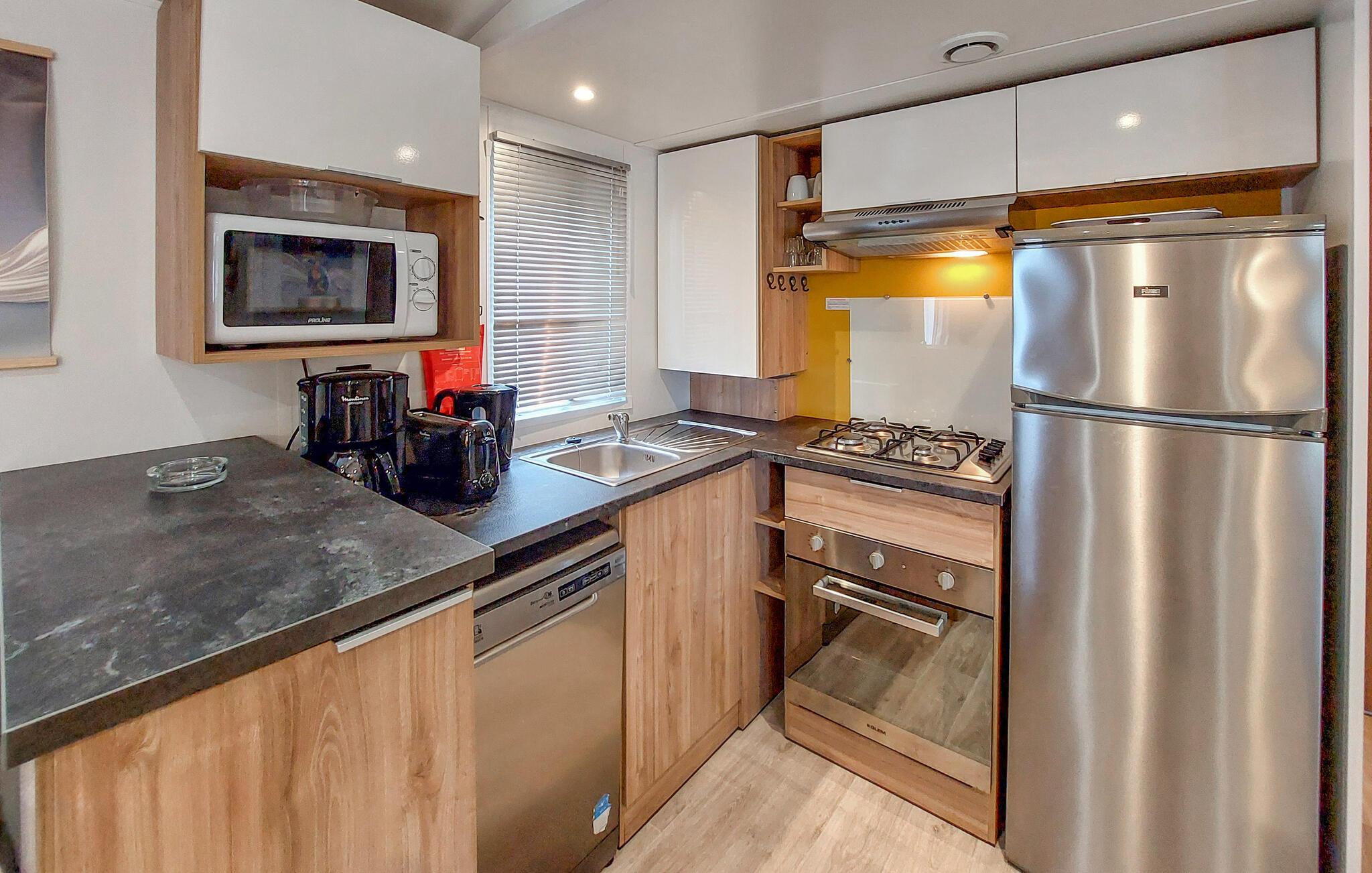 Mobilhomet byder jer velkommen med sin hyggelige indretning og imødekommende atmosfære. Det praktiske interiør er veludstyret og har alt, hvad I skal bruge for et behageligt ophold. I kan føle jer godt tilpas her med familien og nyde tiden sammen.
