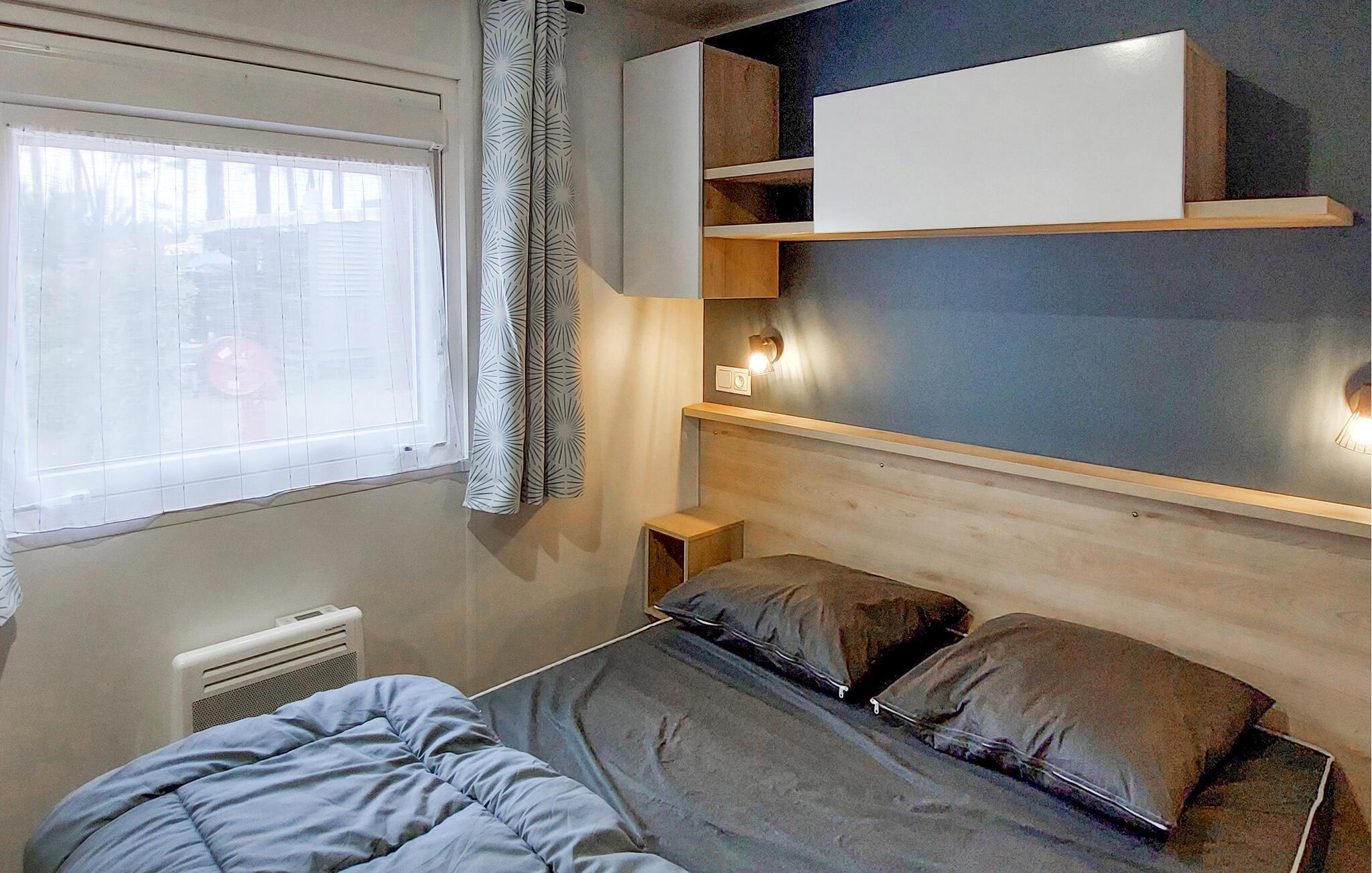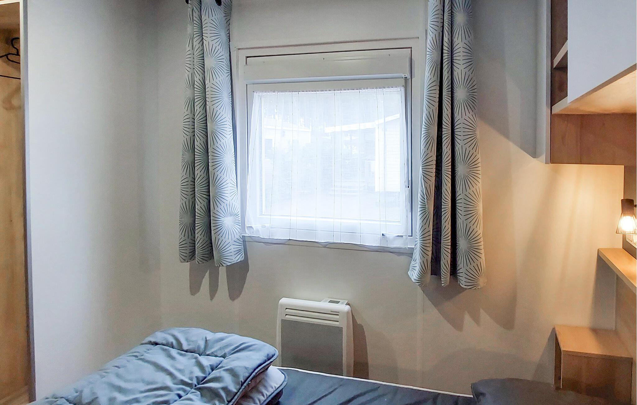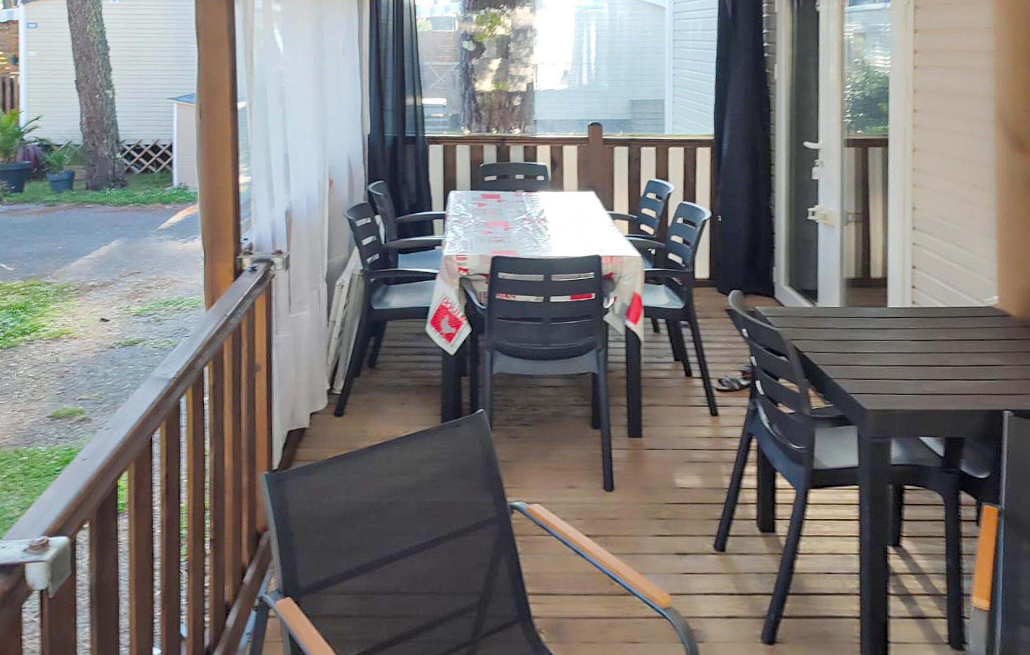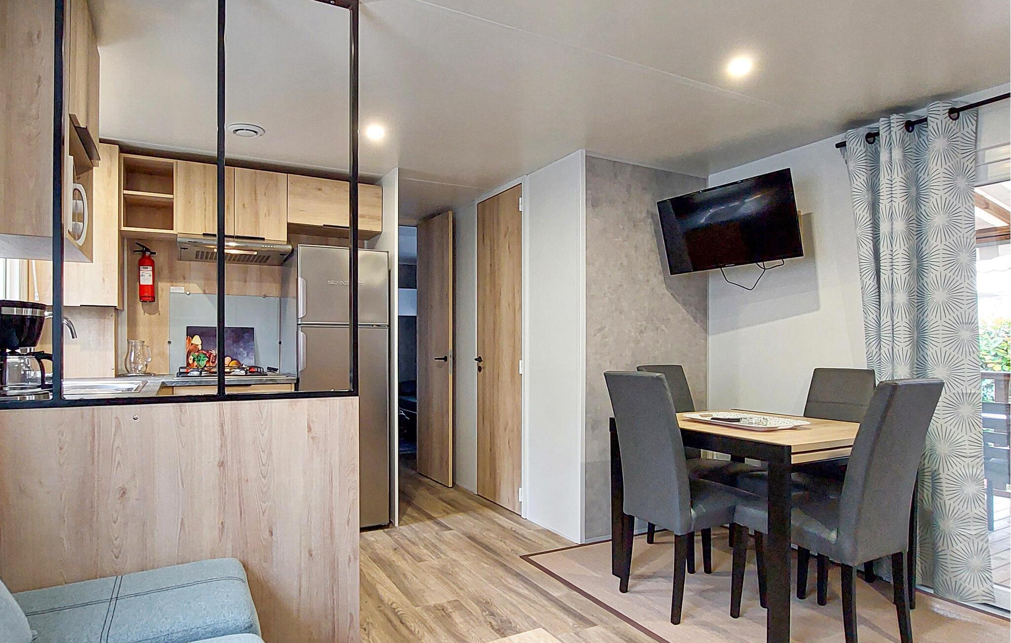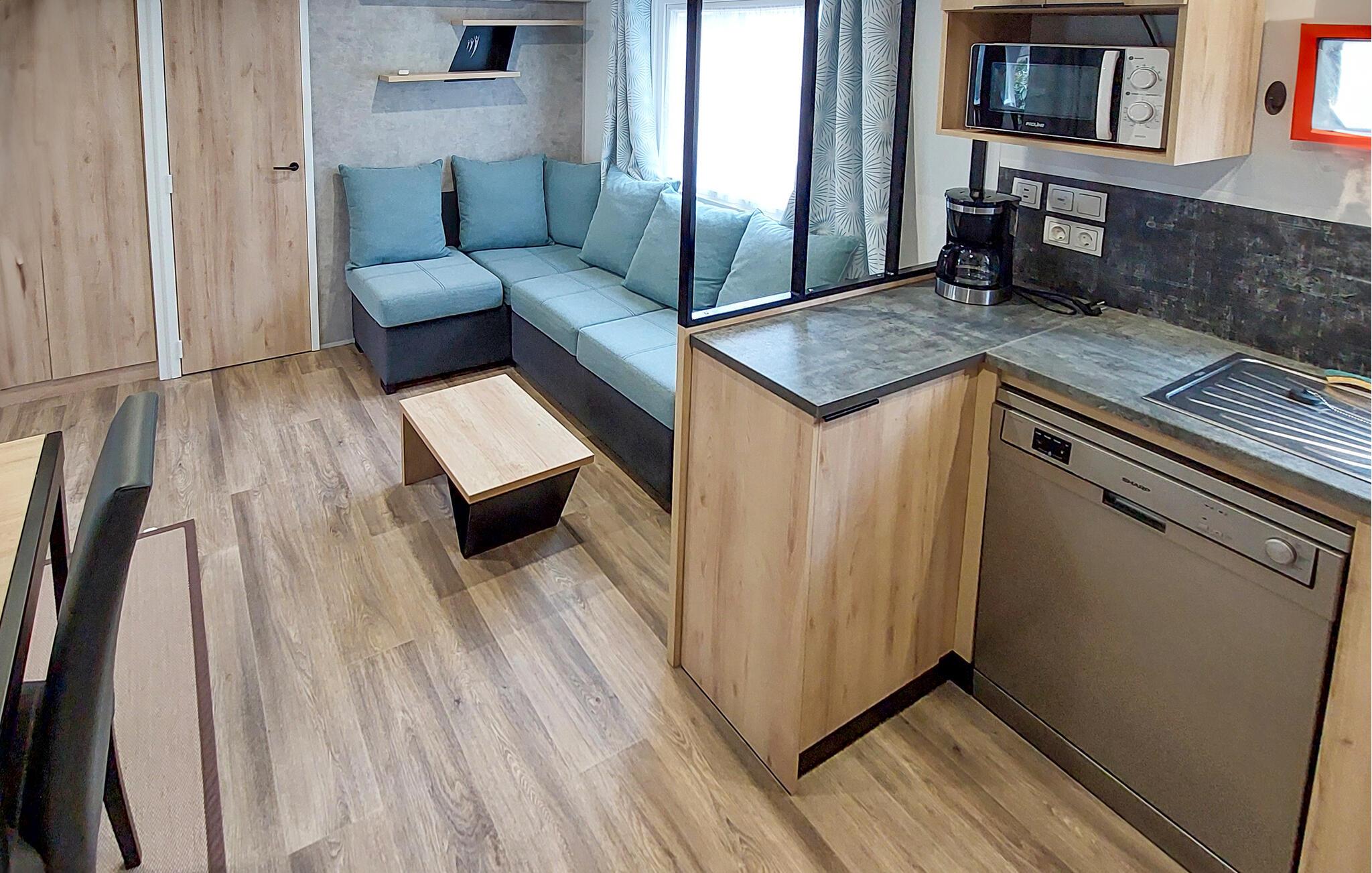 Tilbring jeres næste ferie i dette mobilhome på en velholdt campingplads. Glæd jer til et behageligt ophold med praktiske ekstrafunktioner og et bredt udvalg af rekreative muligheder på stedet. Find jer til rette i den rummelige hjørnesofa i opholdsstuen eller nyd måltiderne sammen ved spisebordet. Det åbne køkken er funktionelt udstyret og giver jer mulighed for at tilberede enkle måltider.