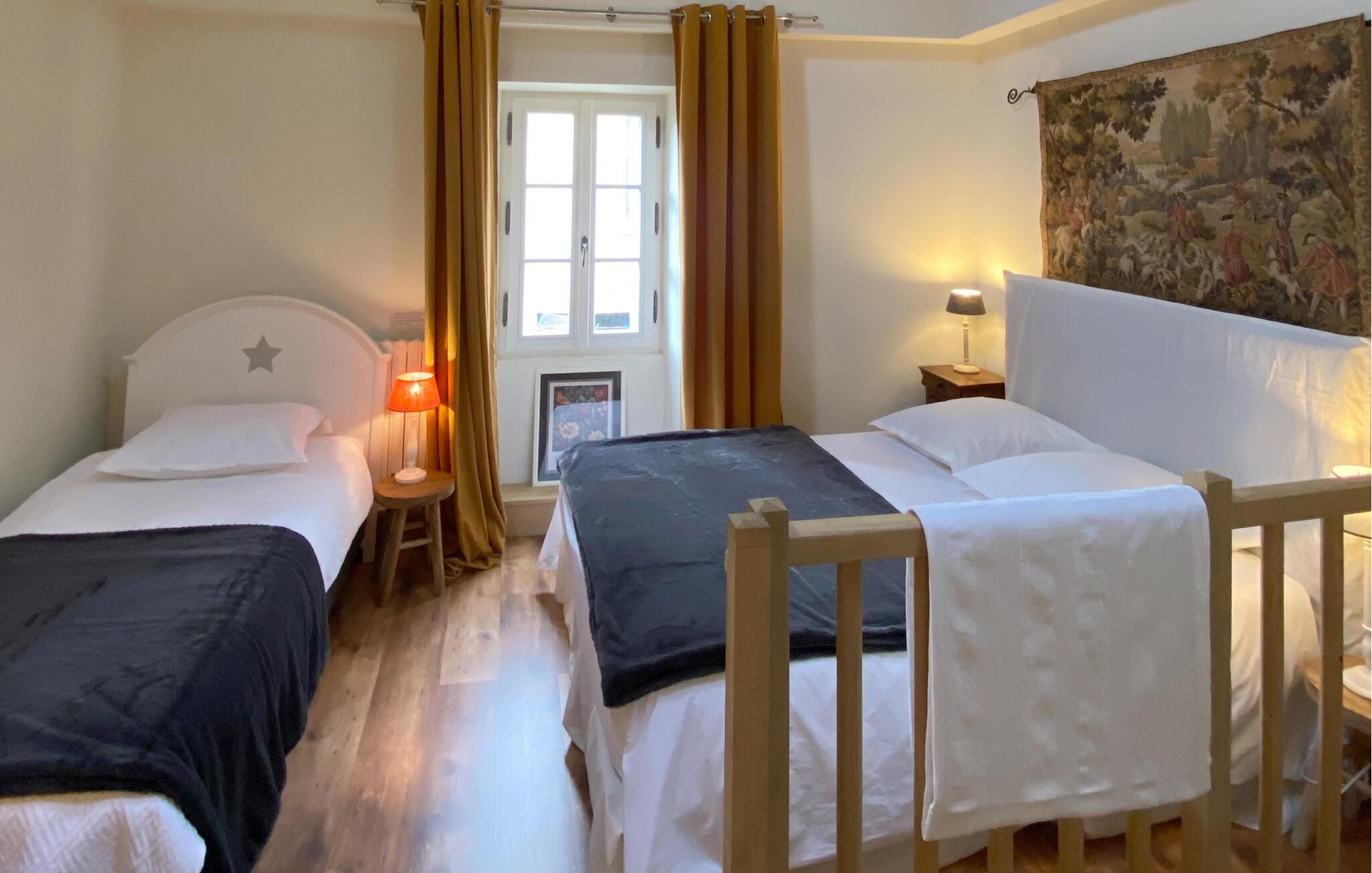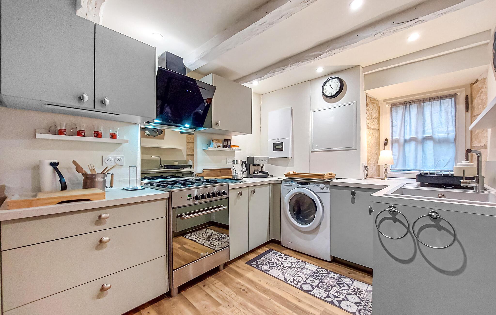 Dette hus er perfekt, hvis I søger afslapning i maleriske landlige omgivelser. Det harhistorisk charme, hvor træbjælker, natursten og smukke møbler skaber en hyggelig atmosfære. Nyd en aromatisk kaffe, deltag i en hyggelig samtale eller tilbered lækre måltider til hele familien i det veludstyrede køkken.