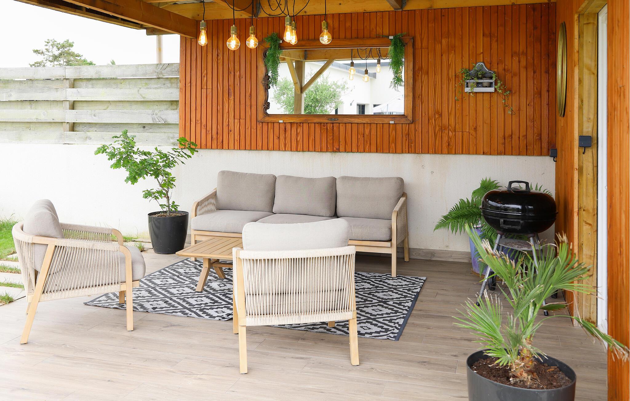 Den solrige terrasse giver jer de perfekte rammer til dagens måltider sammen og afslapning på liggestolene, mens børnene løber og leger med jeres hund på græsplænen.