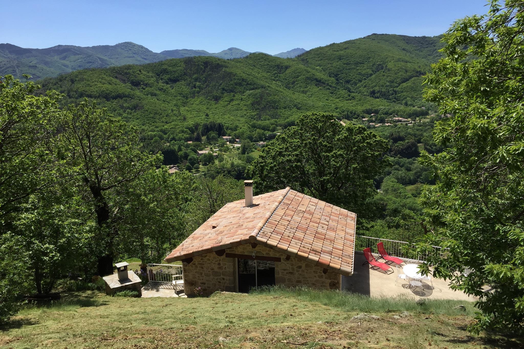 Dette fritliggende sommerhus er bygget op ad en bakke på et smukt sted på en blind vej, og ligger meget roligt. Du har adgang til en stor terrasse med solskygge, havemøbler, to liggestole og en stengrill. Her kan du ikke få nok af den vidunderlige udsigt. Haven omkring huset skråner ned stejlt og er omgivet af skyggeforbudte kastanjetræer. Huset ligger ca. 2 km fra St. Pierre-de-Colombier, i det grønne bjergrige område nord for Aubenas (20 km). Det er berømt for sin hårde jord, store skove, floder og smukke bjerge. De to højeste er Mont Mézensac (1753 m, 50 km væk) og den slående Mont Gerbier de Jonc (42 km), hvor Frankrigs mest berømte flod, Loire, brøder op. For at forblive med naturens smukke kan besøge de høje vandfald af Ray-Pic (16 km). Syd for Aubenas ligger de middelalderlige byer Vogüé (30 km), Largentière (30 km), Balazuc (35 km), Ruoms (35 km) og Vallon-Pont-d-buen (50 km), hvor Gorges de l'Ardèche start (grotter, visninger).