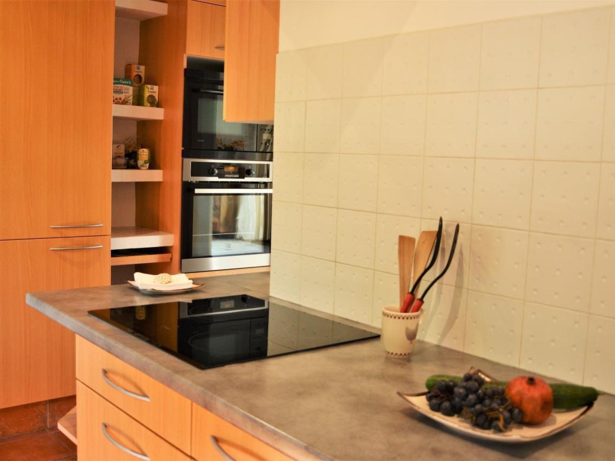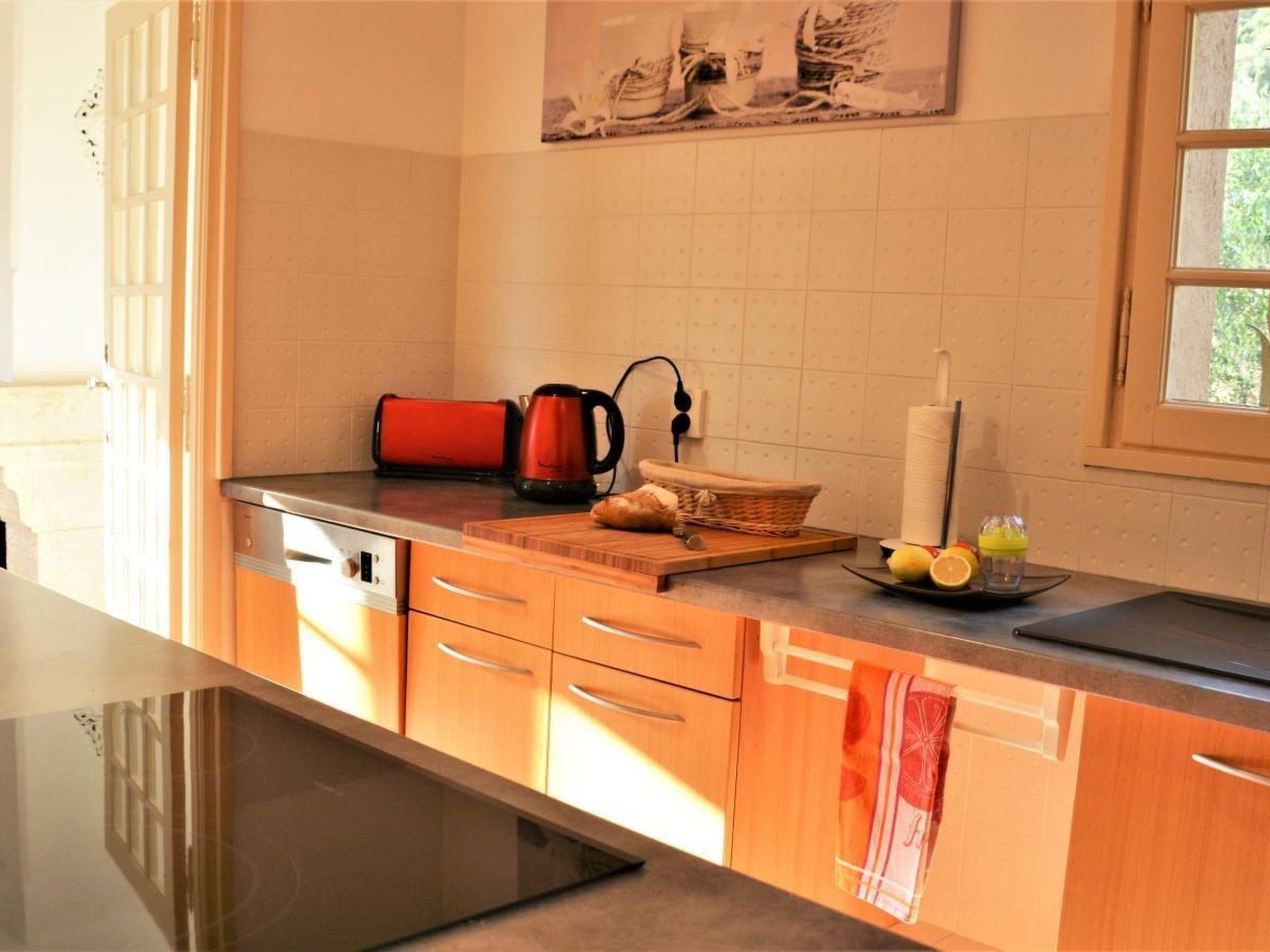On the upper floor is the fully equipped kitchen with dishwasher, refrigerator, oven, microwave, ceramic glass fireplace, automatic coffee maker (Nespresso) and a toaster. The kitchen opens onto a covered terrace with magnificent views of the Massif de l'Esterel. The mountains are known for their impressive "porphyry" red rocks.