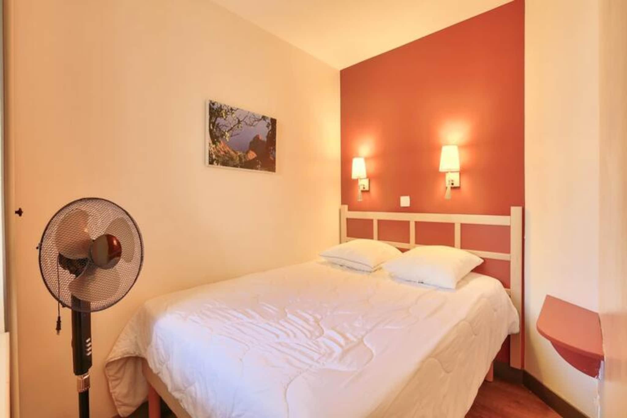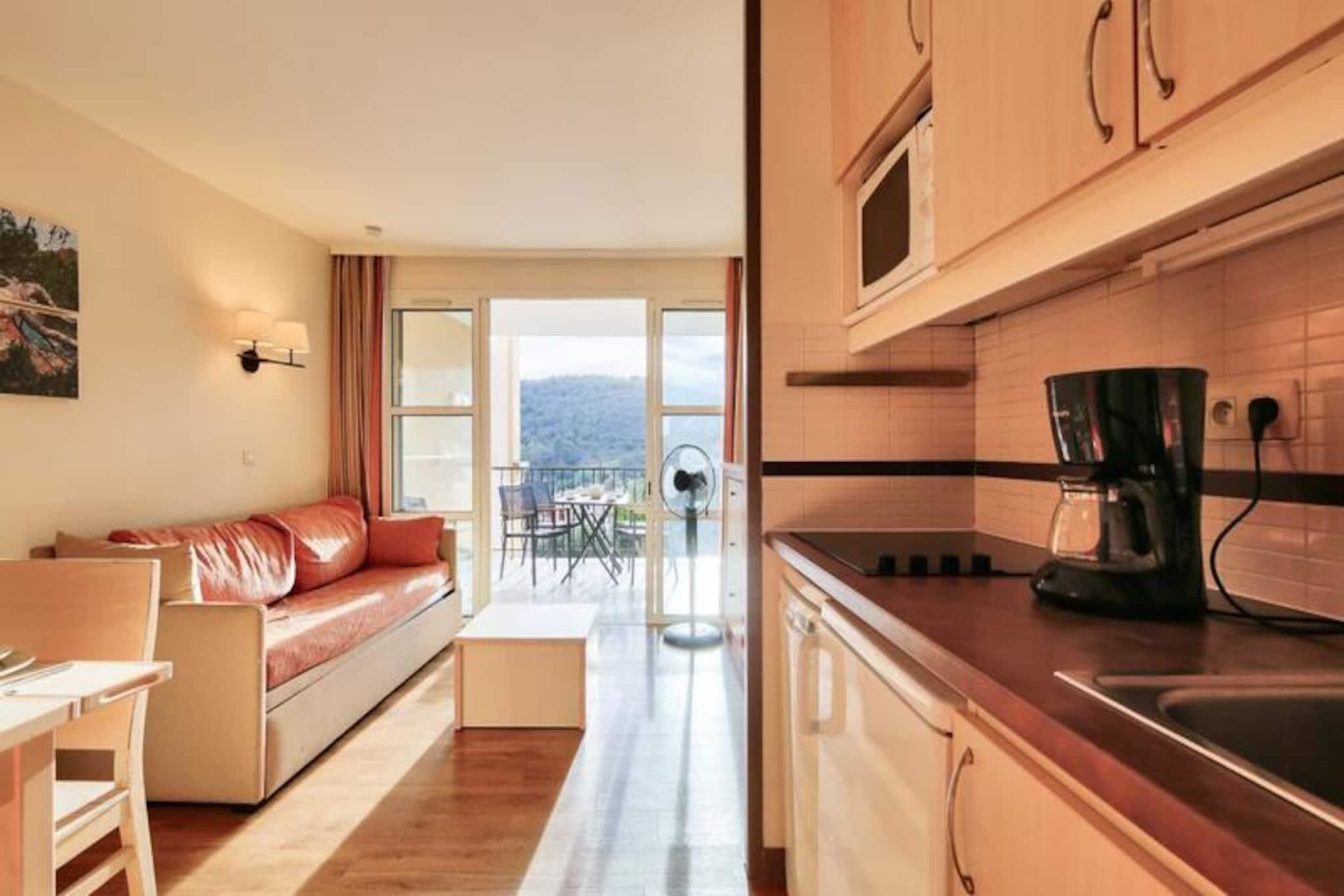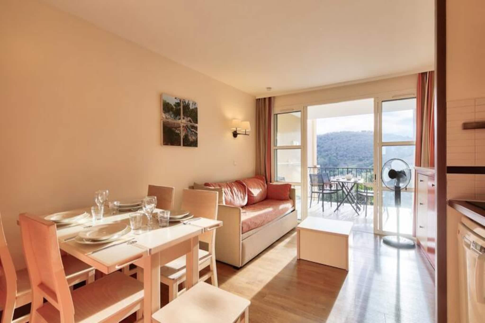 This charming 28 m² apartment accommodates up to 4 people and features a living room with a sofa bed, trundle bed, and a double bedroom. The unit is air-conditioned, pet-friendly (with additional charges), and includes a dedicated outdoor parking space. Wi-Fi access is available for an extra fee, and a mandatory cleaning service is provided at the end of your stay. Additional services, like hot tubs, are available at the Esterel Forme Center within the village for a surcharge. Located just 500 meters from the sea, this apartment is set within a lively village offering bars, shops, and restaurants. Guests can easily access nearby attractions, including the beautiful beaches of Agay Bay and Dramont Beach, just a short train ride away. For families, there is a children's club and a teen club offering age-appropriate activities, making it ideal for a family vacation. The area also boasts a rich variety of leisure activities, including water sports and hiking in the Estérel Massif. The apartment includes a fully equipped American-style kitchen with a dining table, perfect for preparing meals. The bathroom has a bathtub with an electric towel dryer, and there is a separate toilet for added convenience. Enjoy the peaceful views of the forest from the covered terrace, an ideal spot to relax after a day of exploring the village or the surrounding region.