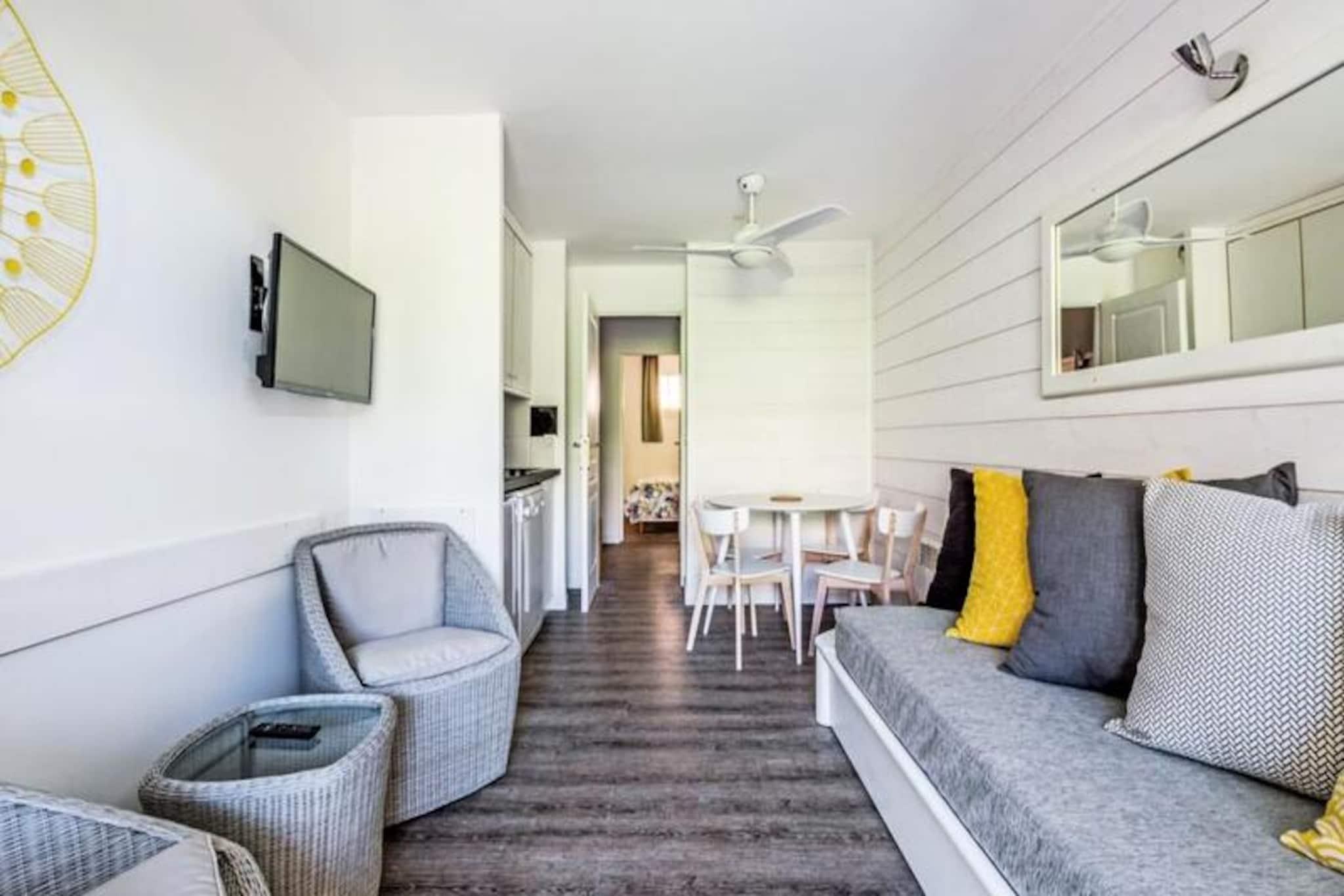 Denne charmerende lejlighed på 28 m² tilbyder et hyggeligt opholdsrum med en sovesofa og et kabineområde med to sammenklappelige køjesenge. Soveværelset har en komfortabel dobbeltseng, og lejligheden er kæledyrsvenlig, hvilket sikrer et indbydende miljø for dine lodne venner. Nyd en privat møbleret terrasse med en have og golfudsigt sammen med moderne bekvemmeligheder såsom et tv, underjordisk parkering og rigelig opbevaringsplads til din bekvemmelighed. Beliggende kun 1 km fra Agay Bay og Dramont Beach, er denne lejlighed perfekt beliggende for strandelskere. Området byder på en række nærliggende attraktioner, herunder lokale caféer, butikker og markeder. Det Lille Tog, der kører fra 08.04 til 30.09, giver nem adgang til stranden, hvilket gør det ideelt for dem, der søger en afslappende strandferie. Boligen omfatter også en børneklub og en teenageklub, med forskellige aktiviteter for at holde unge gæster underholdt. Lejligheden har et veludstyret køkkenområde åbent til stuen, perfekt til at tilberede måltider. Det moderne brusebadeværelse er udstyret med bruseniche og separat toilet. Yderligere faciliteter inkluderer en møbleret terrasse med bord og stole, en liggestol og en valgfri slutrengøring, hvilket giver ekstra komfort og fleksibilitet under dit ophold.